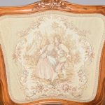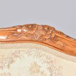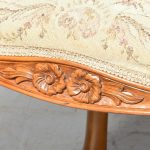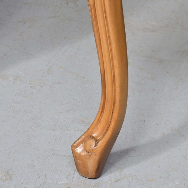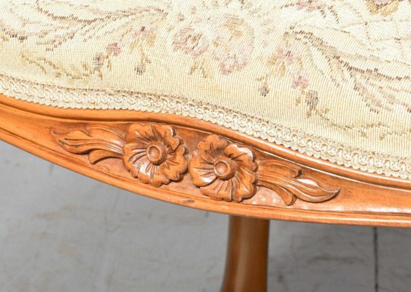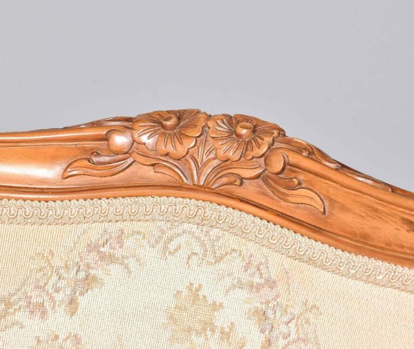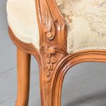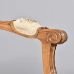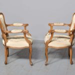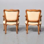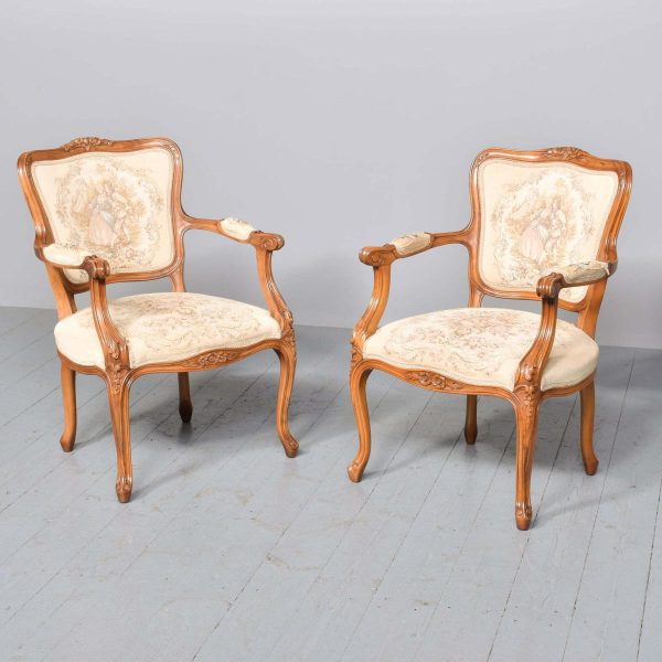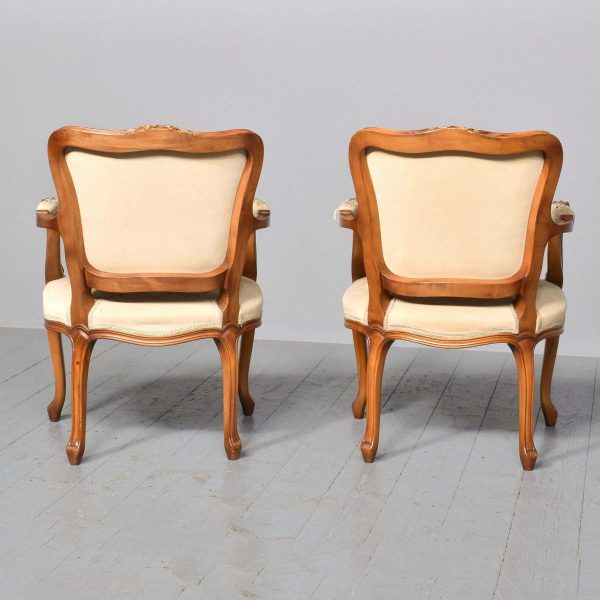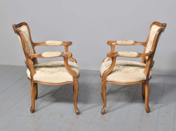 Circa 1950. Pair of Louis XV style open beech armchairs (Fauteuils). The foliate carved top rails over upholstered panelled backs and shaped, part-upholstered arms with fluted scrolls extending down as carved cabriole legs in front. Outswept rear supports. Needs recovering (underlying upholstery in good condition).