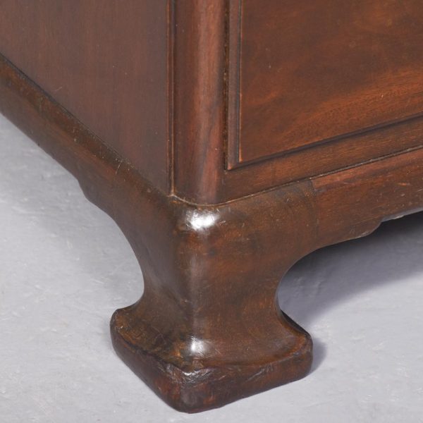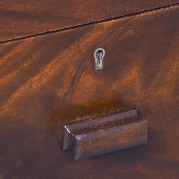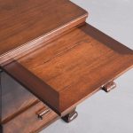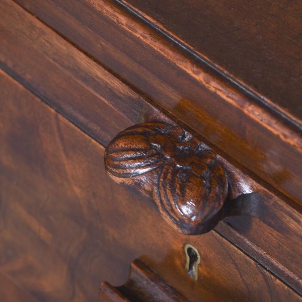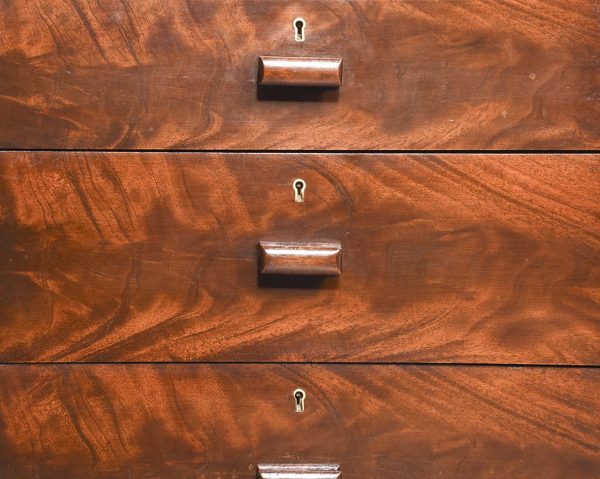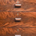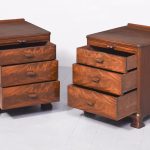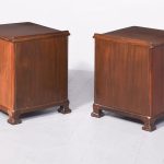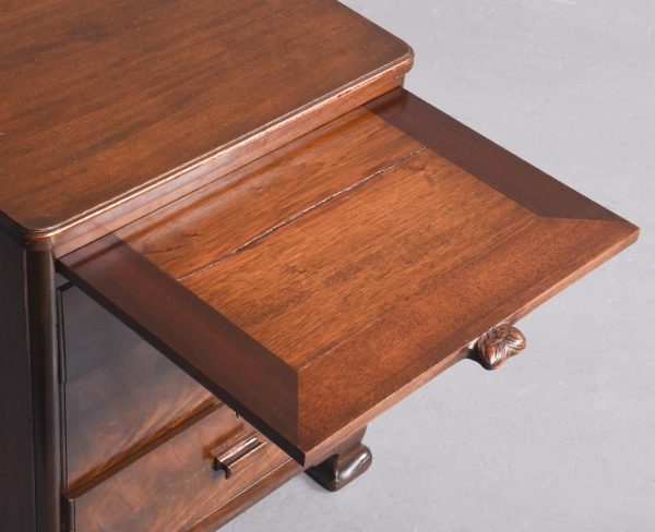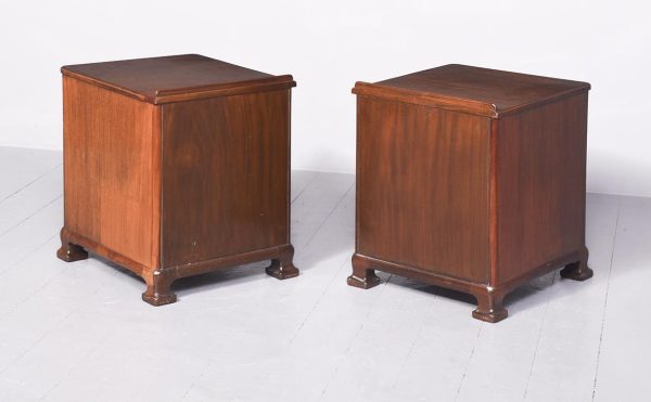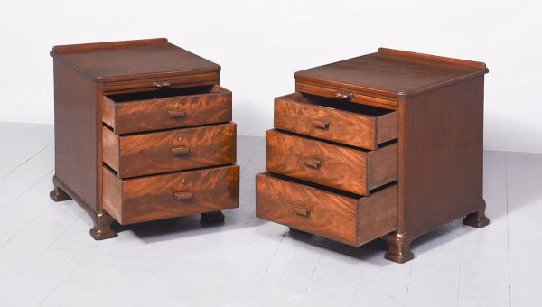 Circa 1920. A quality pair of mahogany bedside cabinets by ‘Whytock & Reid of Edinburgh’, the rectangular cabinets with rounded front and simple moulded fore-edge with a small ledge to the back, beneath the top there’s a pull out slide with foliate carved handle beneath this is a bank of 3 graduating full length drawers with flame mahogany facing and simple wood handles, the top drawer is stamped, ‘Whytock & Reid of Edinburgh’ the base has a curved frieze and the chests rest on classic stylish feet