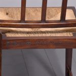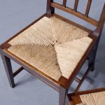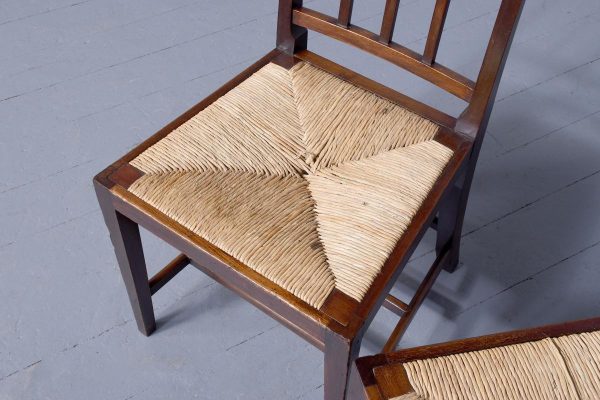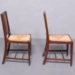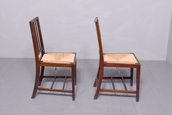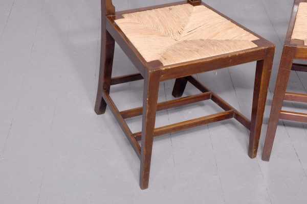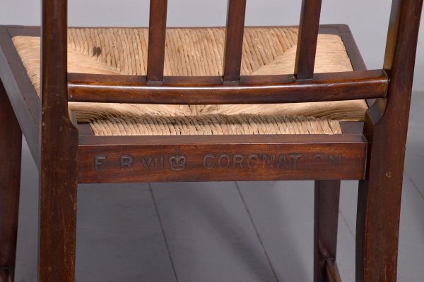 A pair of mahogany chairs from King Edward VII coronation, which was held in August 1902, the pair with simple top rail, spar back and drop in marram grass seat with simple seat rails, resting on four square legs, back legs slightly splayed, the legs braced by conforming stretchers, the back of each chair has a stamp on it ‘ERV11, a crown and coronation’ with one chair with another plaque; ‘Harold 198’ In excellent condition, sturdy with good colour and style.