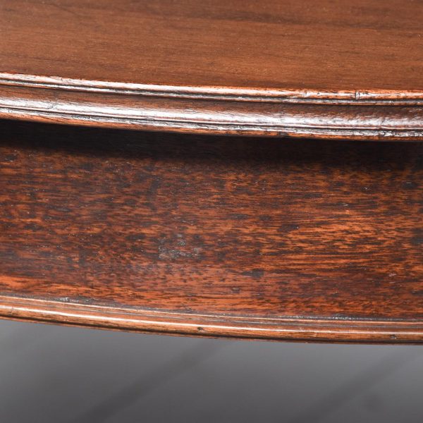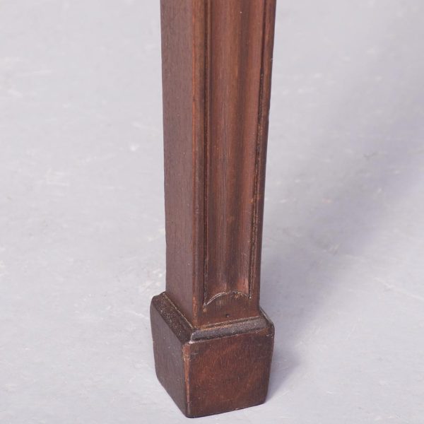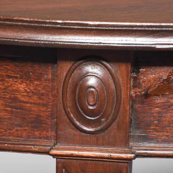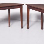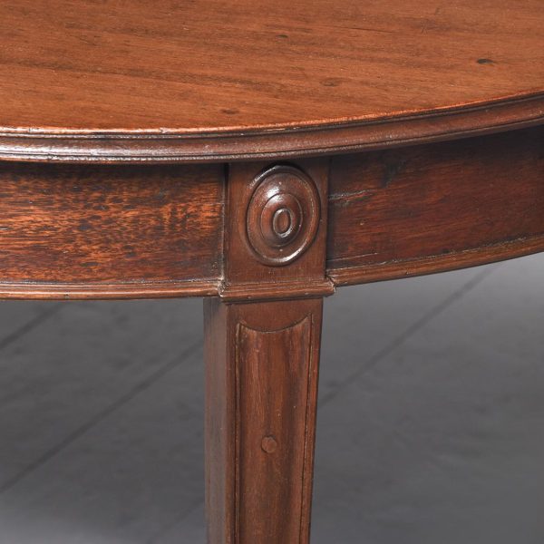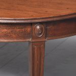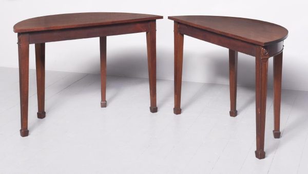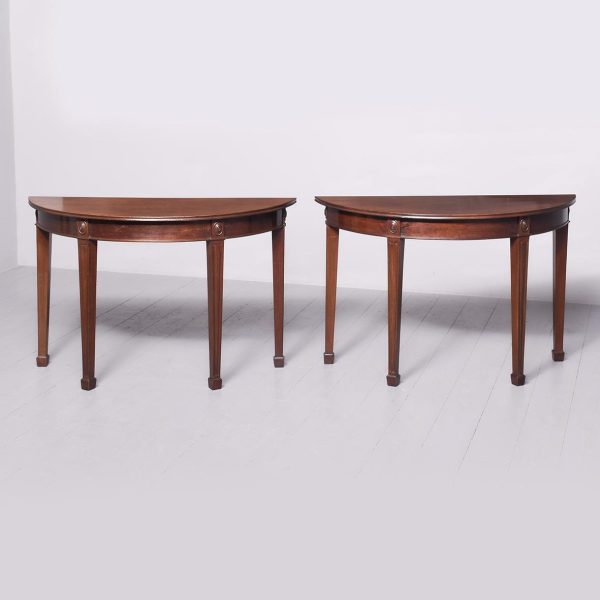 Circa 1800 and later. A stylish neat size pair of mahogany demi lune side tables, tops with figured mahogany with an elegant moulded fore-edge and beaded polished frieze, resting on four square tapering reeded and convex legs each headed by a stylish oval patre, finishing on four squat spade feet.