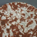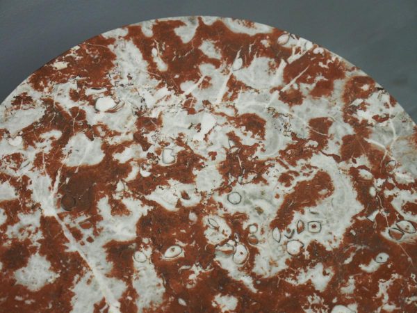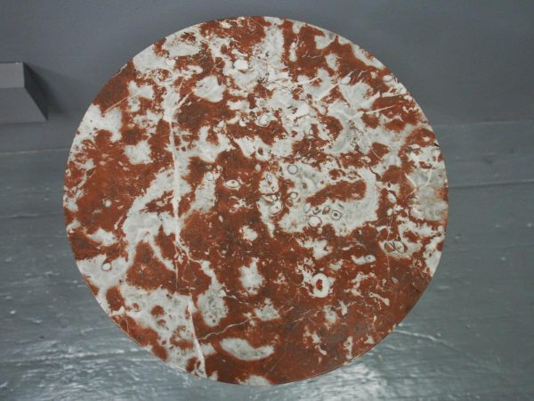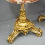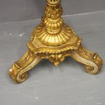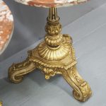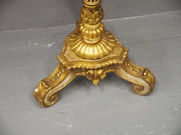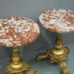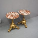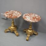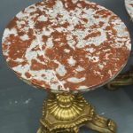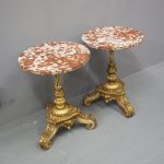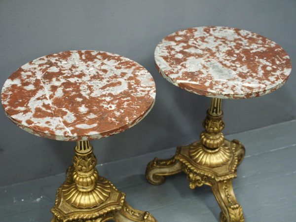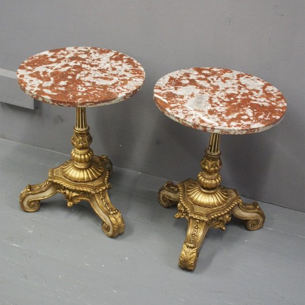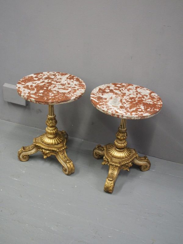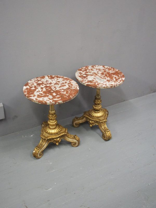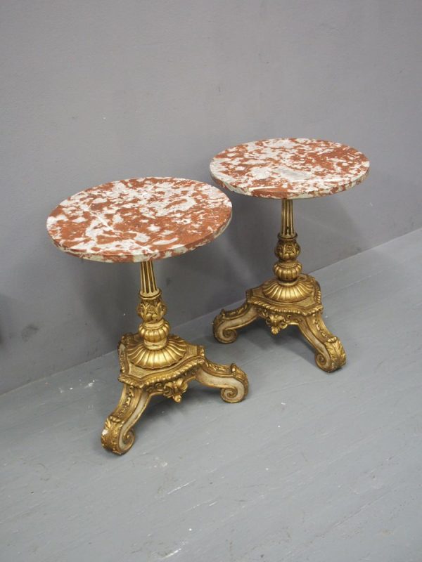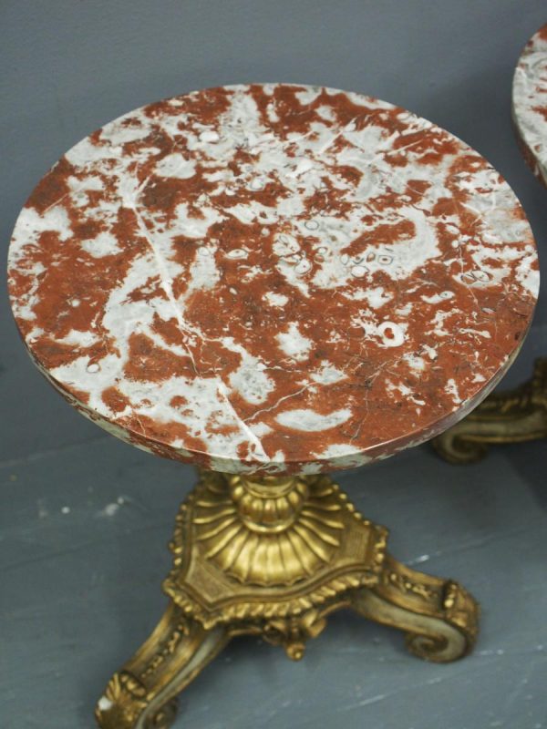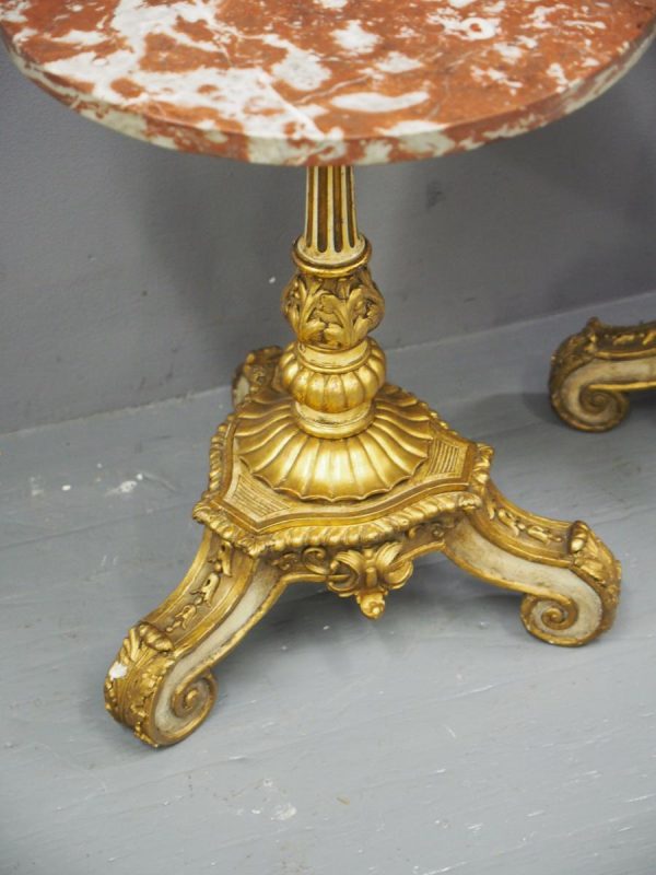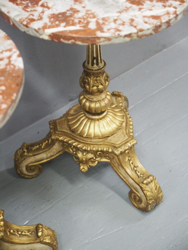 Circa 1880 and later, pair of marble top circular occasional tables. With pink variegated marble tops standing on gilded and painted bases which are profusely carved in wood and gesso. The stems are tapered, fluted and bulbous with foliate sections. Finishing on 3 squat gilded and painted cabriole legs with foliate carving between each of the legs.