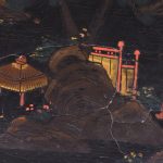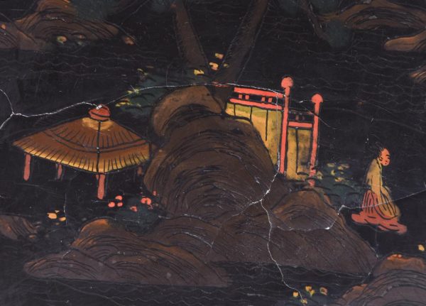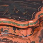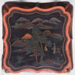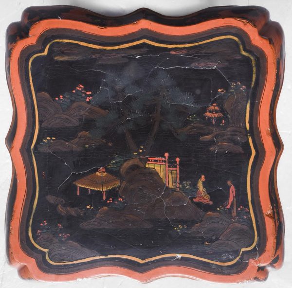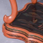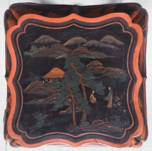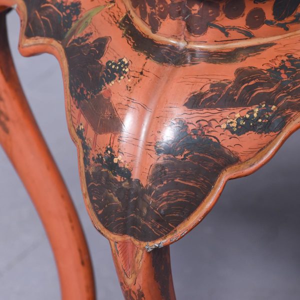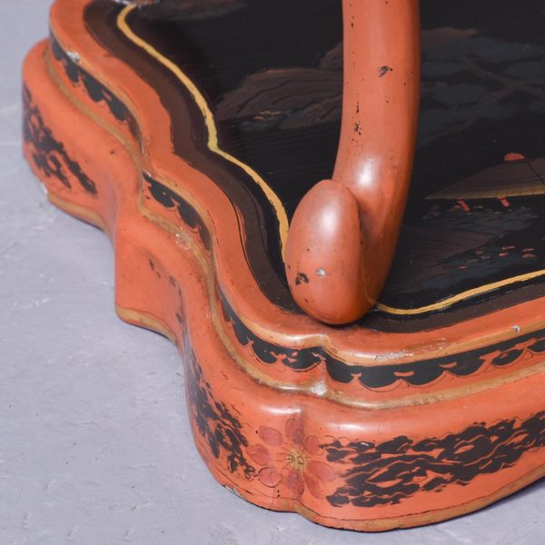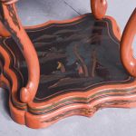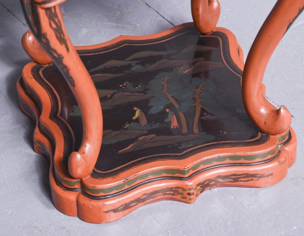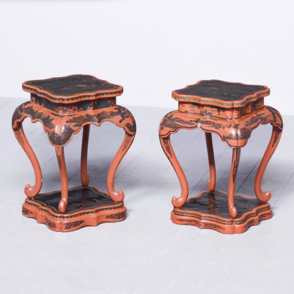 Circa 1900. A stylish pair of Meiji period two tier red lacquered occasional table. The shaped tops painted with garden scenes with figures and buildings. The painted fore edge and frieze with stylish Japanese characteristics, the tables have four elegant cabriole legs, the tops of the legs forming the frieze of the table with further painting, finishing on a curled foot which rests on a platform base with similar figures to the top. The whole piece resting on an enclosed shaped plinth.