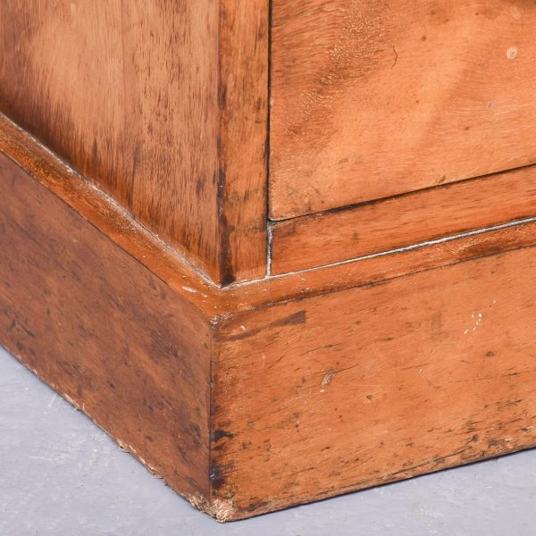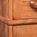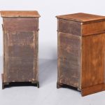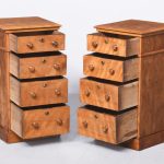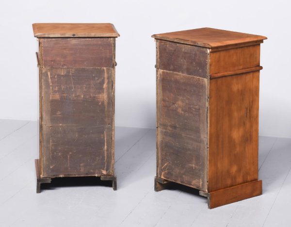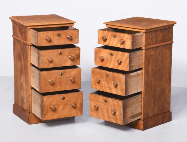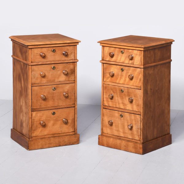 Circa 1860. Pair of mid-Victorian blonde walnut chest of drawers/bedside lockers. The rectangular tops in nicely figured light walnut with canted edges above four graduated drawers with original finely turned knobs and brass escutcheons All sitting on enclosed plinth bases. In excellent order.