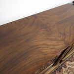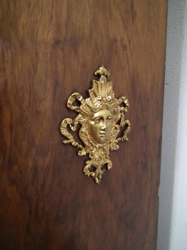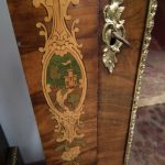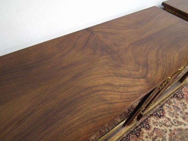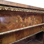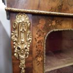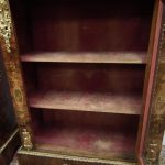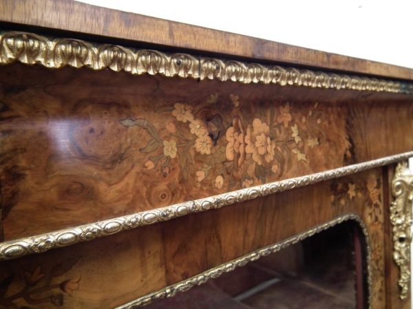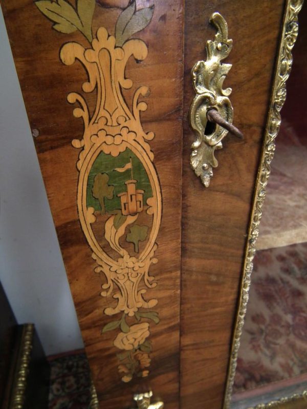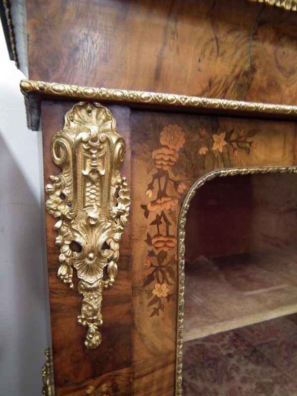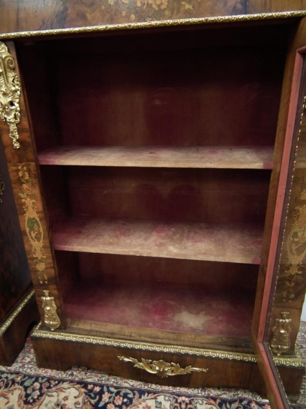 Circa 1860, pair of mid Victorian burr walnut pier cabinets. The cabinets have a rectangular top which is quarter veneered in walnut, below the top is a simple fore edge and an ormolu mounted beading. The frieze between the top edge and the door is shaped and has a floral marquetry panel in the centre. Above the door is a cast brass beading. There are ormolu mounts on the top and bottom and a simple glazed door which is also brass bound. There is floral marquetry on the top corners of the door, as on the fore edges. The base has a fine brass bound beading and below this is a central motif. The whole piece stands on an almost enclosed plinth with shaped front and sides. The cabinets have mounts on both gables also. The insides are lined in velvet with two shelves. The cabinets are one left handed and one right handed. Excellent colour and condition.