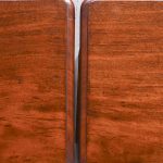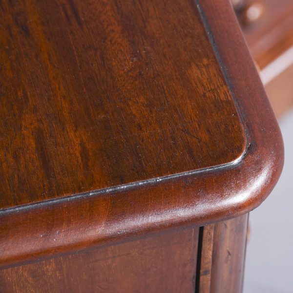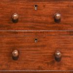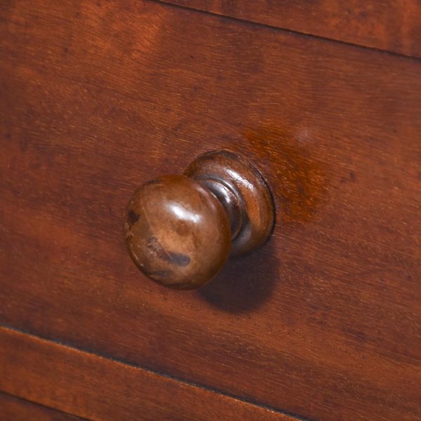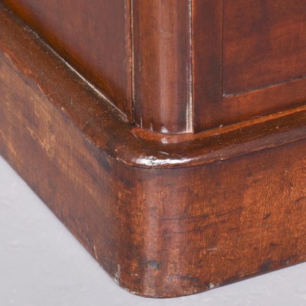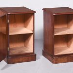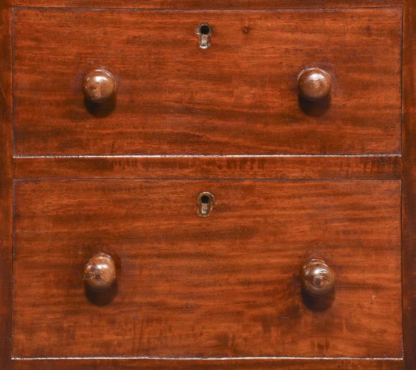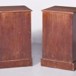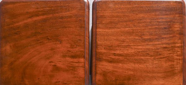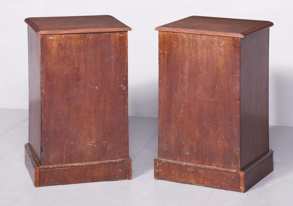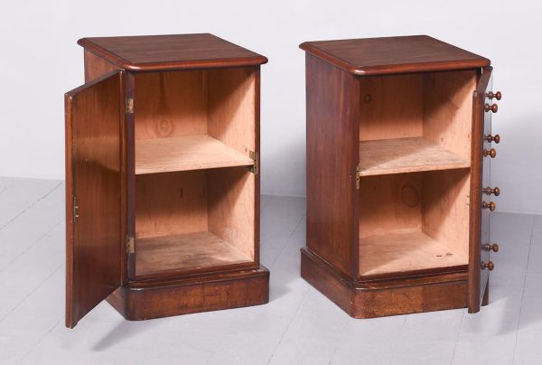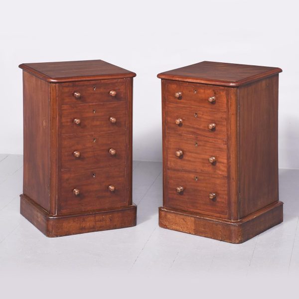 Circa 1860. Pair of mid-Victorian neat-size figured mahogany bedside lockers. The rectangular tops in figured mahogany with moulded fore-edges above four faux (dummy) drawers with original turned bun handles acting as a door and opening to a shelved cupboard. Supported on enclosed plinth bases.