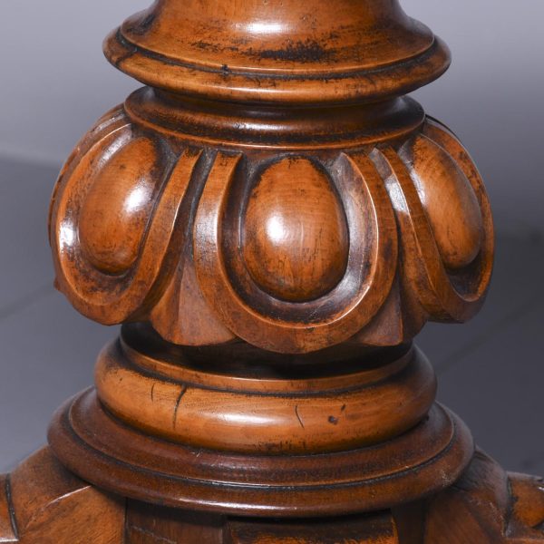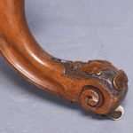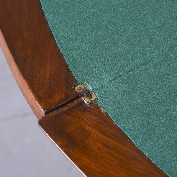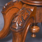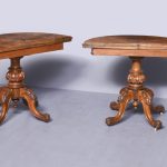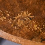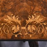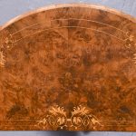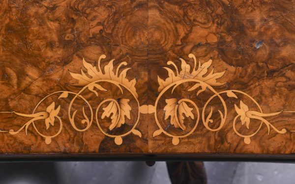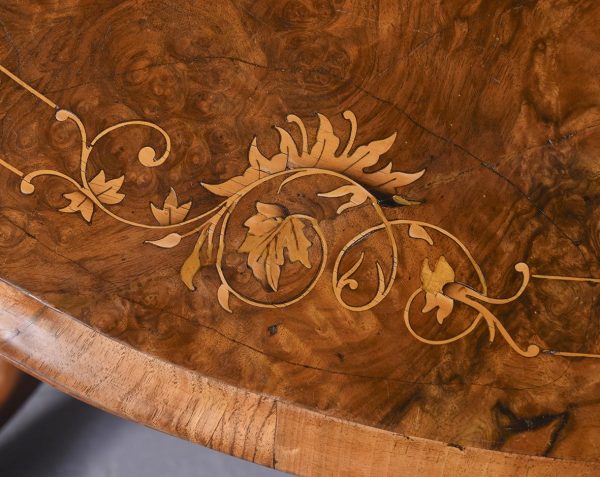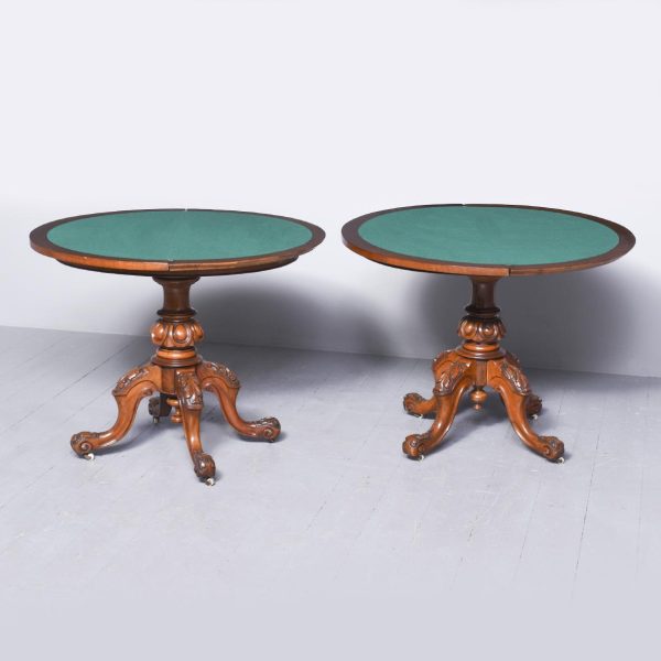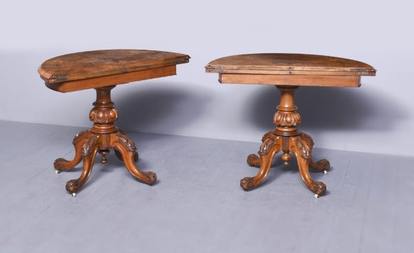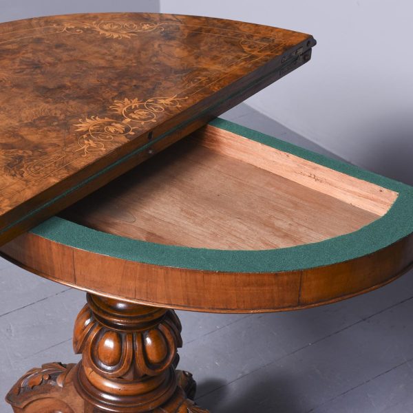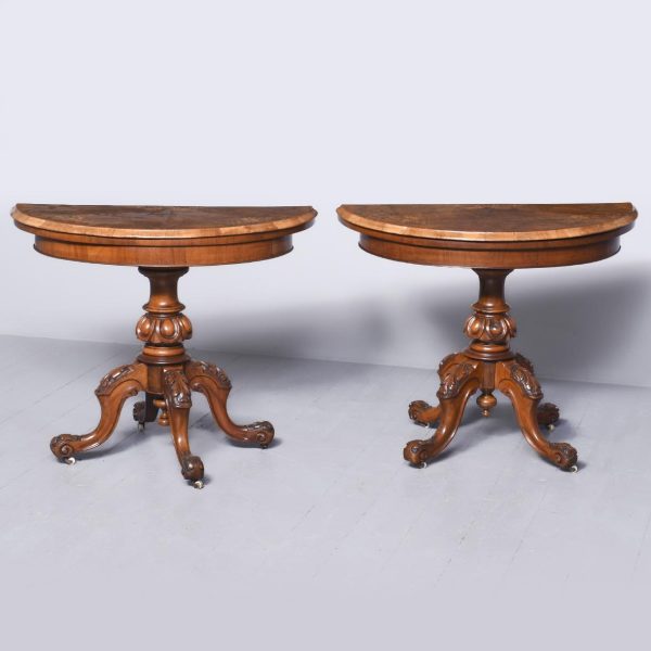 Circa 1870. A pair of mid Victorian burr walnut and inlaid D shaped fold over card tables. The tops with fine book matched burr walnut, with floral and string marquetry throughout, with a deep moulded fore edge, the frieze follows the shape of the tops, which are hinged and open to reveal felt lined interiors with broad cross bandings. Resting on a turned and carved stem, with a downward facing finial in the center, issuing four hipped cabriole legs with foliate carving on knees, scrolling on the inside and finishing on a well carved toe, with original white porcelain castors beneath.
