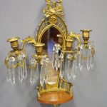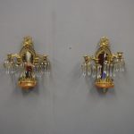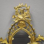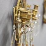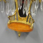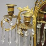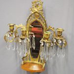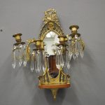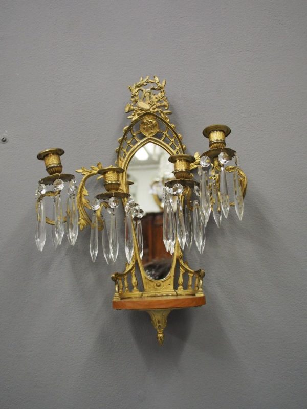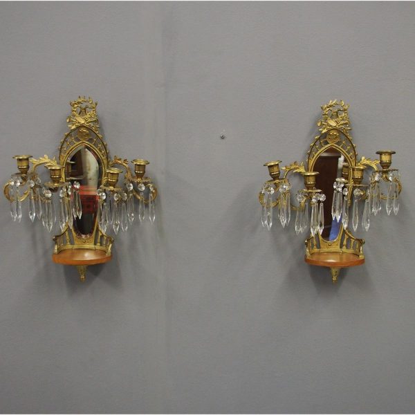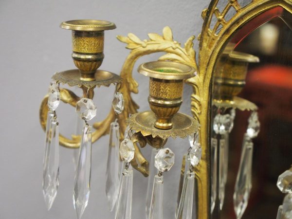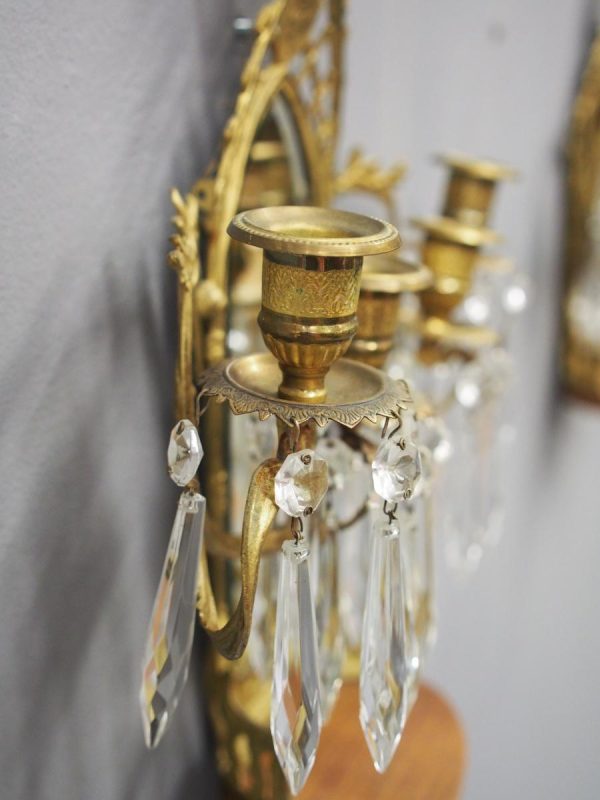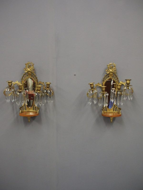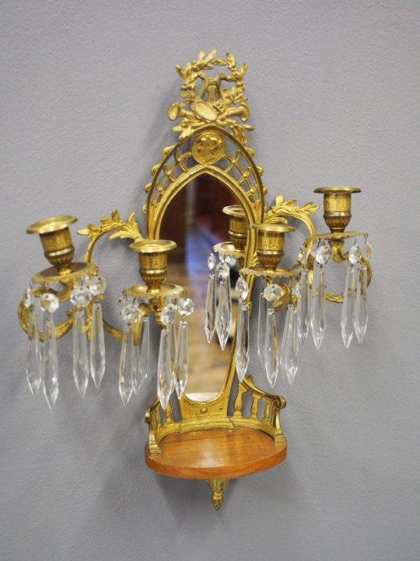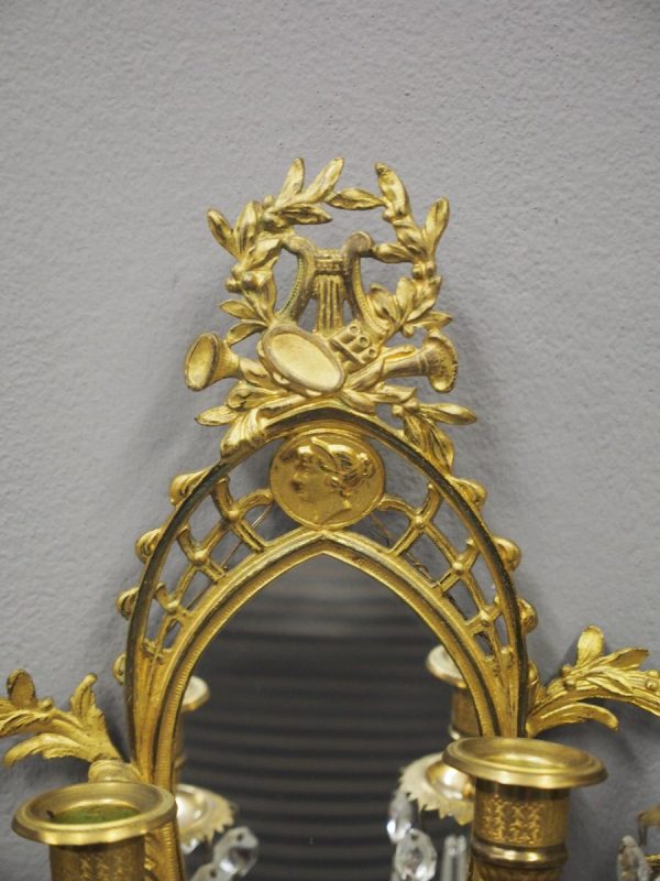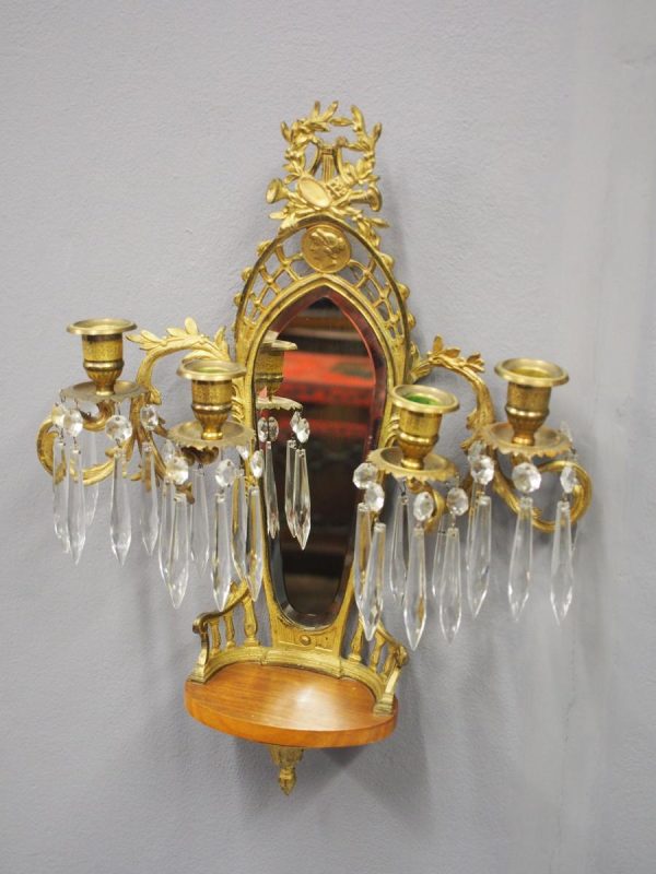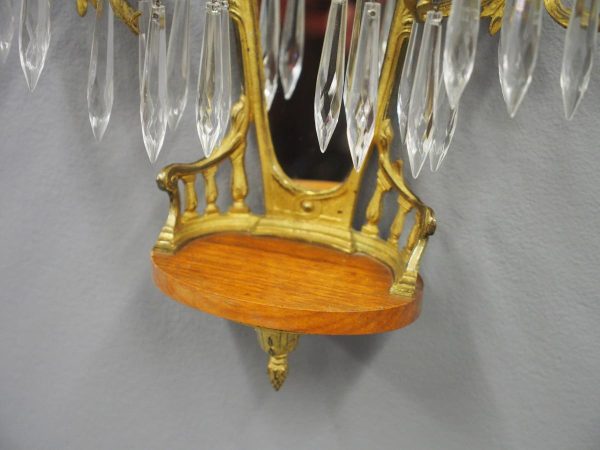 Circa 1880, pair of mirrored, ormolu (gilded brass) and cut crystal wall sconces. The open rococo design backplate with musical instrument and medallion decorations are over bevelled edge mirrors. There are 3 three-branch candelabra on shaped rococo supports, above open, foliate design drip trays and small ormolu mounted mahogany shelves.