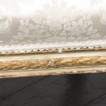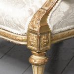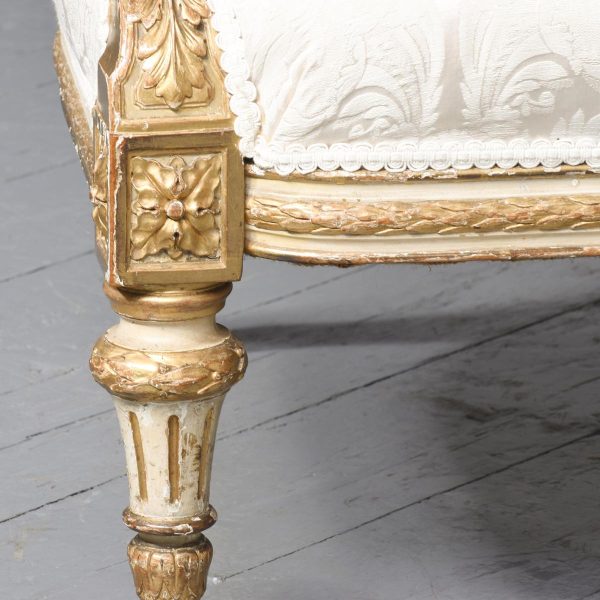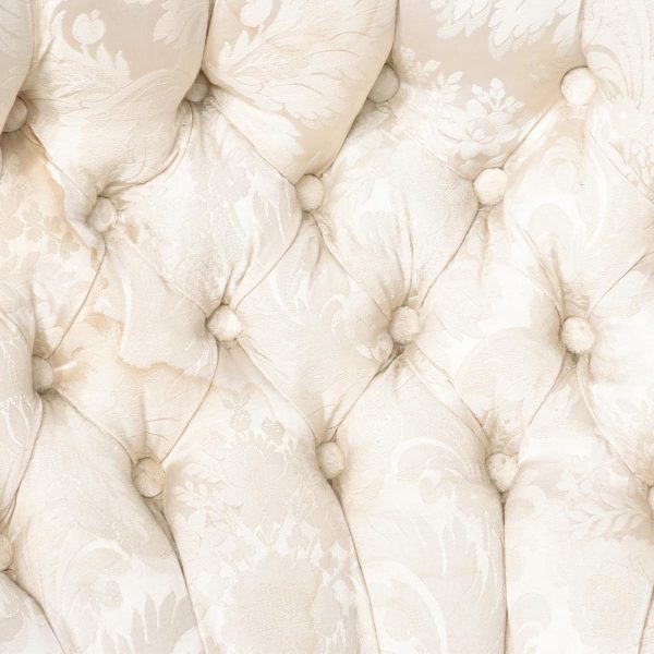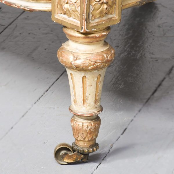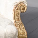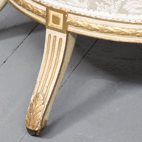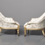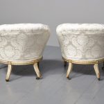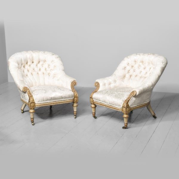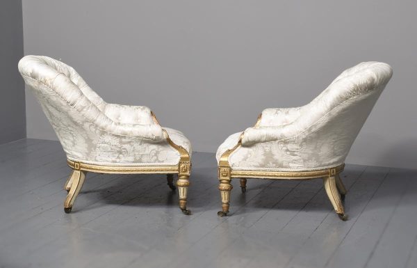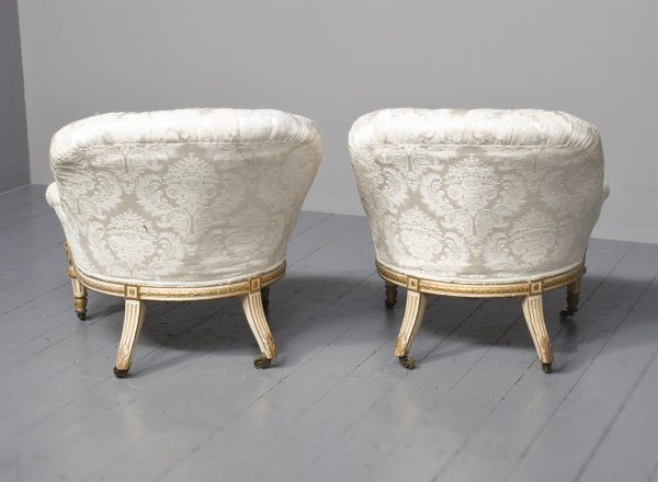 Circa 1880. Pair of Napoleon III (Second Empire) button back upholstered armchairs. Each with scrolling rococo frame acanthus detailing and a mixture of gilding and painted. The backs deep buttoned and pleated, padded arms, stuffover seat in brocade fabric. Slightly outswept back feet, raised on elegant carved tapering, tapering legs, resting on brass casters.