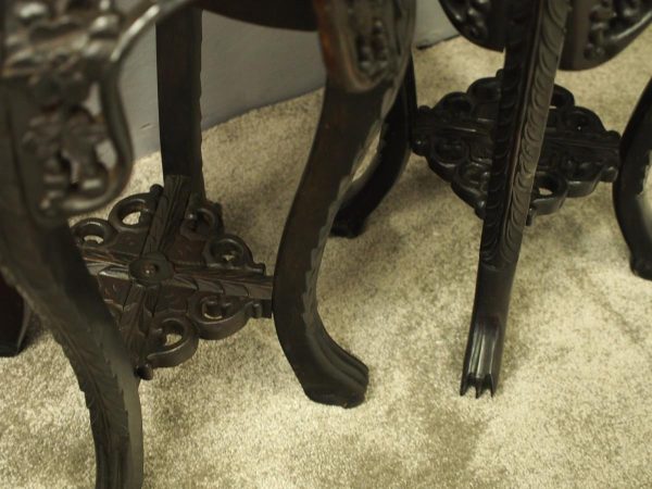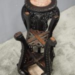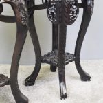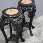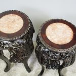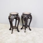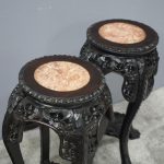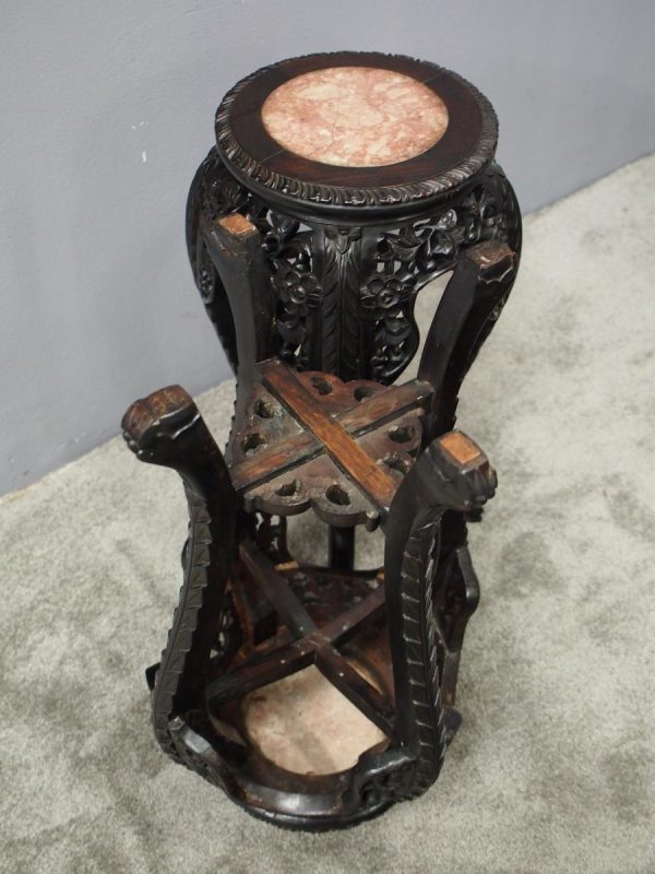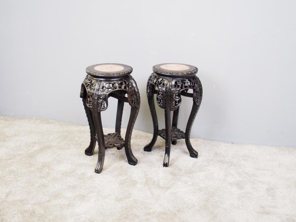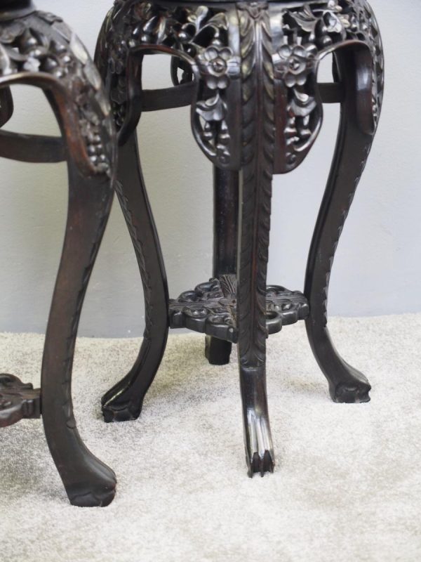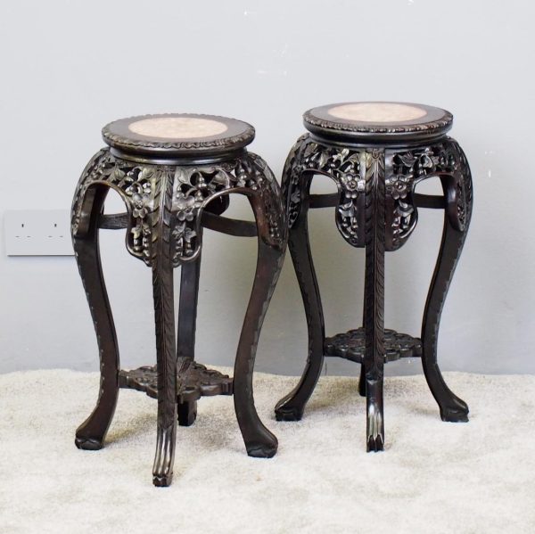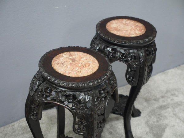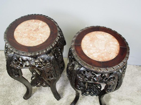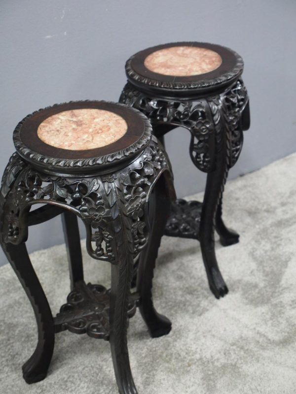Circa 1890, matched pair of neat sized Chinese rosewood plant stands. The circular tops with pink variegated marble inserts and gadrooned edges over elaborate, convex carved & pierced friezes with foliate and flower head decorations that extend down the cabriole supports, to carved stretchers.