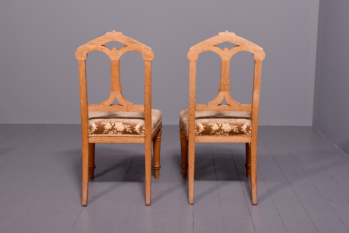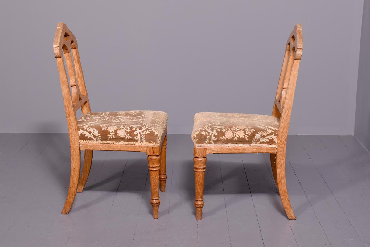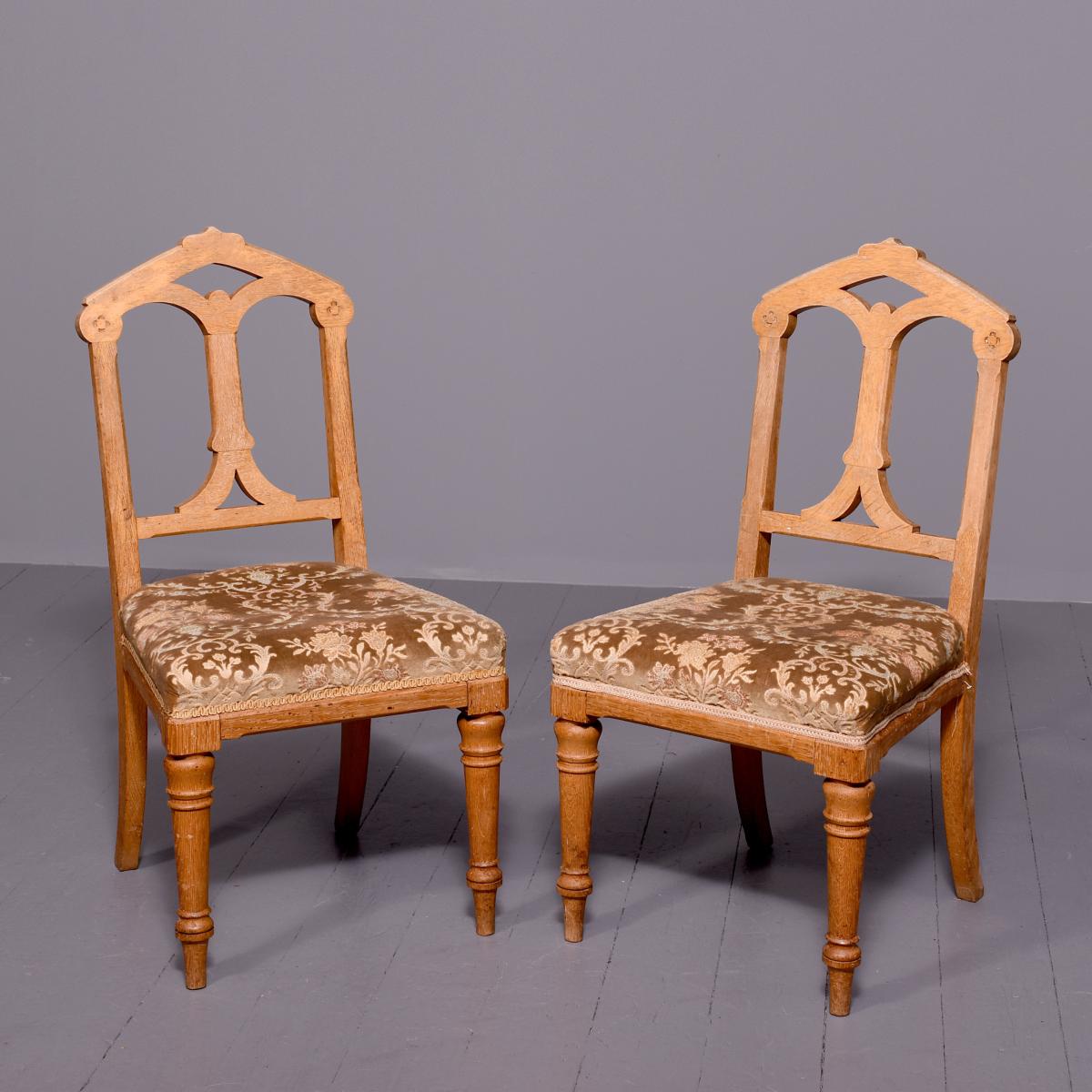 Circa 1870. A pair of Gothic oak chairs stamped, ‘John Taylor & Son, Edinburgh’, the shaped top rail with a pierced back with gothic arches and chamfered fore edges, with a large stuff over seat and simple  seat rails, back legs are square and slightly out swept, front legs are turned, ring turned and tapering On the underside of one chair is stamped.