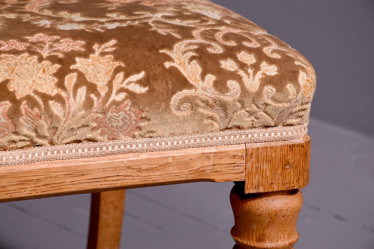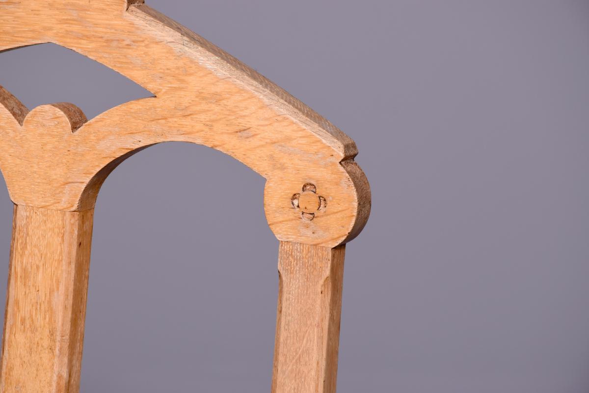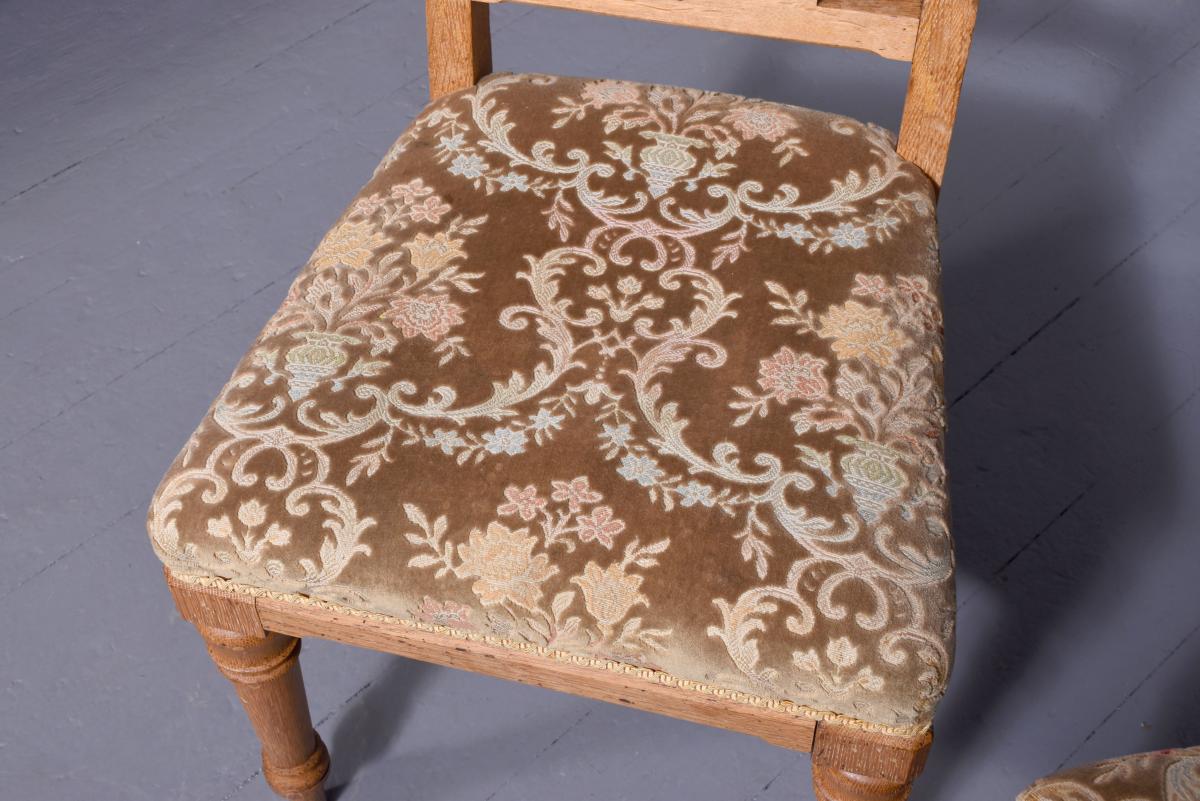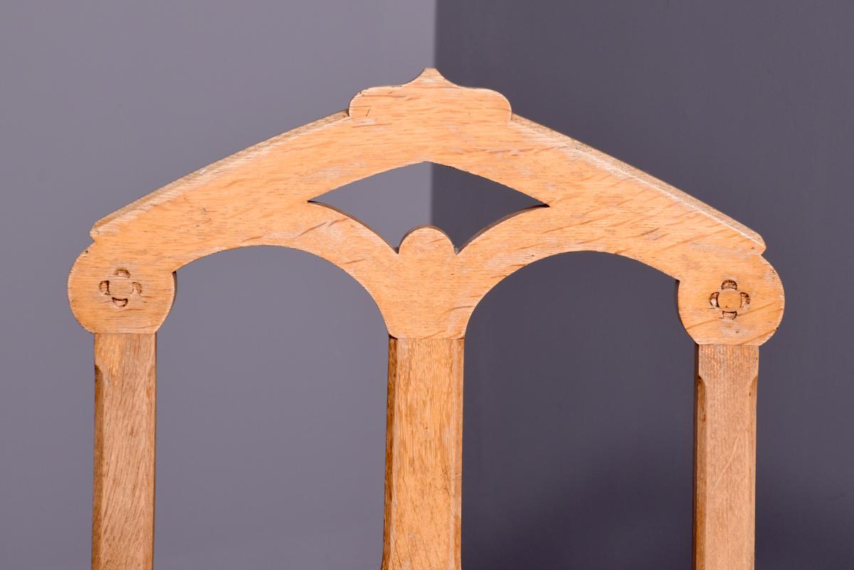 Circa 1870. A pair of Gothic oak chairs stamped, ‘John Taylor & Son, Edinburgh’, the shaped top rail with a pierced back with gothic arches and chamfered fore edges, with a large stuff over seat and simple  seat rails, back legs are square and slightly out swept, front legs are turned, ring turned and tapering On the underside of one chair is stamped.