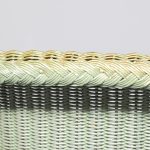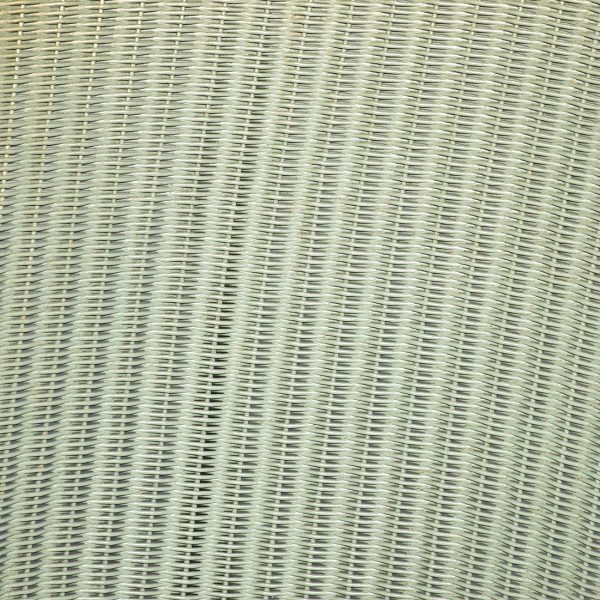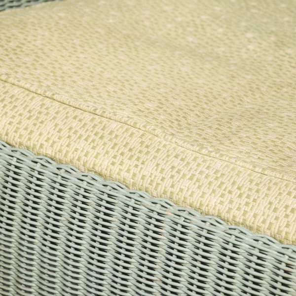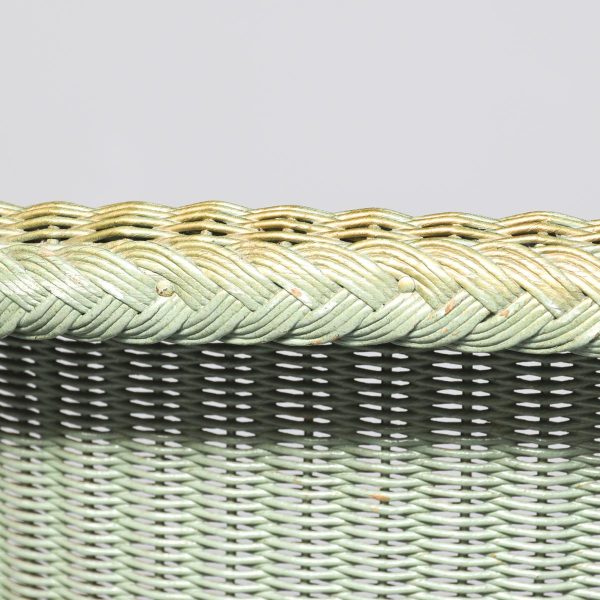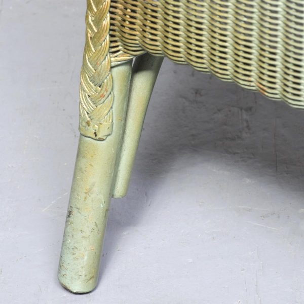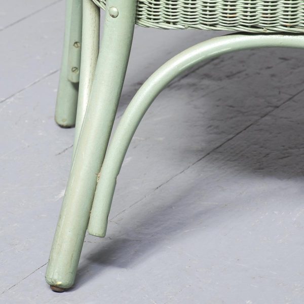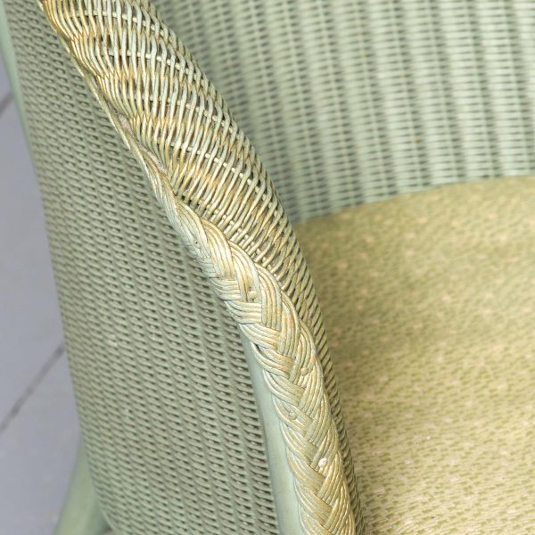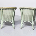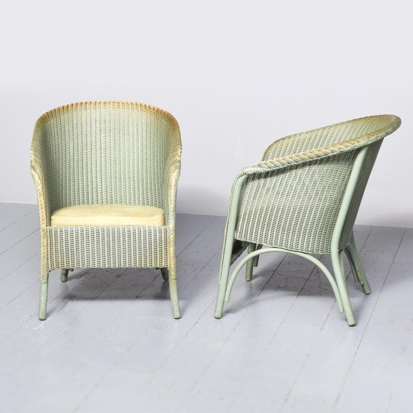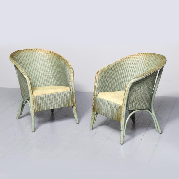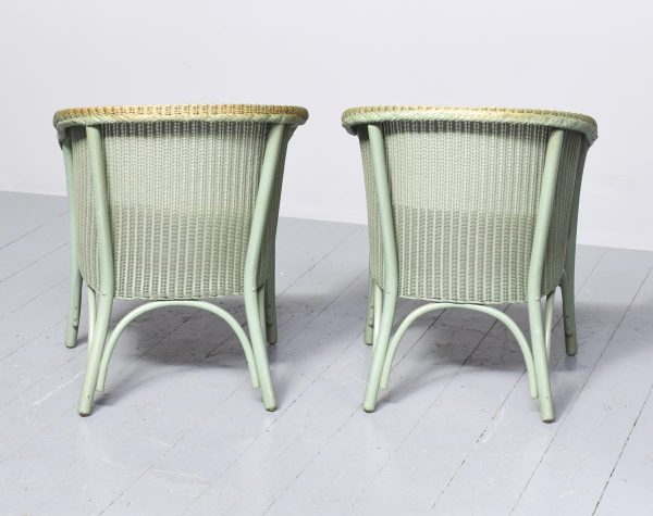 A pair of clean Lloyd Loom chairs, dated and stamped on the underside 1952. The wooden framed chairs with a paper weave covering painted green with gold tinging towards the edges, with an elegant curved top which tapers down to the front, a drop in upholstered seat, a deep apron with a woven gimp which covers the extremes of the frame. The chair stands on four circular splayed legs which are braced with curved stretchers.