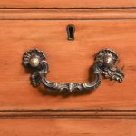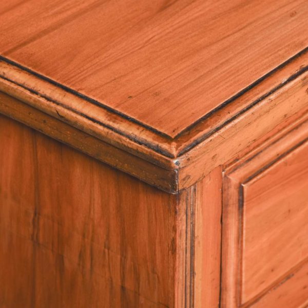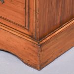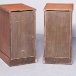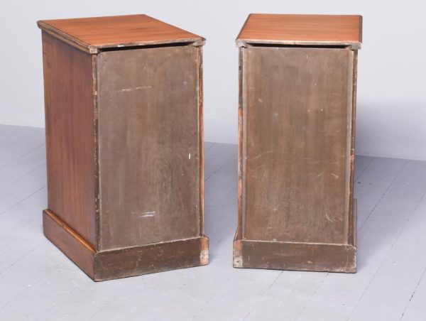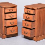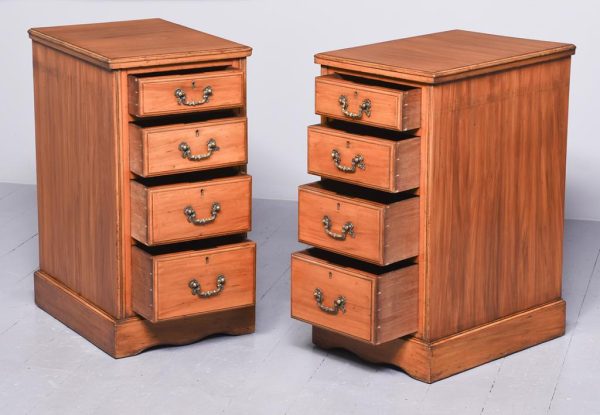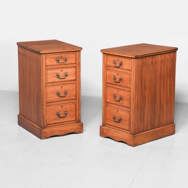 Circa 1890. A pair of late Victorian walnut and satin birch bedside cabinets (with adaptions). Rectangular tops with moulded fore edge, with a bank of four graduating drawers, each of the drawers has a moulded front and elegant cast brass swan neck handles with rococo back plates, flanked by ribbed pilasters. Beneath the bottom drawer there is a further moulding and the pair of cabinets rest on enclosed plinths with a slightly shaped apron to the front.