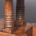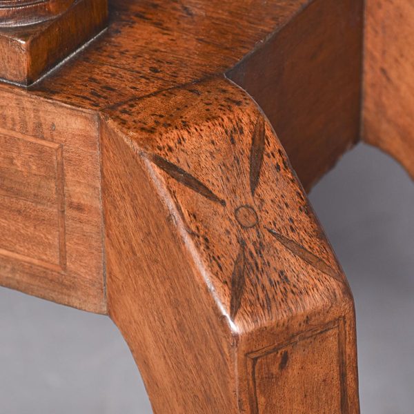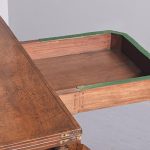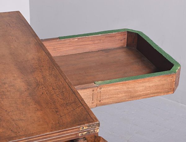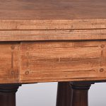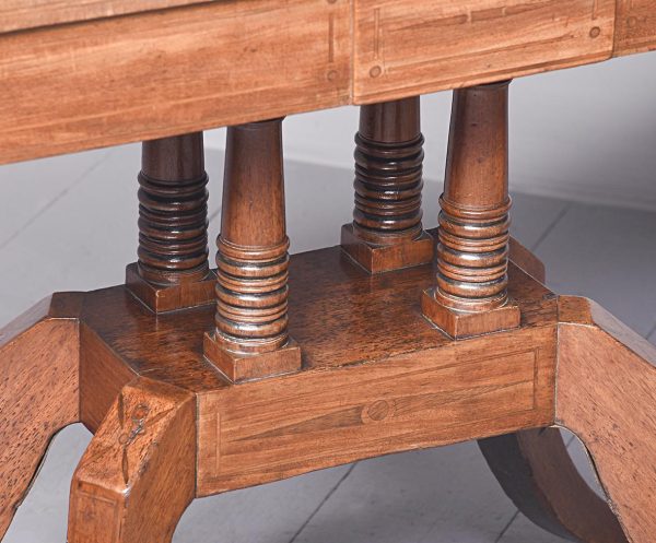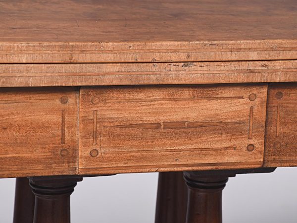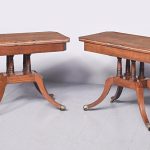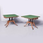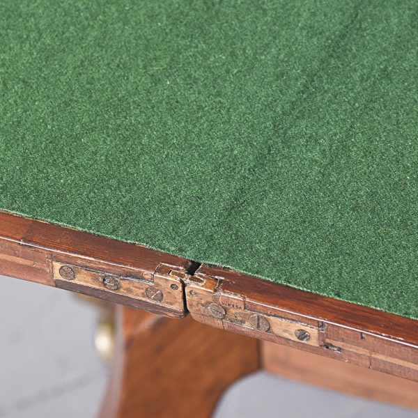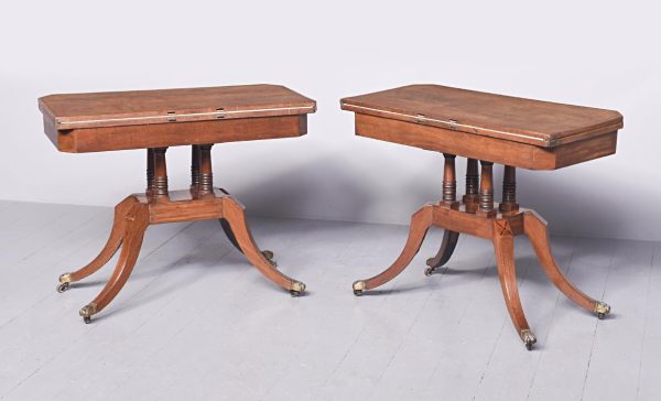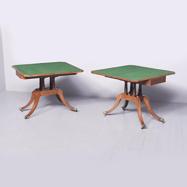 Circa 1815. A quality pair of Regency mahogany and inlaid fold over card tables. The rectangular inlaid tops with canted corners, are hinged and open to reveal a felt lined interior. The tops swivel with storage underneath. The frieze with inlay and it has a small raised panel in the center, the table stands on four turned and ring turned columns, resting on a inlaid platform base issuing four tall saber legs with inlay on the facing and terminating on a cast brass paw with original castors beneath. The tables have a lovely mellow colour.