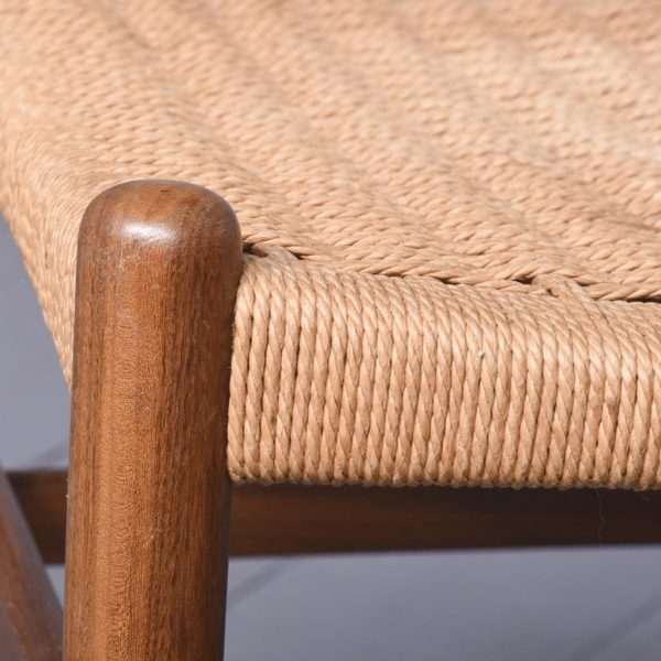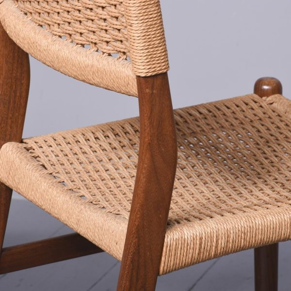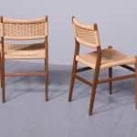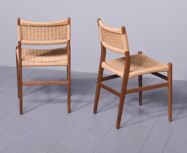 Circa 1970s. A stylish pair of retro mahogany and rattan side chairs. The top rail and seat completely covered in rattan with a lovely weave, the back legs slightly out swept, the front legs turned and tapering. All of the legs are intersected by simple stretchers.