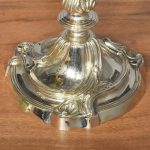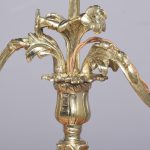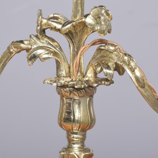 Circa 1880. A pair of cast brass and polished table lamps recently converted from candlesticks, the Rococo stem with shaped top issuing 2 arms with a stylish casting on all sides, with the bases of the lamps in the form of flower petals below a twisted urn capped by faux candle lamp-holders, all resting on the enclosed flared circular base.