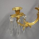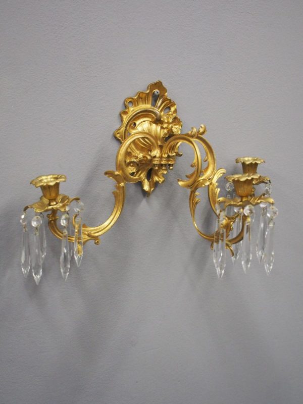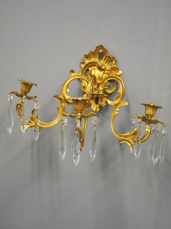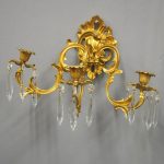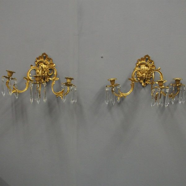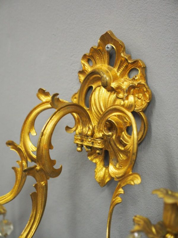 Circa 1880, pair of Rococo-style ormolu (gilded bronze) wall sconces. The acanthus leaf and shell design backplates supporting 3 adjustable curved arms with petal shaped candleholders and foliate shaped drip trays. They have not been electrified.