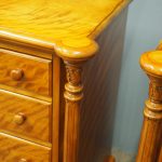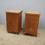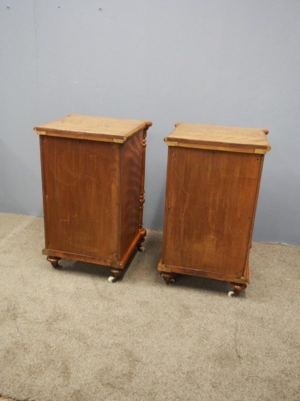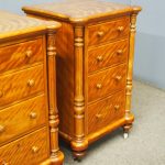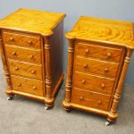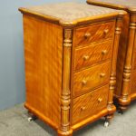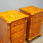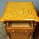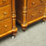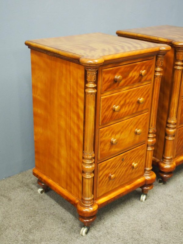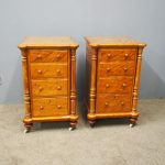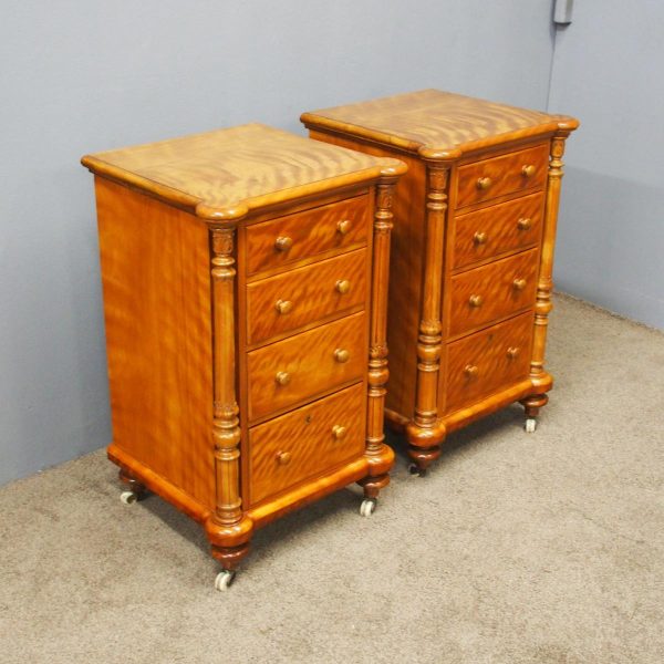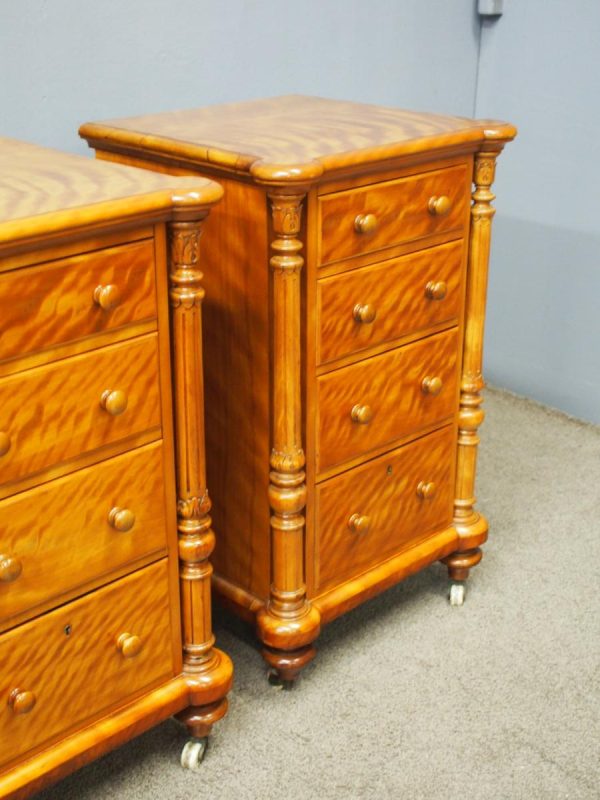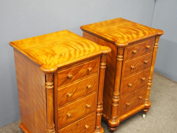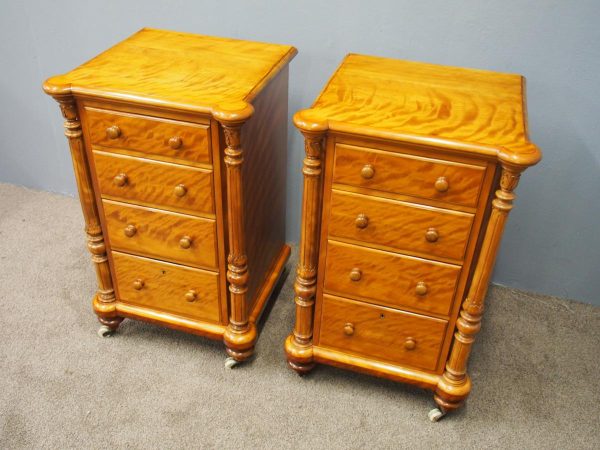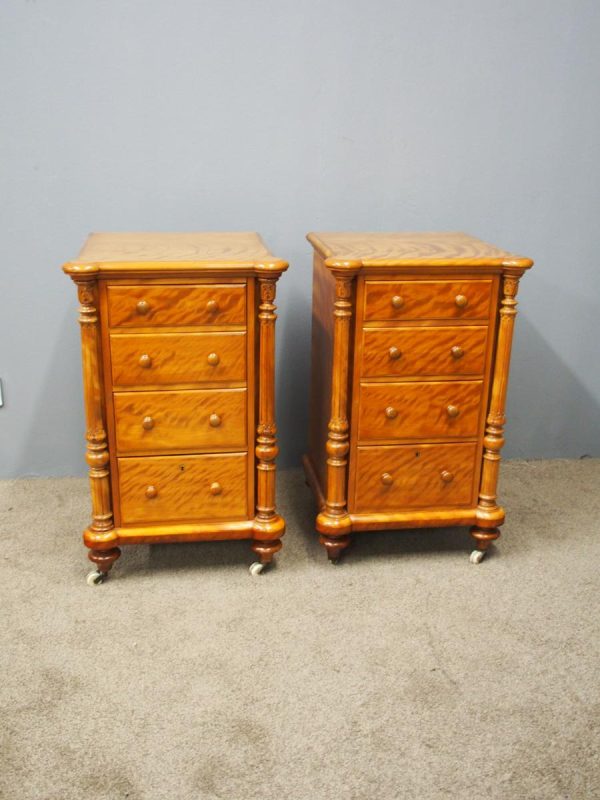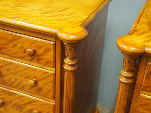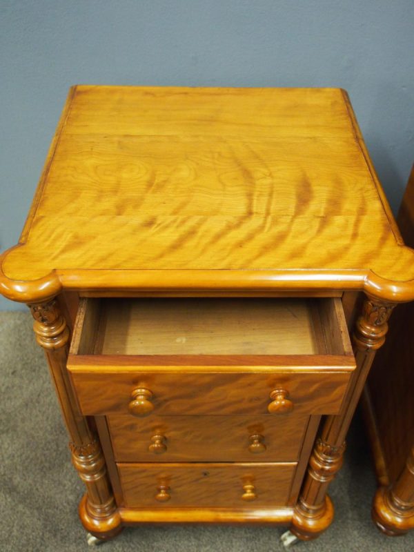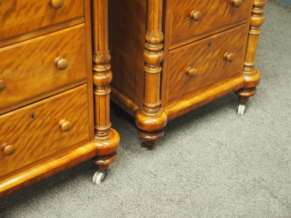 Circa 1870 and later, pair of satin birch pedestals. With a moulded edge and breakfront section, a configuration of four drawers and on either side are carved pillars with foliate designs and fluting. They stands on turned and tapered feet with brass and white porcelain castors.