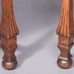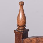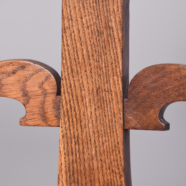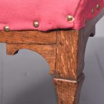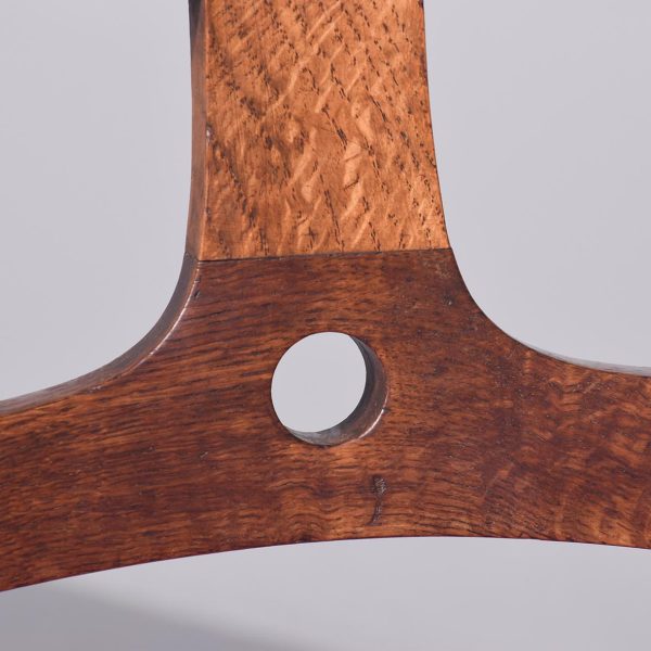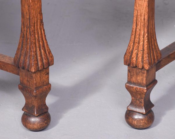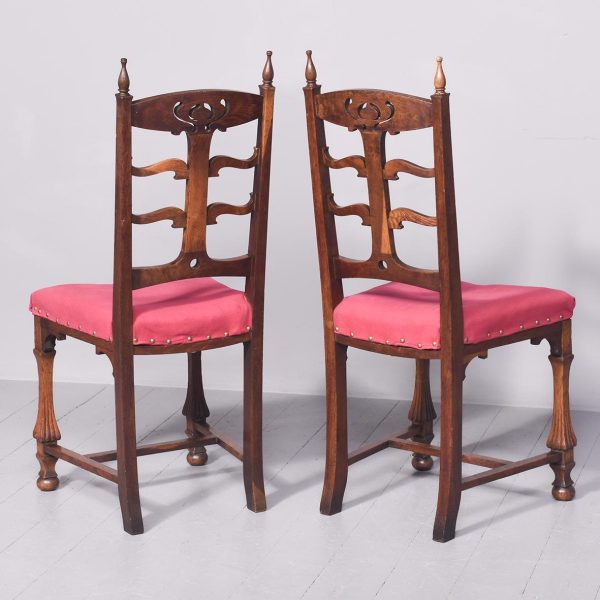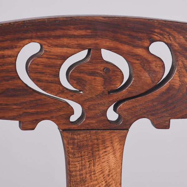 Circa 1900 A quality pair of Scottish Art Nouveau Scottish oak chairs, the curved and pierced top rail surmounted by a pair of elegant tapering finials, the simple splat supporting shaped rails with small aperture in the base, the stuff over seat with simple seat rail, back legs are square and slightly out swept, beneath the seat rail there’s solid shaped quarter brackets, the unusual and stylish front legs, square tapering with reeding ,finishing on a bulbous toe with the legs braced by a conforming stretchers, each of the chairs has the trade label attached to the underside,’ George Lear & Son 10 Anne Street Bridgeton Glasgow’