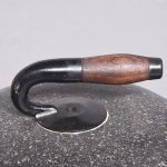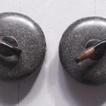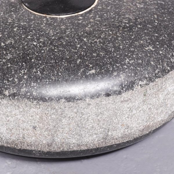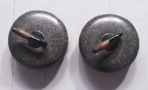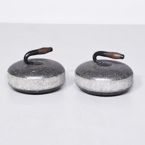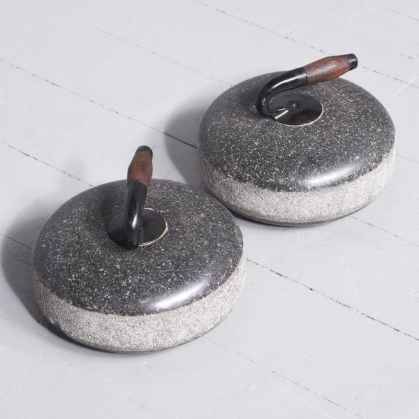 Circa 1880. A pair of Scottish, black speckled granite curling stones of traditional form, with tops and bases polished with coarse sides, with a pair of metal and wooden lifting handles. Clean elegant and stylish.