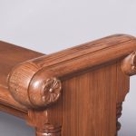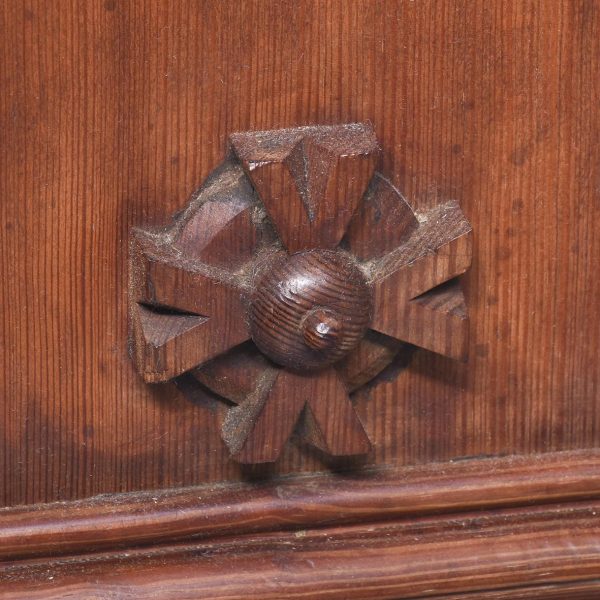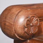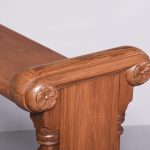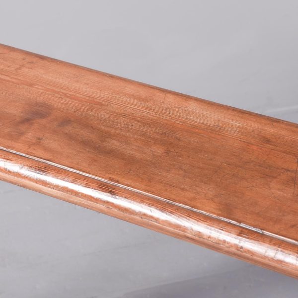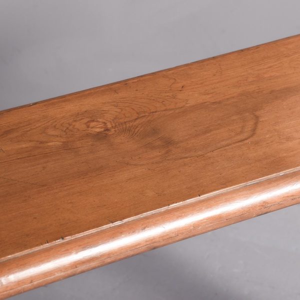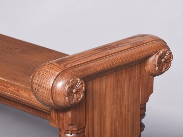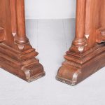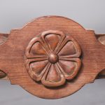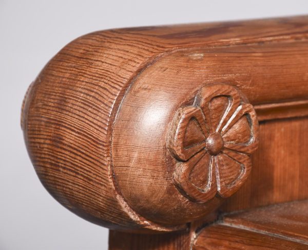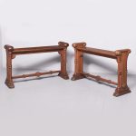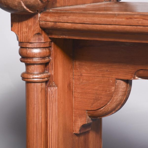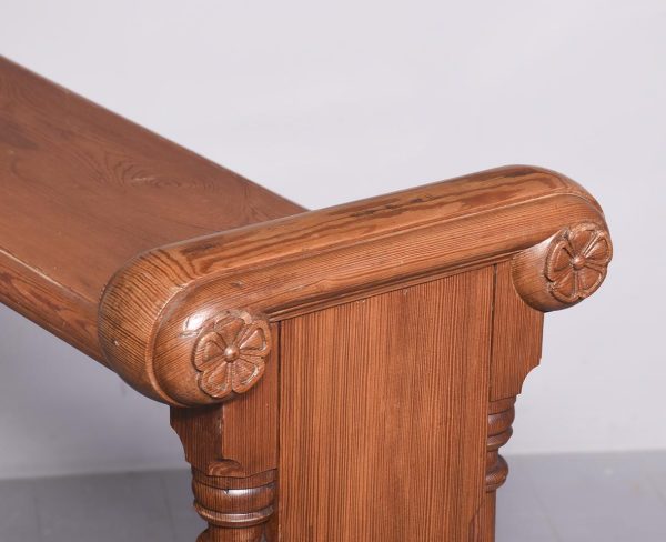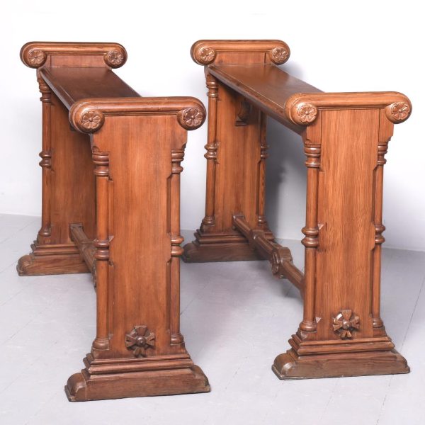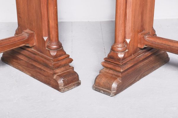 Circa 1860. A stylish pair of pitch pine gothic influence free-standing side tables. The solid narrow top with moulded fore-edge, raised end with carved flower-heads on both sides, the underside of the top with a shaped stretcher, supported on solid uprights with turned pilasters, resting on a stylish platform base with the uprights braced by stylish shaped stretchers with flower-heads similar to the top, great colour and patination.