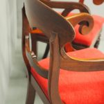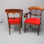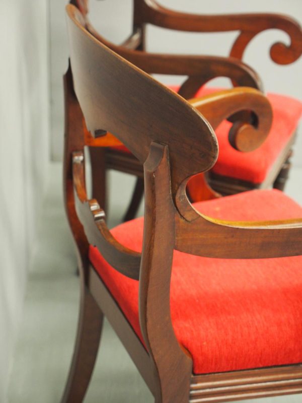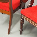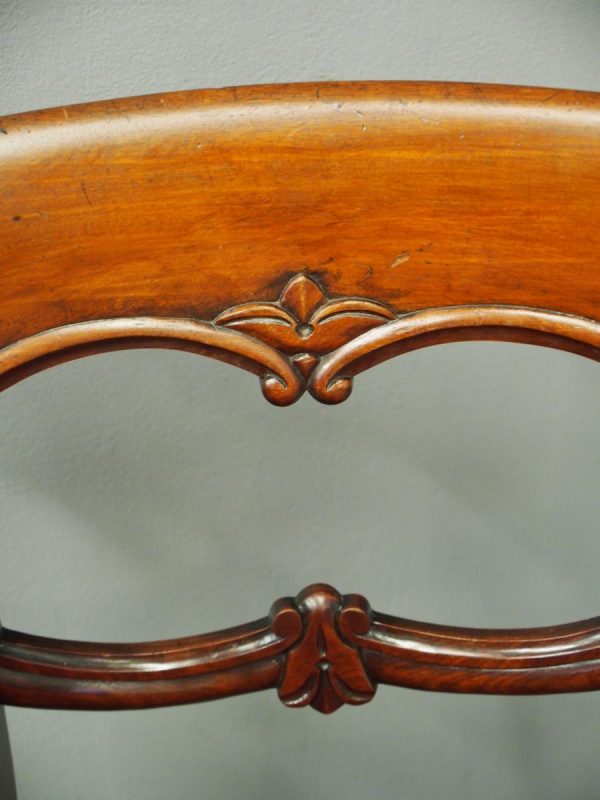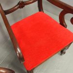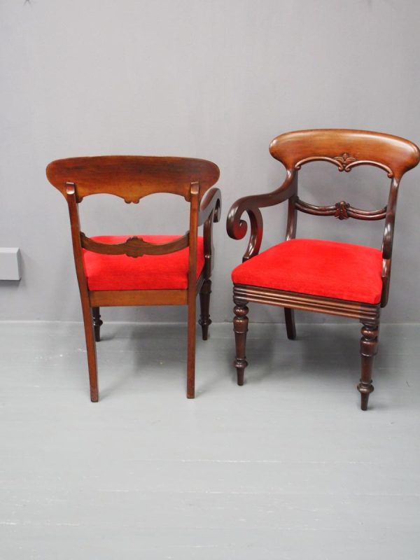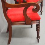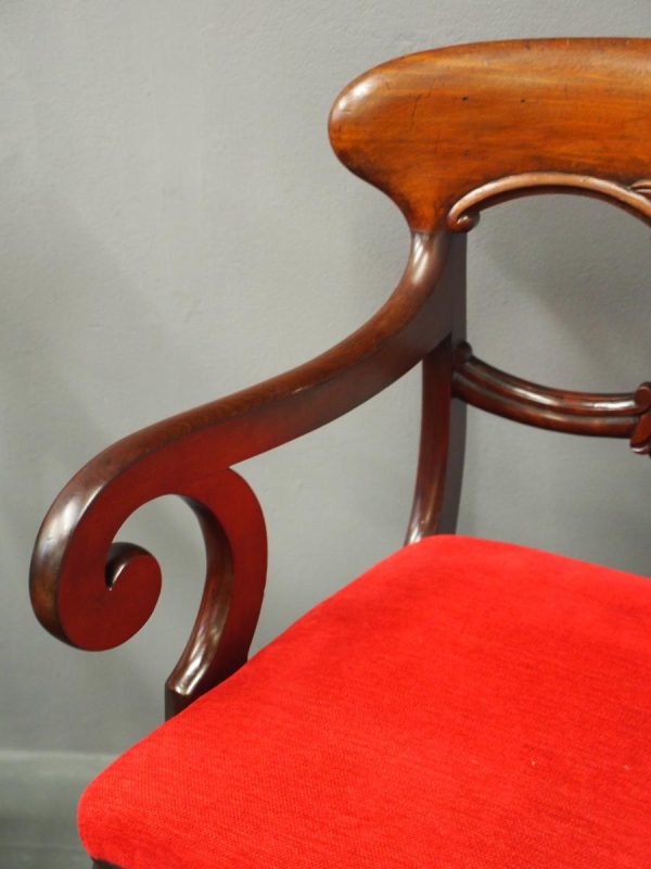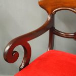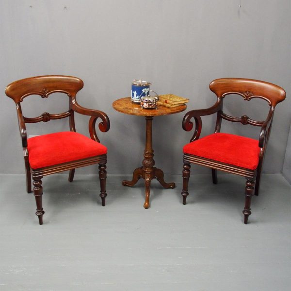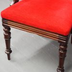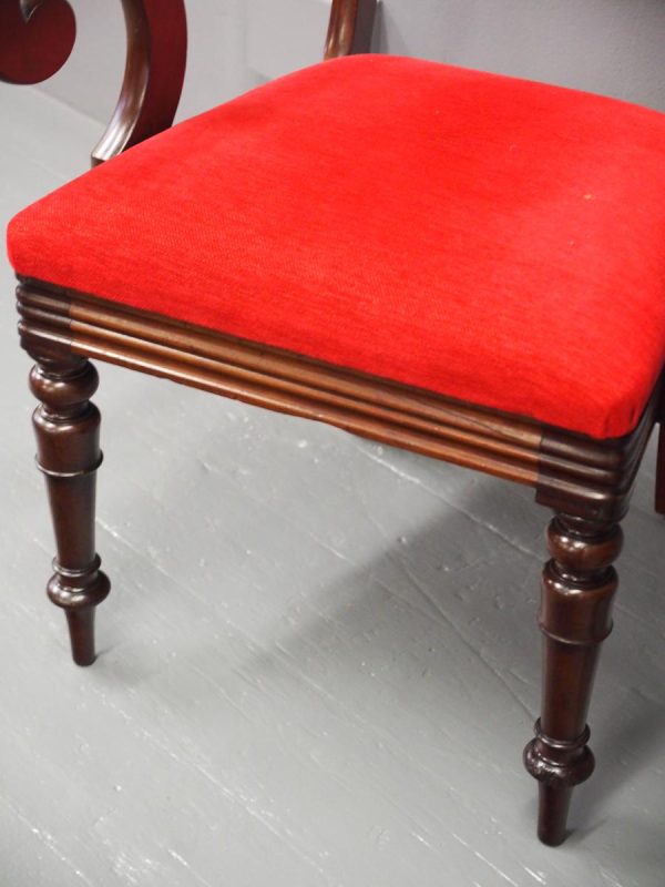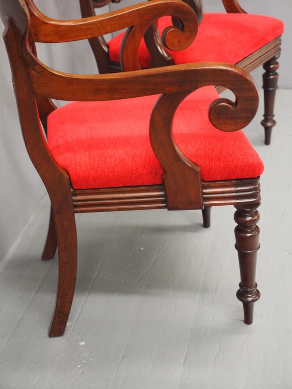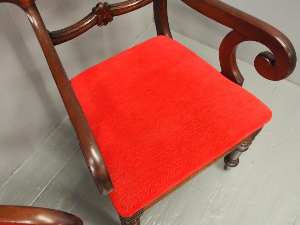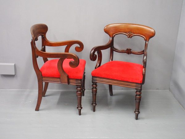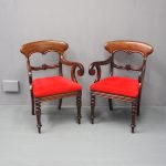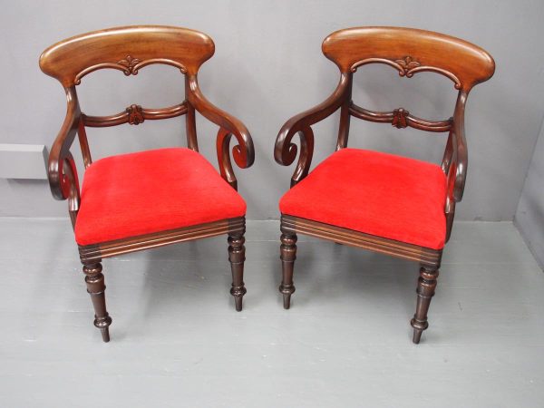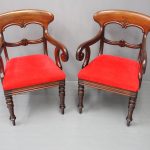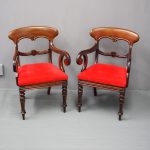 Circa 1870, pair of Scottish Victorian mahogany armchairs. With shaped and carved top rail, and foliate carved central section. The 2 curved arms finish with a curled front, held in place by shaped uprights. Both have large drop-in upholstered seat pads above square and slightly out swept back legs and turned, ring turned and tapering front legs.