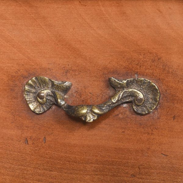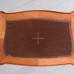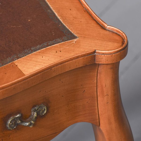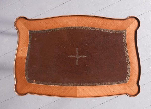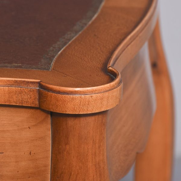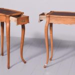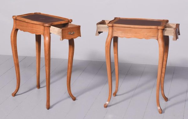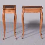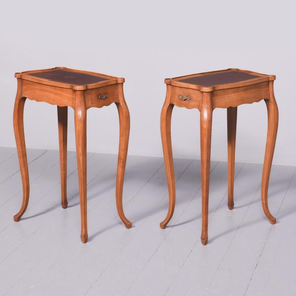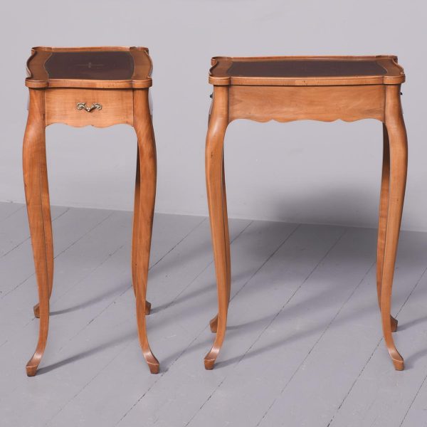 Circa 1930s. A pair of French walnut shaped bedside cabinets or side tables, with a low wrap around gallery, broad banding and a tooled and gilded leather insert. The frieze with a shaped drawer on each end with a cast brass handle, the sides with a shaped curvaceous frieze, resting on four elegant cabriole legs finishing with a simple foot.