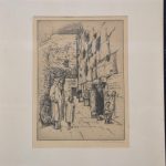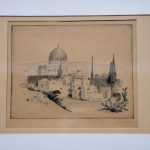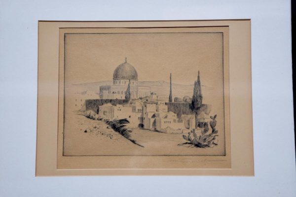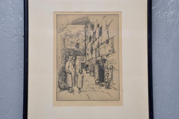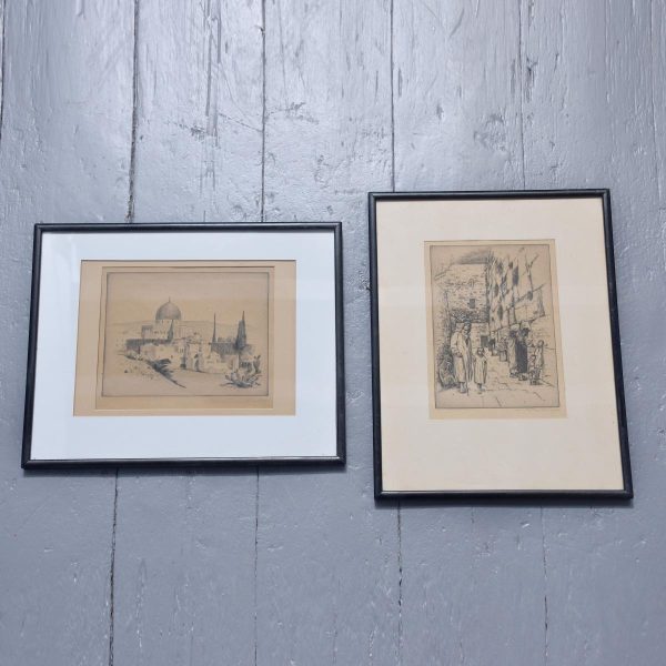 Circa 1900. Pair of signed and framed Judaica etchings of Jerusalem scenes. One depicting figures praying at the Wailing Wall and one of the Golden Temple. Both signed M. Cournamilt ? One has the picture framers stamp at the back Asher Blinkbinder Jerusalem. Both in ebonized wooden frames and in excellent condition