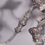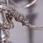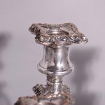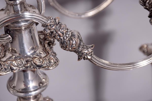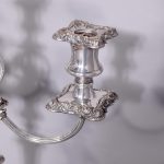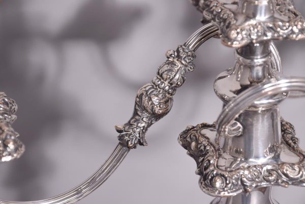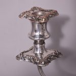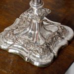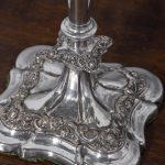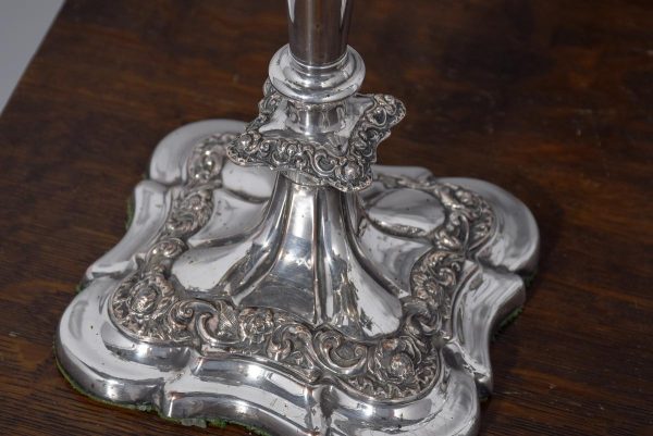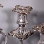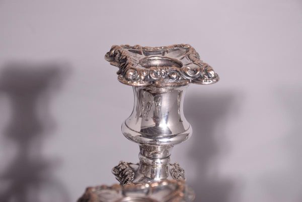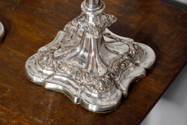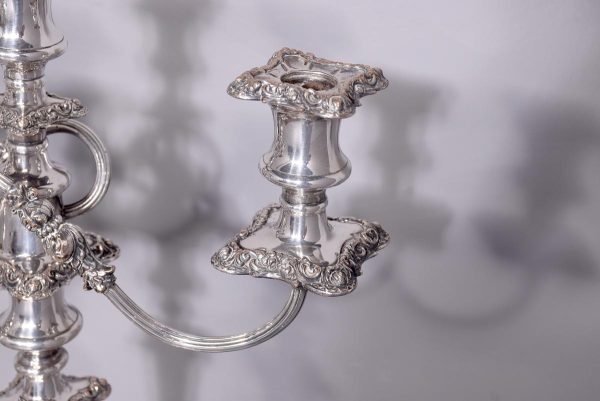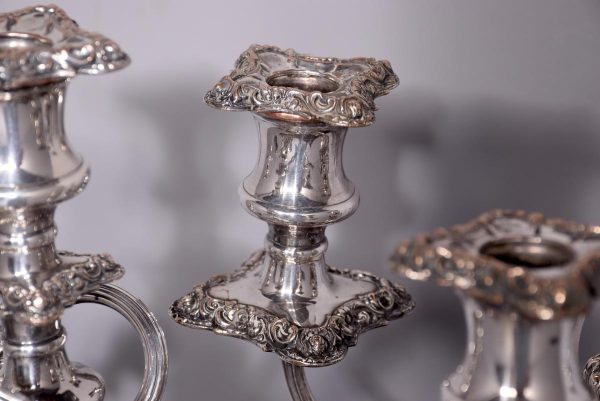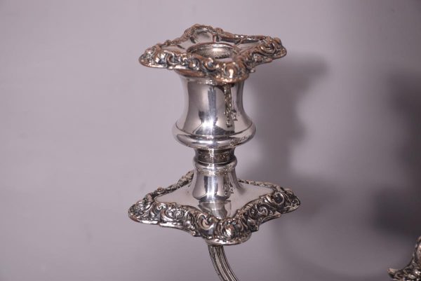 Circa 1900 A quality pair of EPNS (Electro Plated Nickel Silver) Candelabra, also known as ‘Sheffield Plate’, the top section which is removable with three candle holders, all with square bases and nozzles with wonderful Rococo shaped arms, resting on the base which is similar to the top, supported on a circular tapering stem, resting on a petal shaped base with elaborate casting, with visual copper showing through the silver.