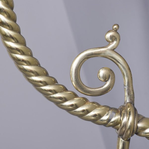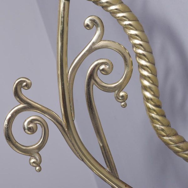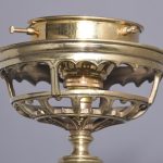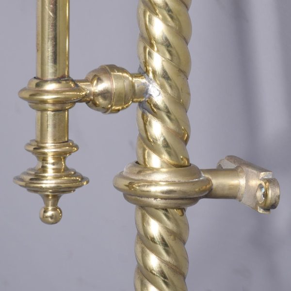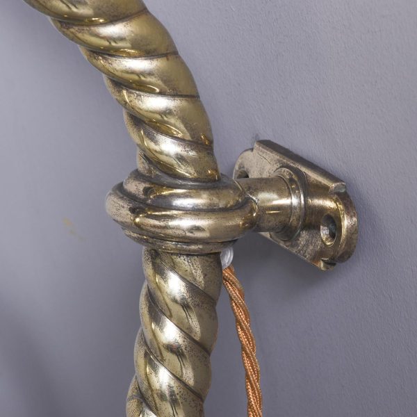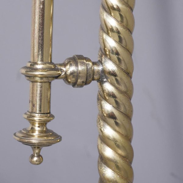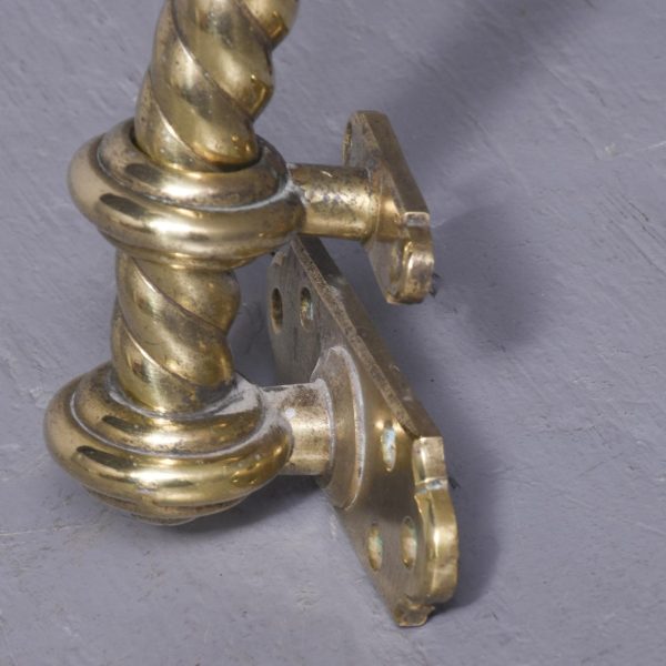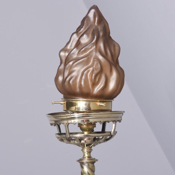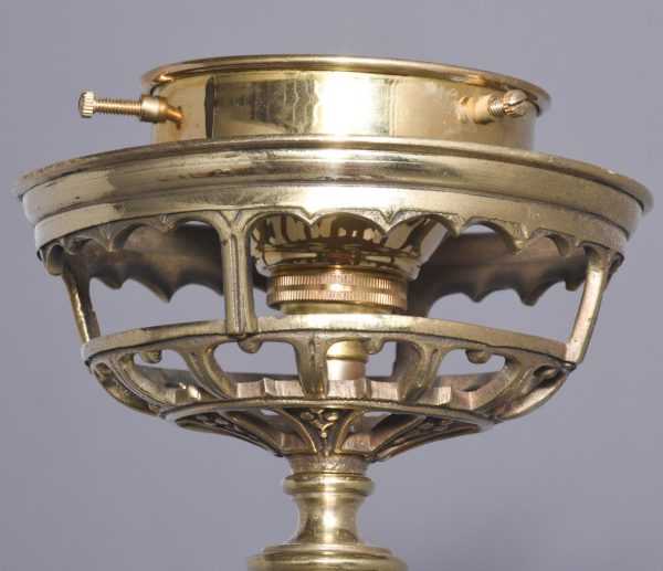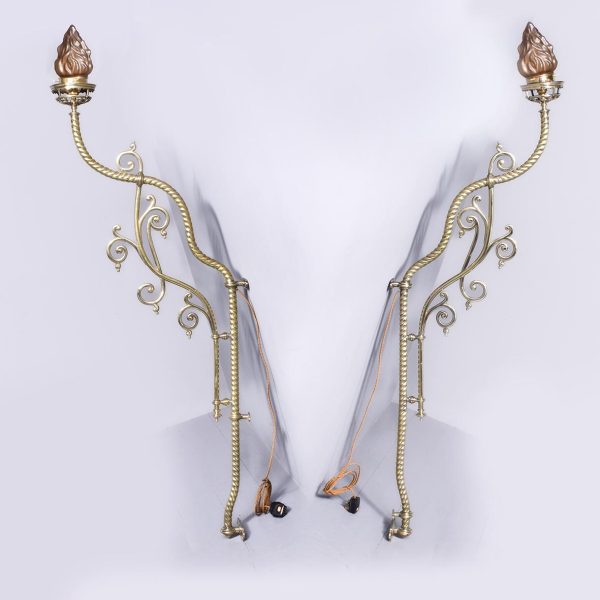 Circa 1860 and later. A pair of Victorian brass oil lamps, recently converted to electricity. The lamps with flamed smoked glass shades, with the original pierced brass cradle for holding the oil reservoir beneath. Supported on a stylish shaped brass barley sugar upright with two brackets for fixing to wall, the uprights are intersected by scrolling cast brass foliate with gothic patterns, recently rewired