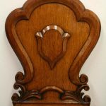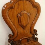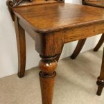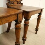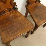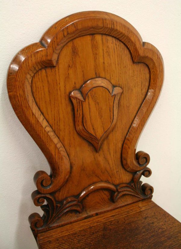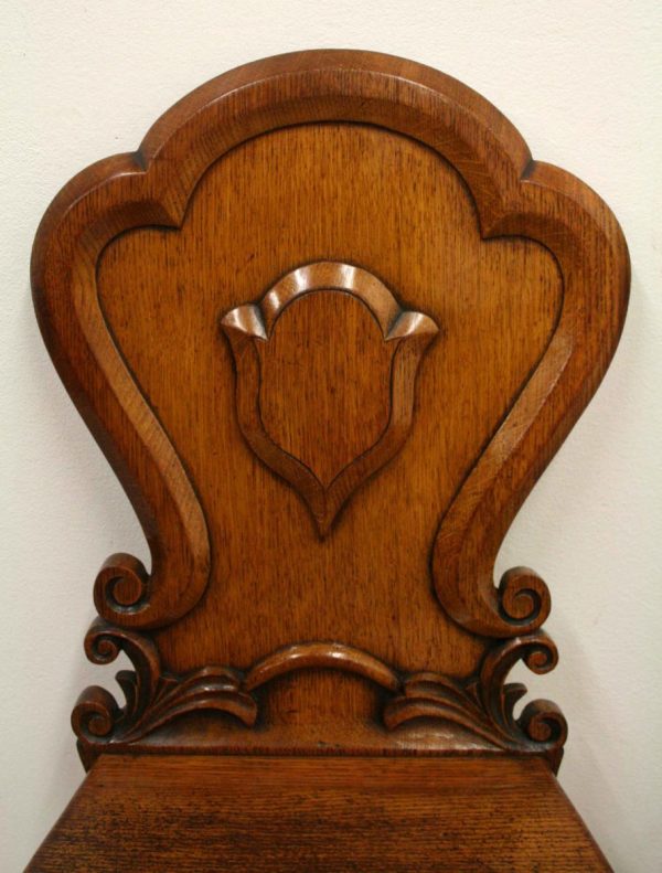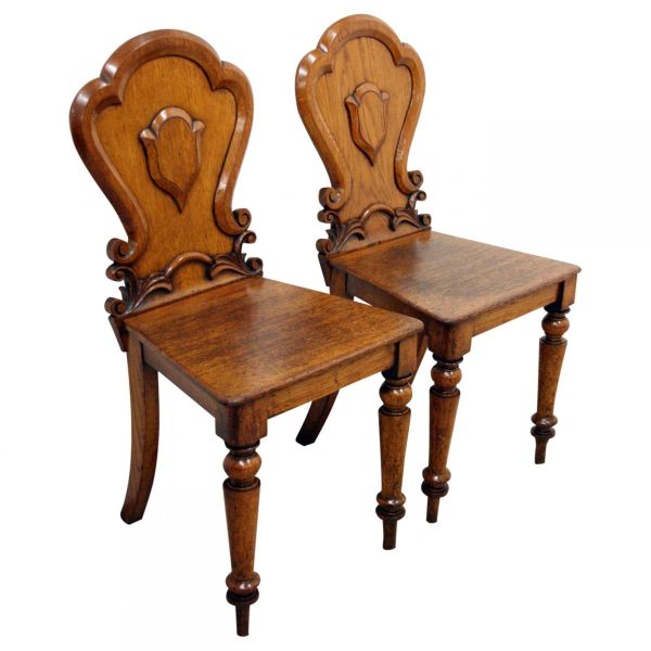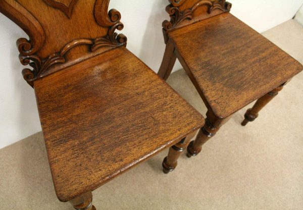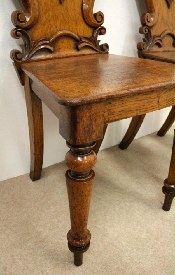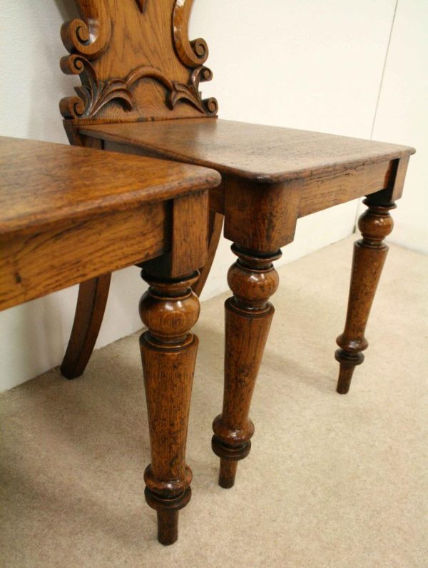 Circa 1870, good pair of Victorian carved oak hall chairs. The heraldic shaped back is carved out of solid quarter sawn oak, and has foliate carving and scrolling at the bottom. The seat is also solid and tapering, with a slightly rounded edge. The front legs are turned and tapering, and the back legs are square and outswept. Excellent colour and condition.