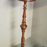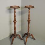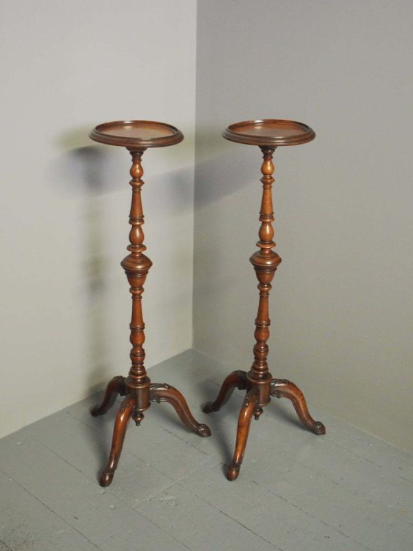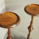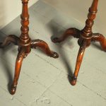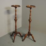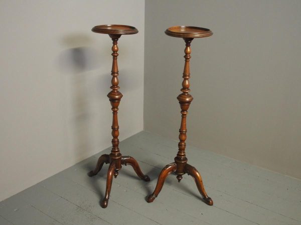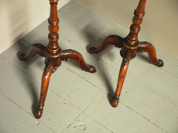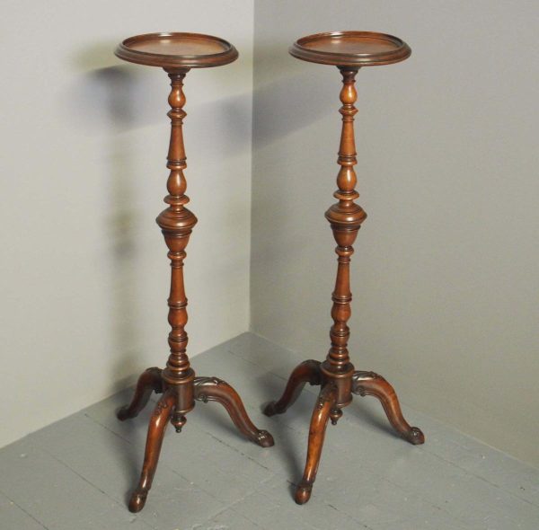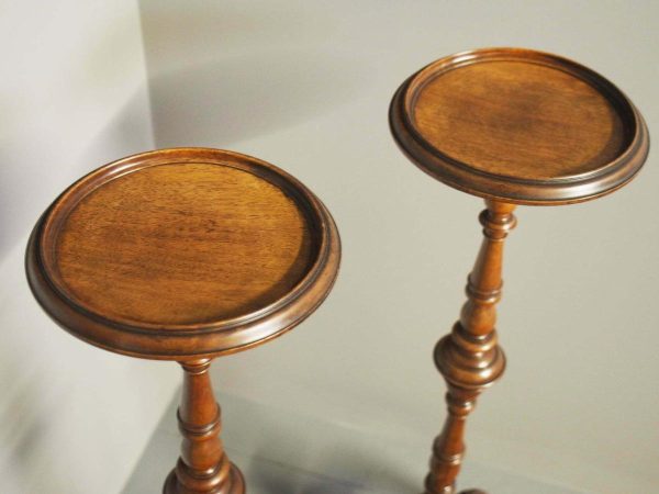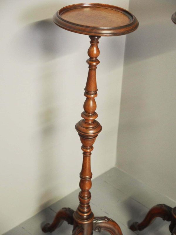 Circa 1880, pair of Victorian mahogany torcheres. With neat circular tray tops on turned supports, and carved, scrolling legs with hoof feet.