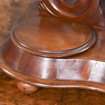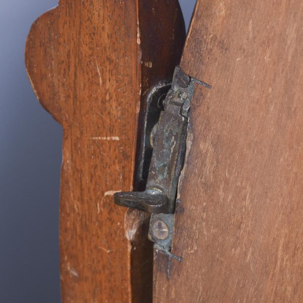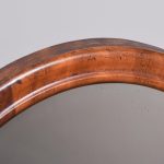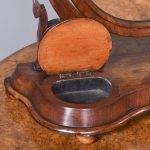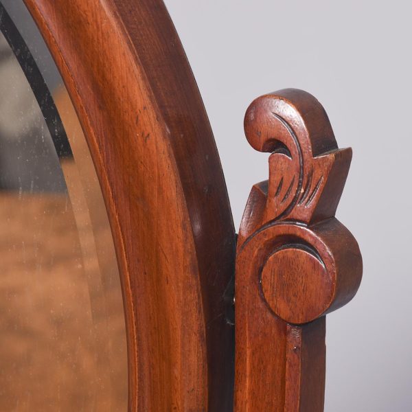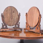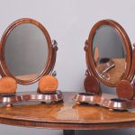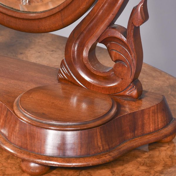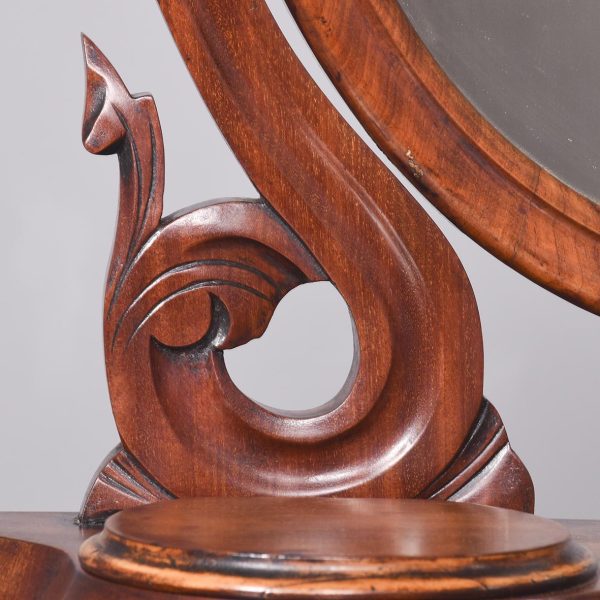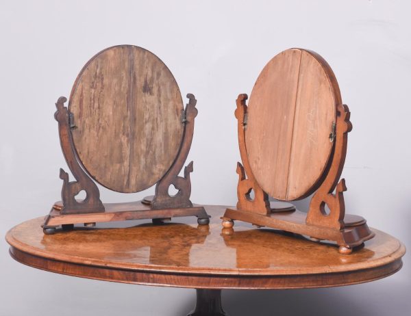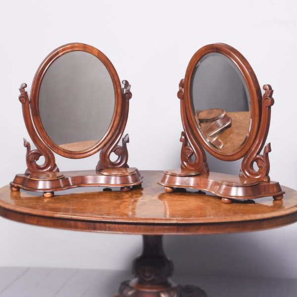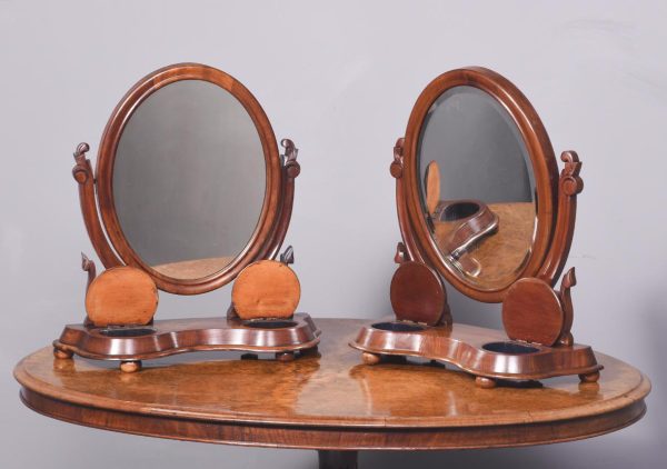 Circa 1870. Pair of mahogany mid Victorian toilet mirrors. The shaped mirrors in moulded frames supported on two curved foliate and pierced uprights, the platform base with two oval hinged jewellery drawers, with a tapering moulded fore edge resting on four squat bun feet.