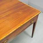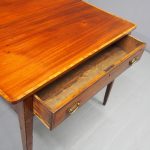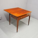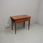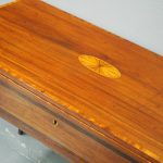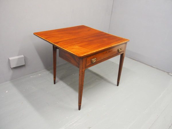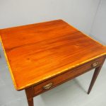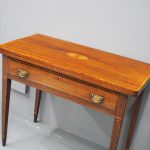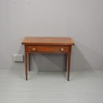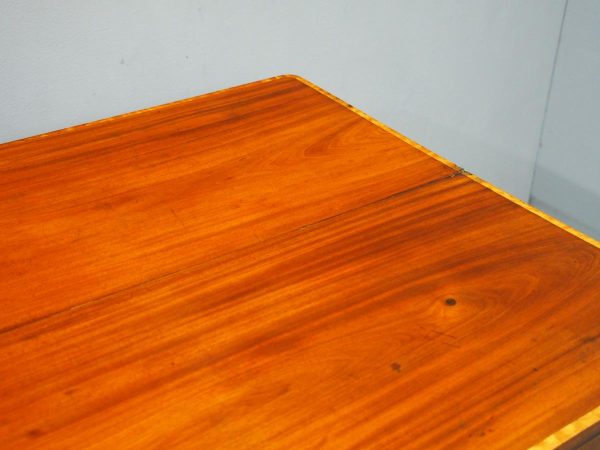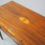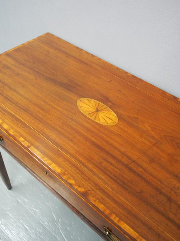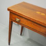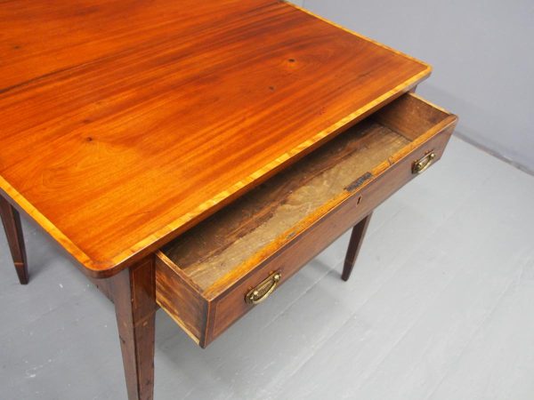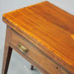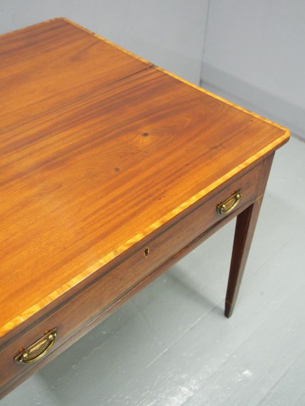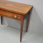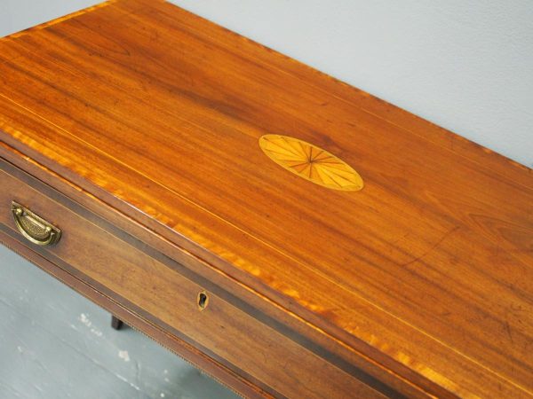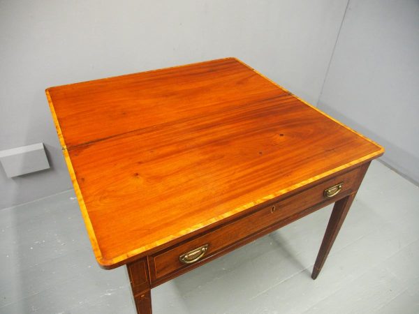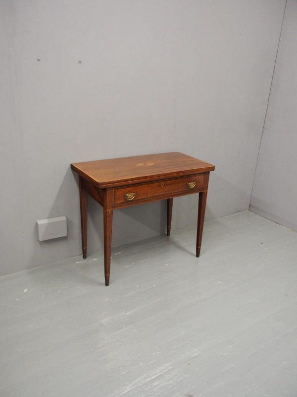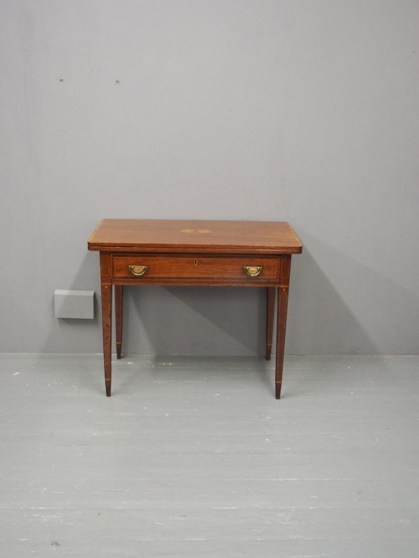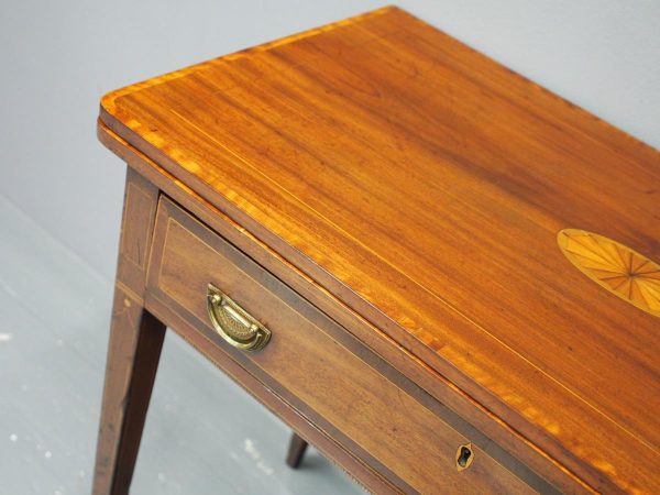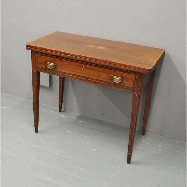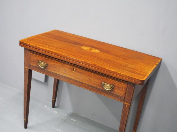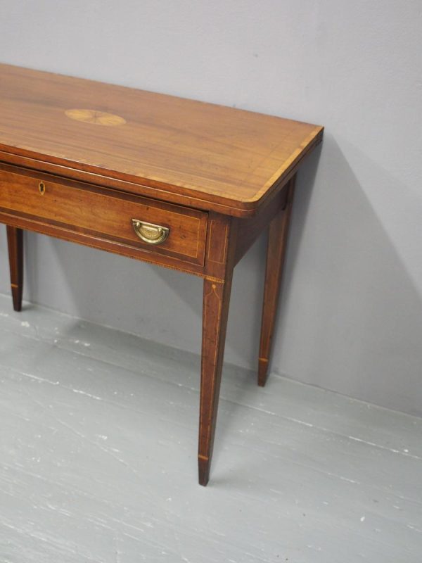 Circa 1800, George III inlaid mahogany fold over tea table. The rectangular top with rounded corners and central shell inlay, boxwood stringing and peripheral satinwood cross banding opens to a polished interior with satinwood banding. Full-length inlaid frieze drawer with shaped brass handles. All standing on inlaid tapering square legs with spade toes.