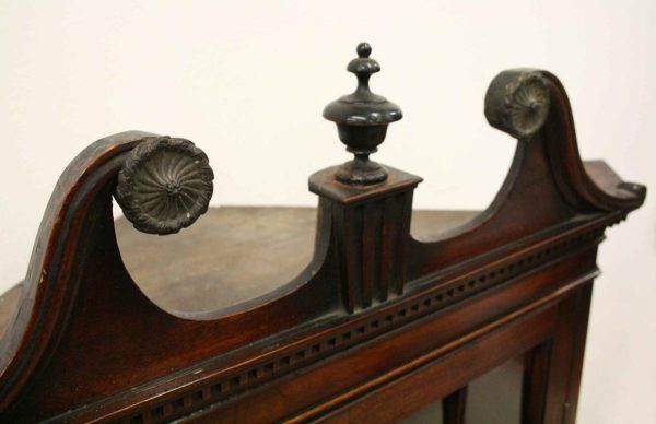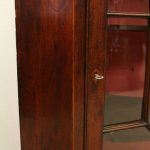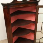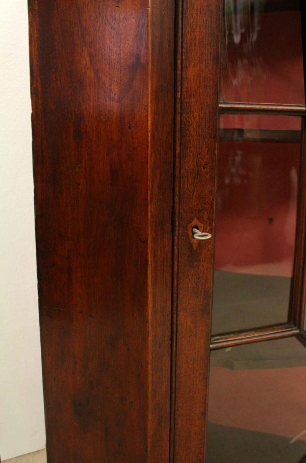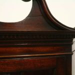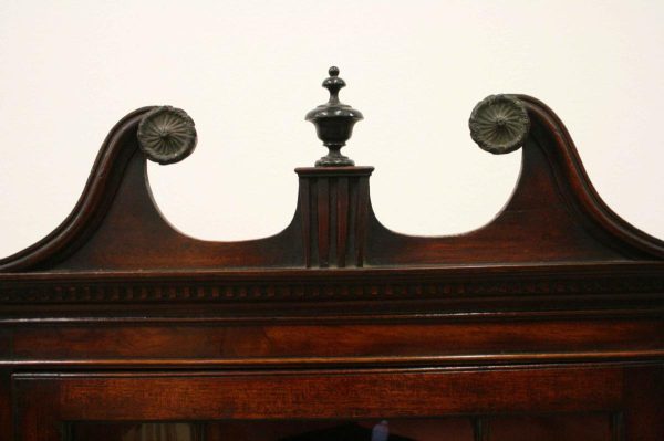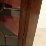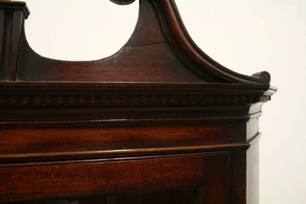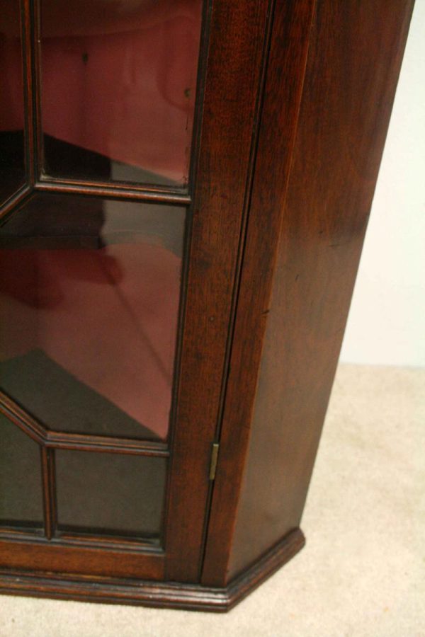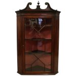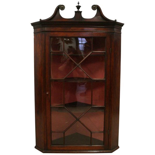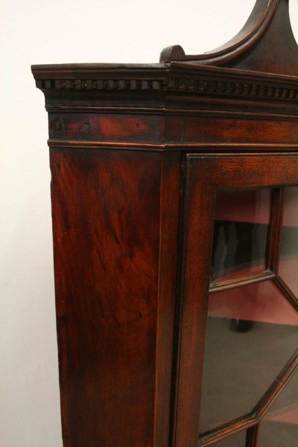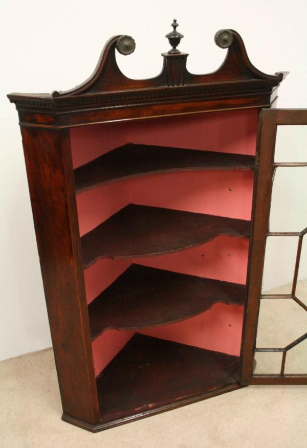 Circa 1780, George III astragal glazed mahogany hanging corner cabinet. The dentil cornice and swan neck pediment with brass rosette mounts and ebonised finial to the centre. Beautiful mellow colour and patina.