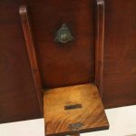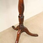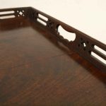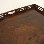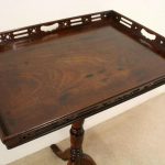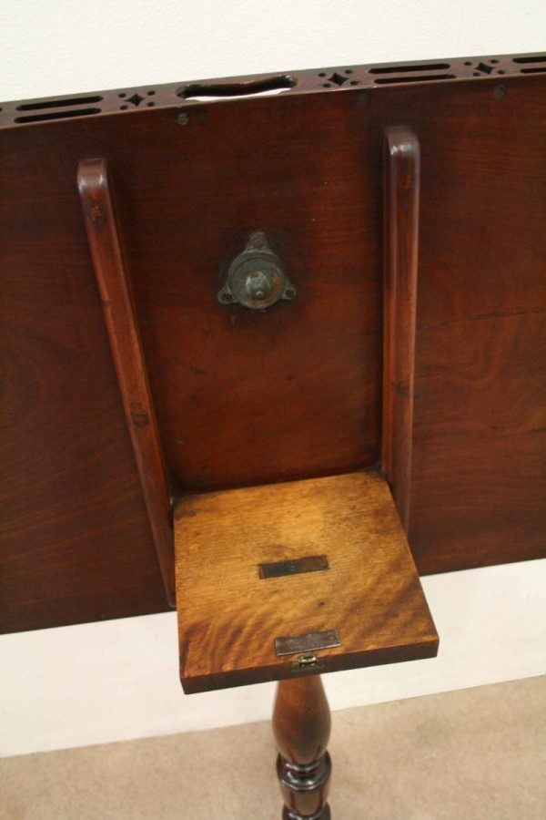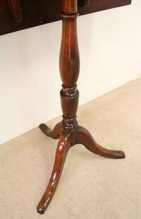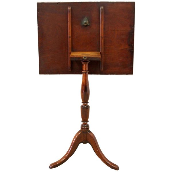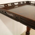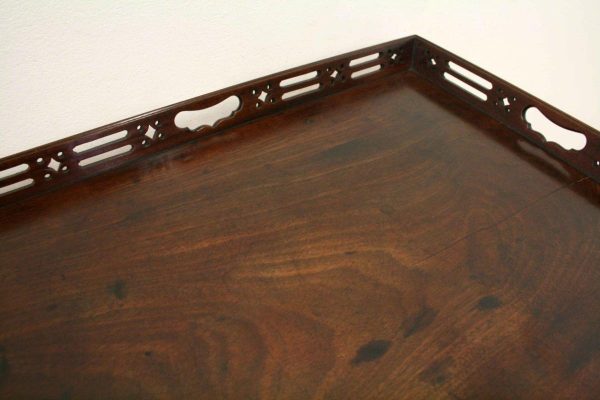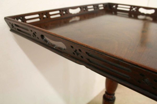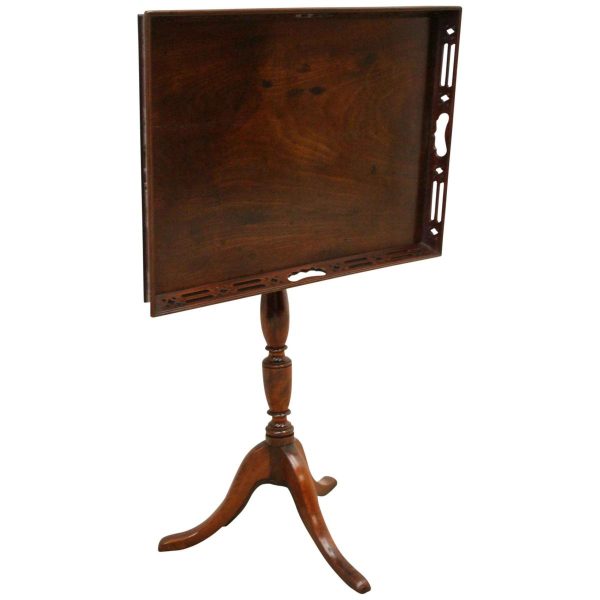 Circa 1790, George III mahogany snap top occasional table. The rectangular tray top has a canted wrap around gallery with open fretwork and lifting handles on all four sides. Underneath are 2 rails and a small brass spring loaded hinge which hold the table on place onto a block. The table stands on a stained beech turned column, on 3 splayed feet which has had a lead bracket added on the underside to give stability. This is probably a Georgian tray with a later base, but has good colour and style.