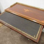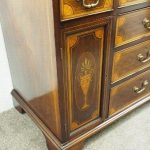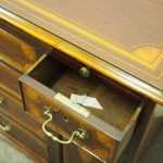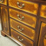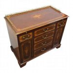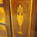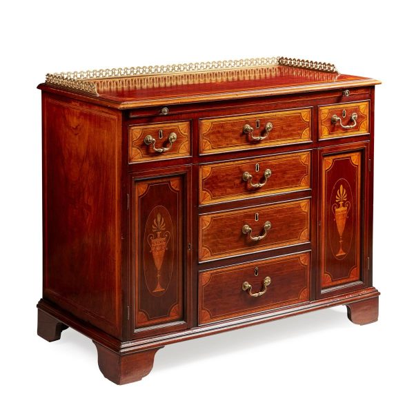 Circa 1810, rare late Georgian inlaid writing cabinet. The rectangular top with open foliate design has a three quarter gallery in ormolu, urn and shell inlay and satinwood banding. There are four central inlaid graduated drawers with original brass handles. The 2 cupboards are to the sides with internal drawers and folio cabinet, and it all stands on original bracket feet.