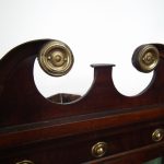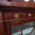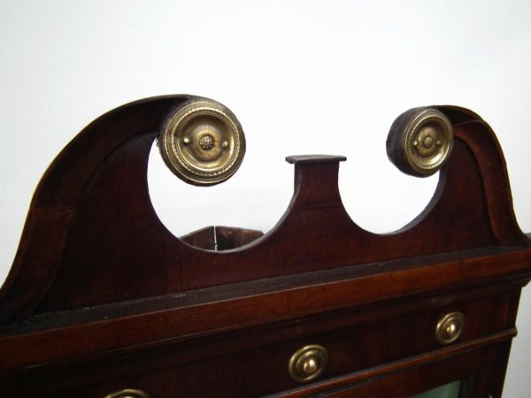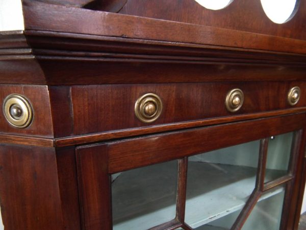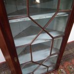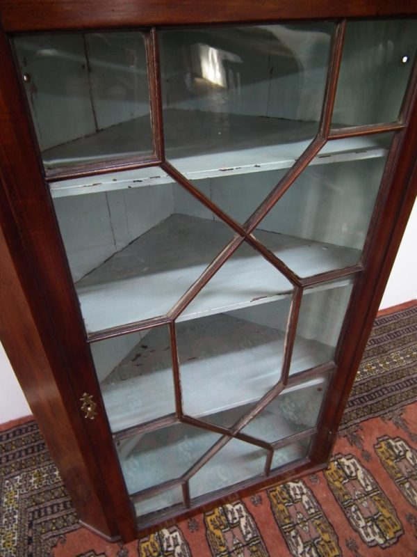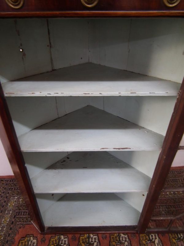 Circa 1800, late Georgian mahogany glazed corner cabinet, the top with brass roundels above a frieze which has had roundels added later. Classical astragal glazed door, and painted sea blue on the inside. Good colour, neat size.