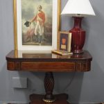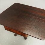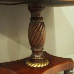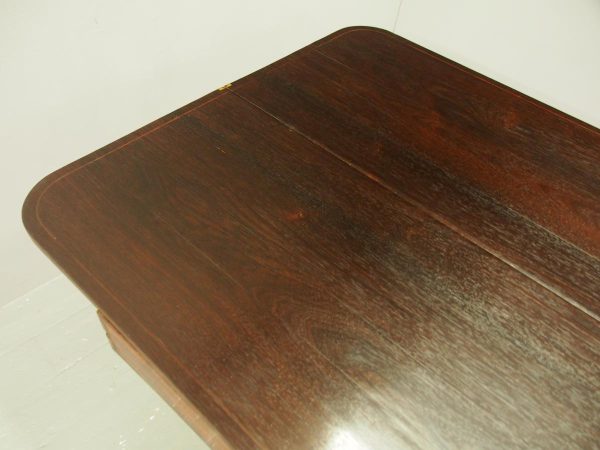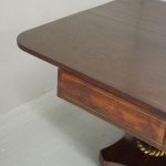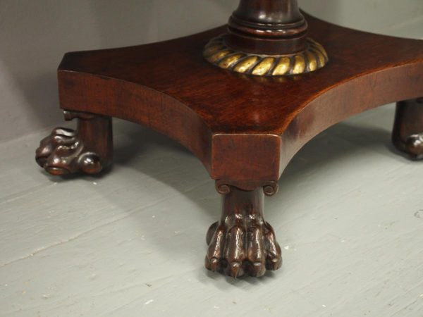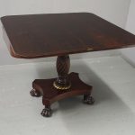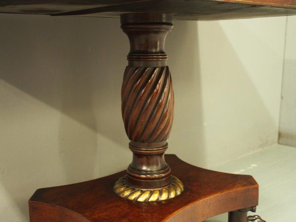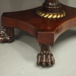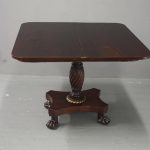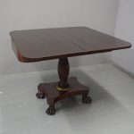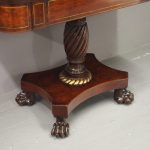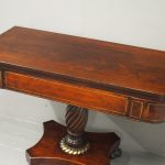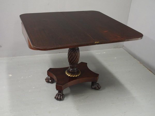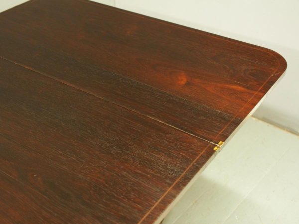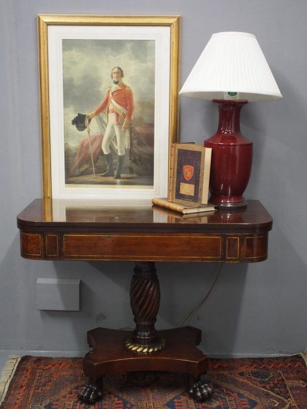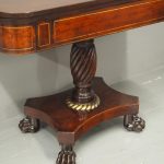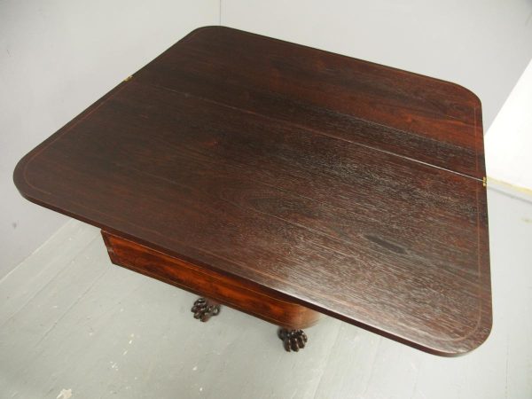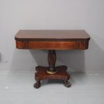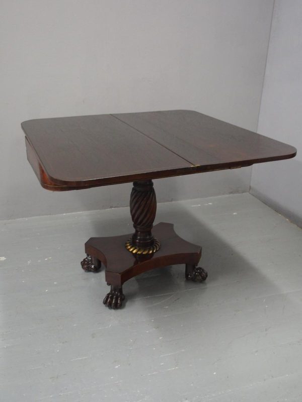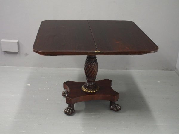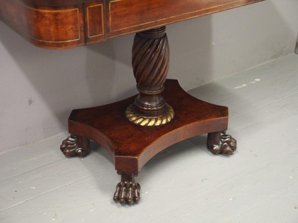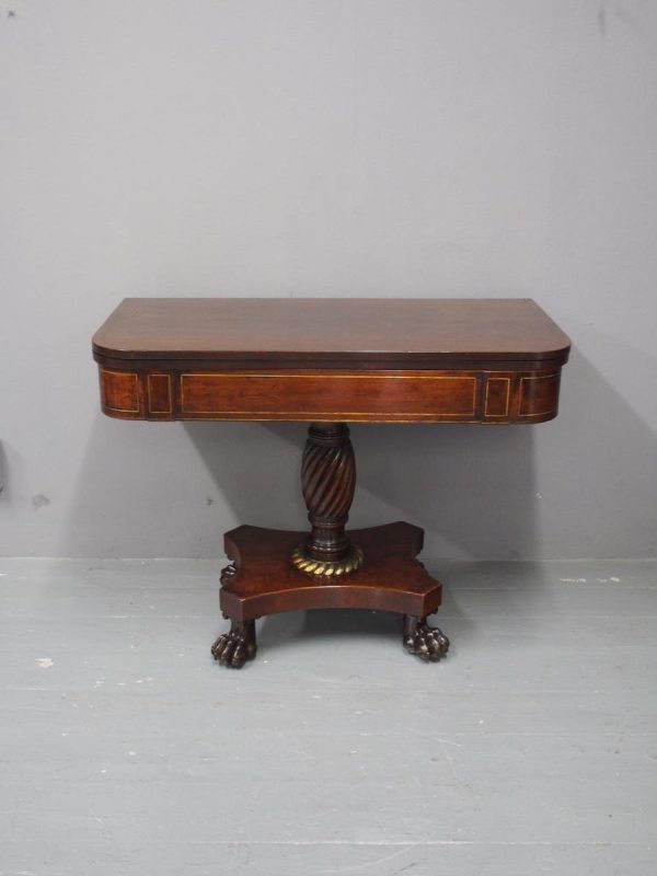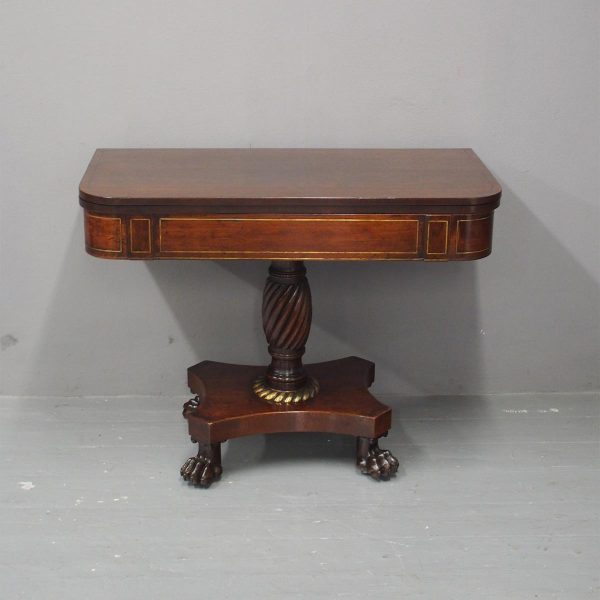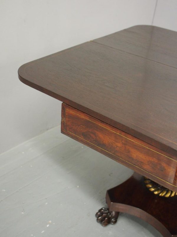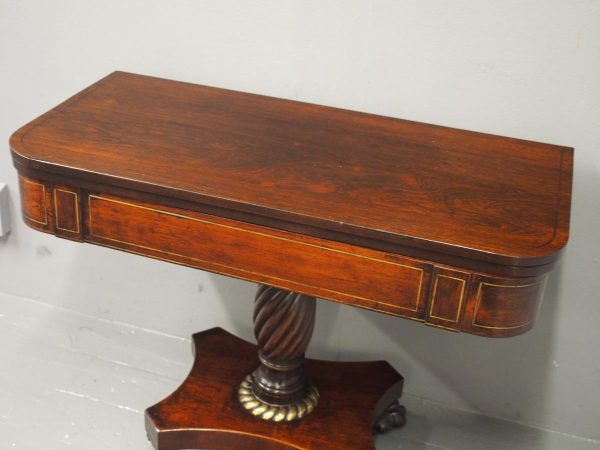 Circa 1815, Regency rosewood and brass inlaid foldover card table. With rounded front, deep apron and supported on a turned and fluted column. With brass gilding to the base and standing on a raised platform with canted corners. Beneath are 4 well carved, realistic animal feet.