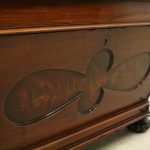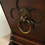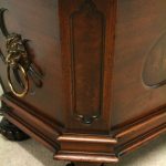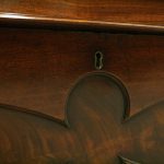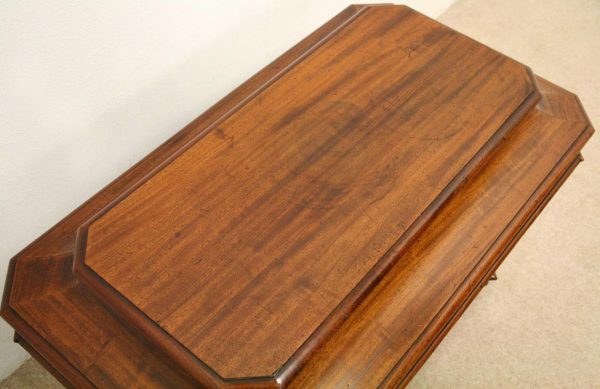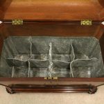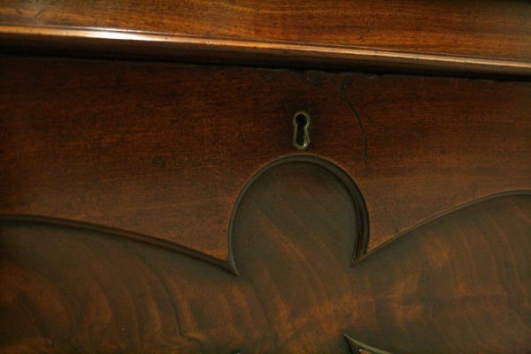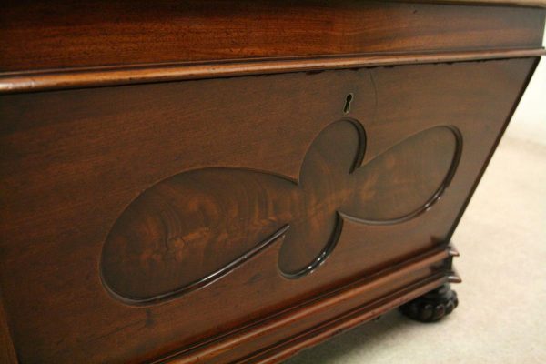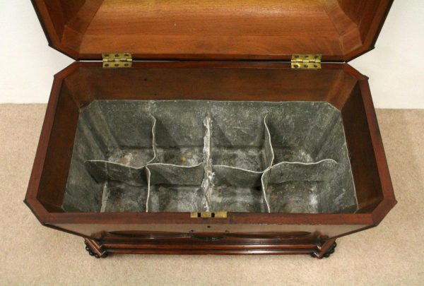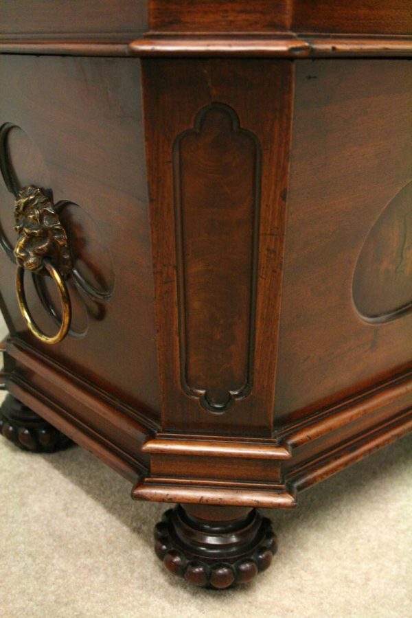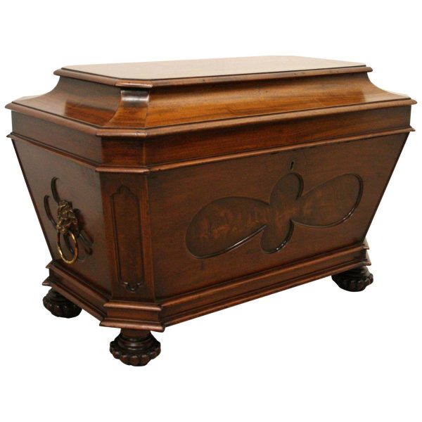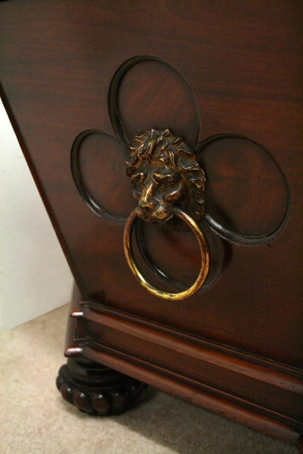 Circa 1810, Regency sarcophagus mahogany wine cooler, in finest quality Spanish mahogany with lovely original colour and patina. The canted corners have shaped Gothic panels of figured mahogany, and there are similar shaped inset panels to front and sides. On either side are lion mask ring carrying handles, and all stands on elaborate turned feet with carved beading. Inside is the original lead liner.