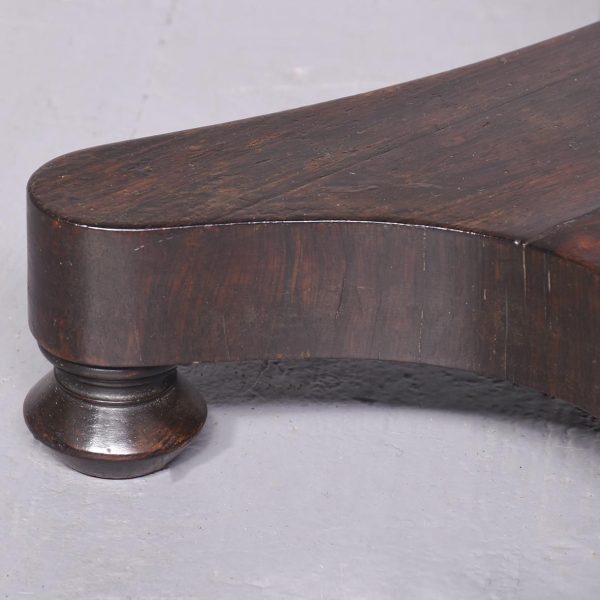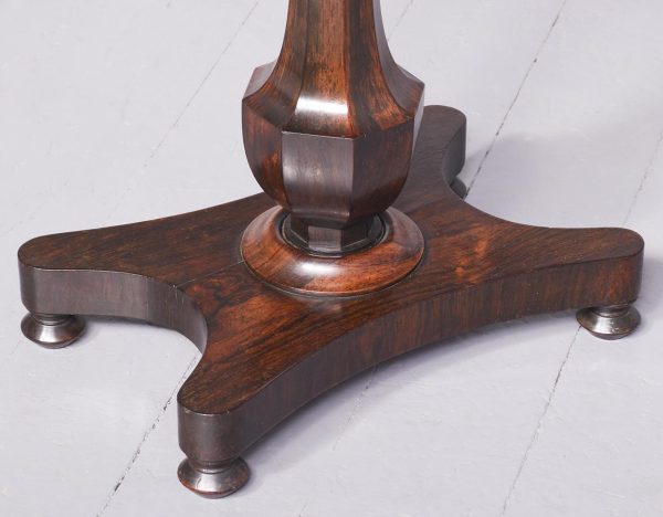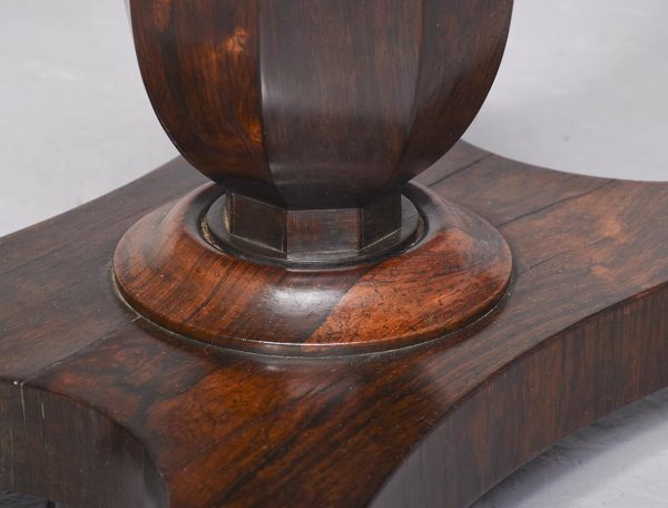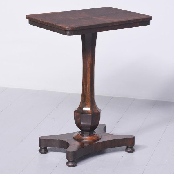 Circa 1825. A good George IV rosewood occasional table, the rectangular top in finely figured rosewood with a simple fore-edge and narrow frieze. The table is supported on a tapering faceted stem with a bulbous urn shaped towards the base with a rosewood collar beneath. All resting on a concave quadrilateral platform base with four squat bun feet beneath.