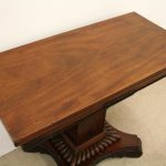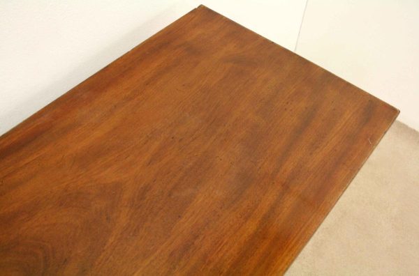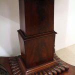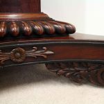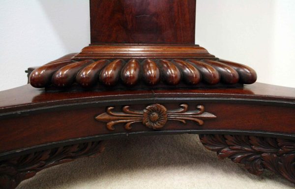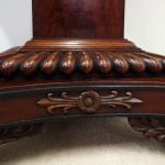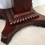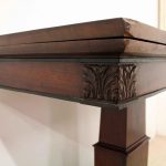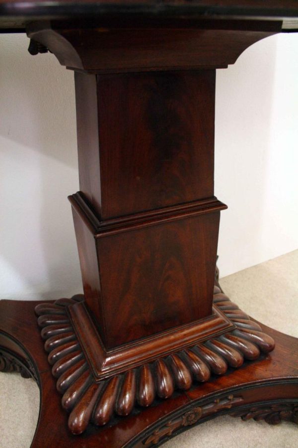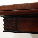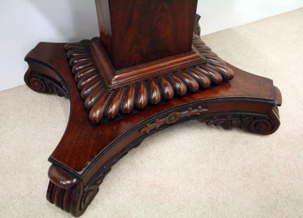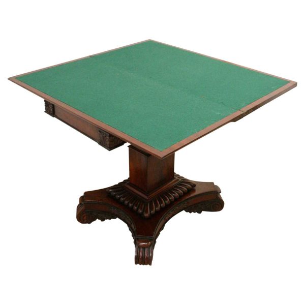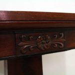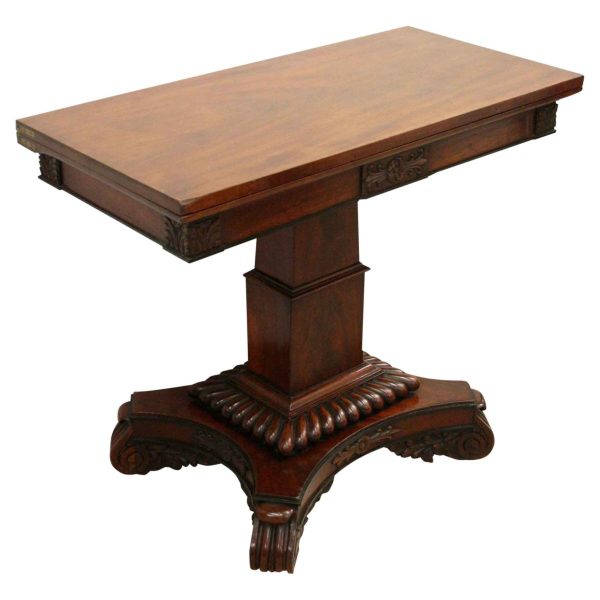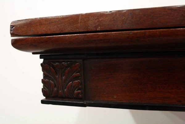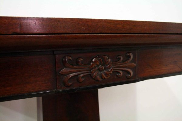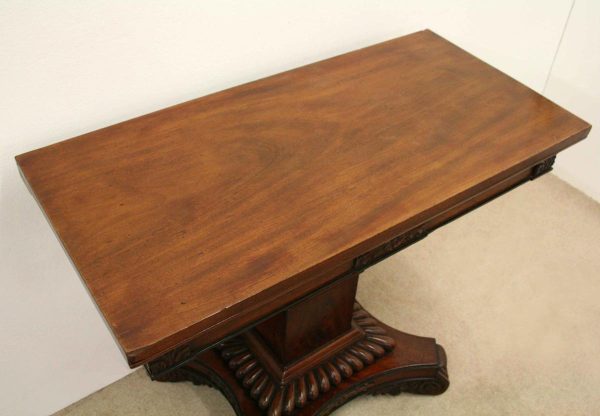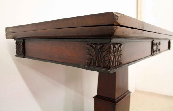 Circa 1830, late George IV mahogany fold over card table. The rectangular top has a flat fore edge, and is hinged at the back, opening to reveal a baize lined interior. The top swivels and there is a small opening beneath for storing the cards. Beneath the top is an apron with foliate carved sections in the centre and corners. The base is quite robust with two sections. The top section is tapering with a flame mahogany front and double beading in the centre, over a further broader section with a wrap around base of ogee mouldings. From this comes a strong gadrooning, on a platform shaped base with a foliate carving similar to that on the top. This stands on a scrolling foot finishing on a foliate carved quarter bracket. The table has a wonderful architectural look about it and would make a fine side table or card table.
