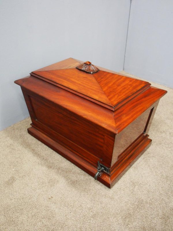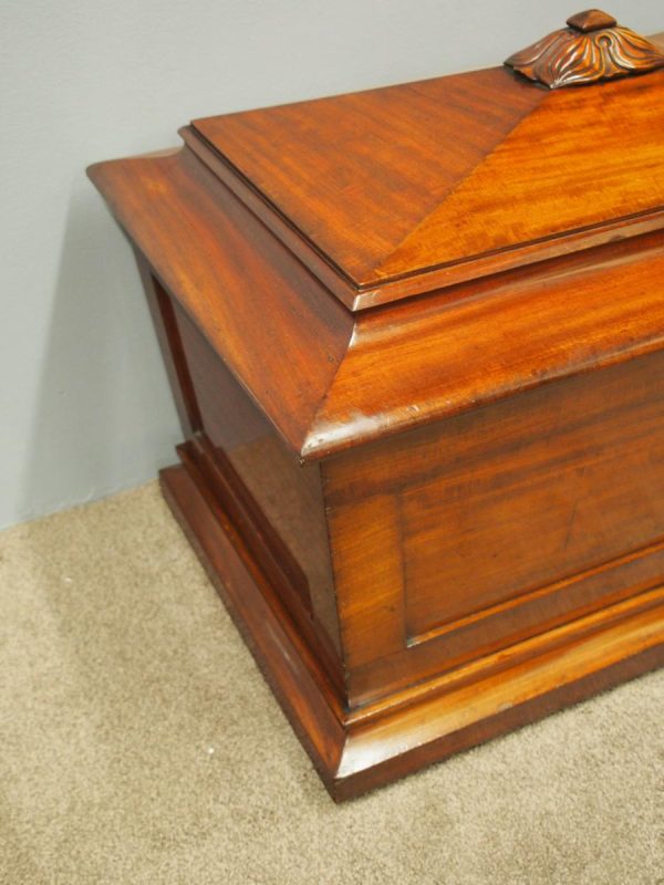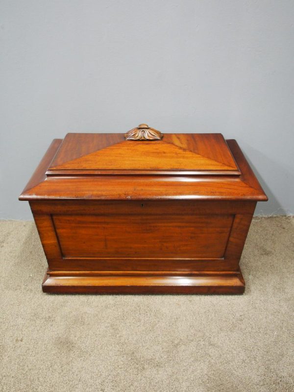Circa 1830, large William IV mahogany cellarette. The pagoda shaped top with moulded edges, surmounted by an elaborate foliate carving. It has panelled sides with an original brass drainage tap to the rear. It has a moulded plinth base with hidden porcelain castors, and its original lead lined interior.