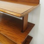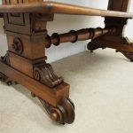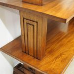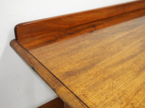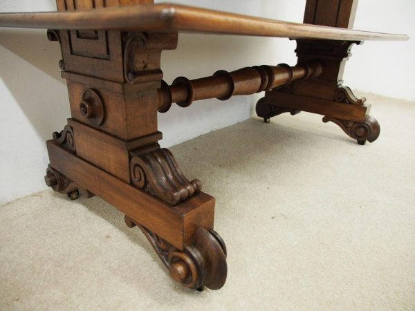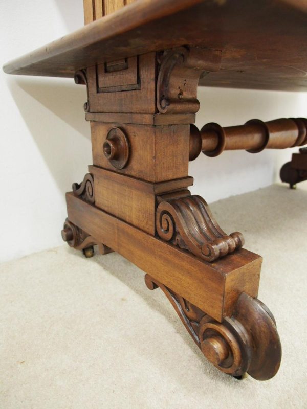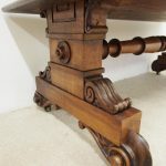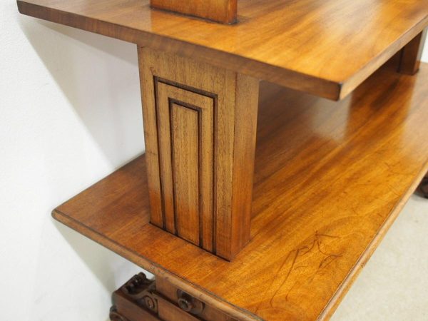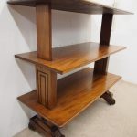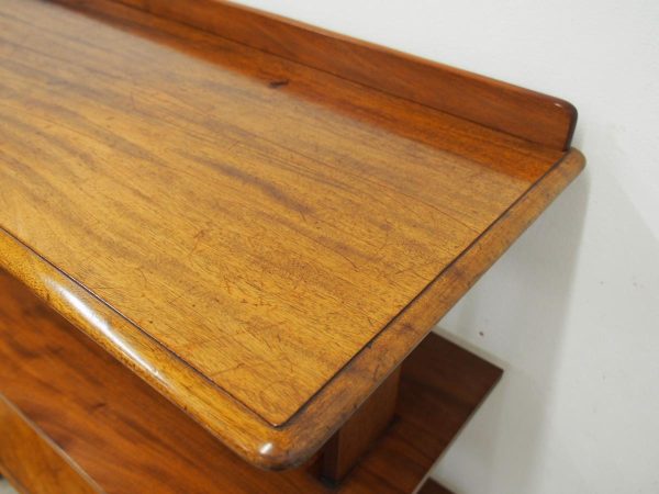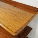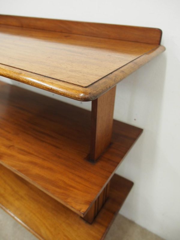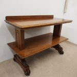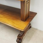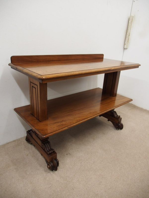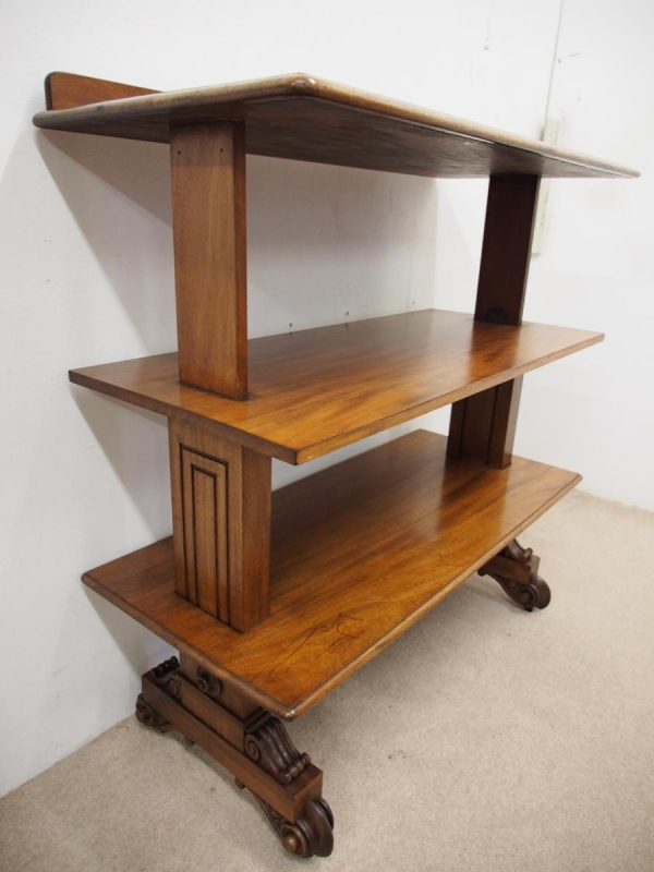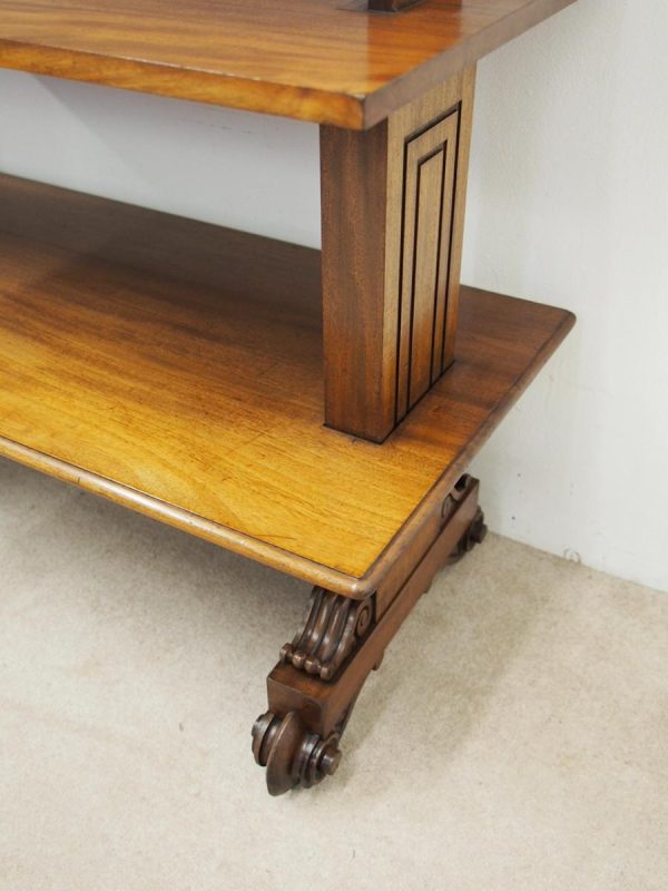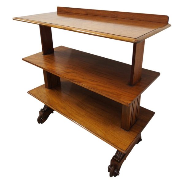 Circa 1840, William IV, three-tier adjustable dumbwaiter. With rounded mouldings to the top and bottom tiers, and square mouldings on the centre tier (it becomes hidden when the dumb waiter is folded down). It is supported at the sides by rectangular fluted pedestals and standing on trestle supports with carved corbels and scrolled feet.