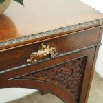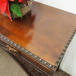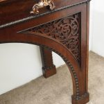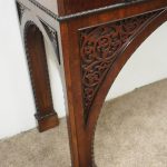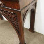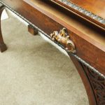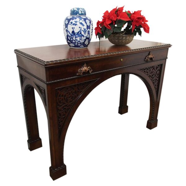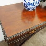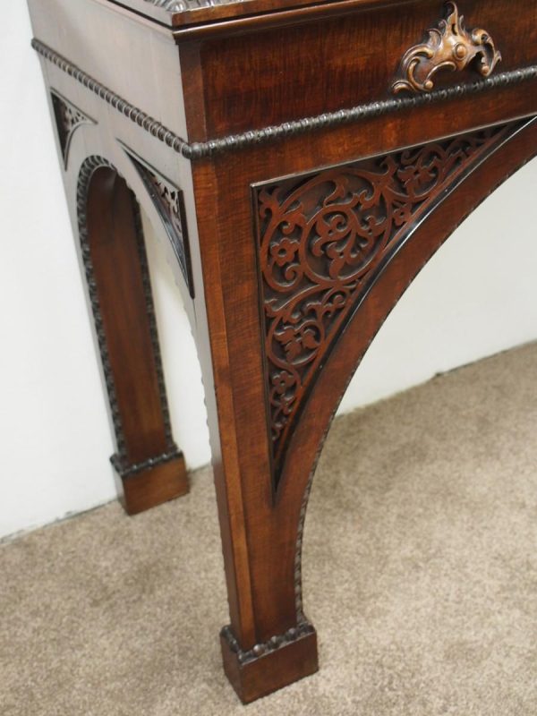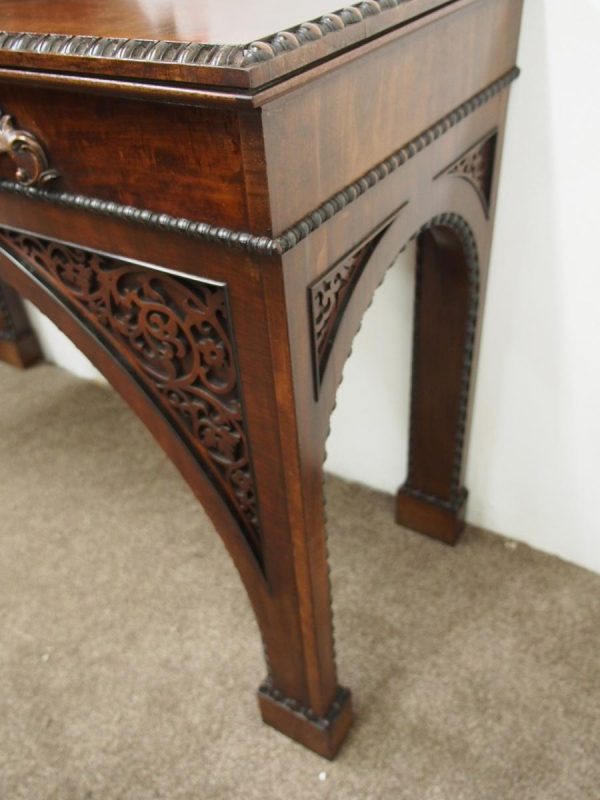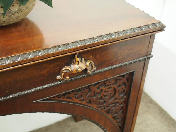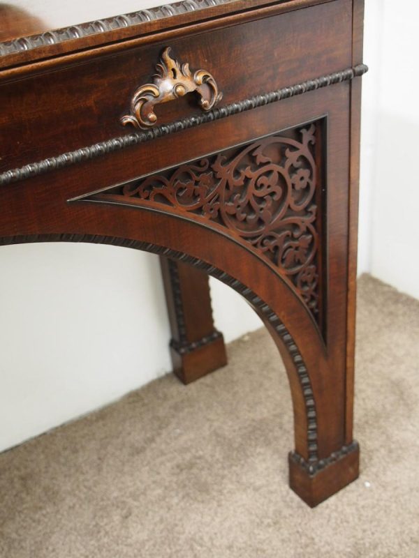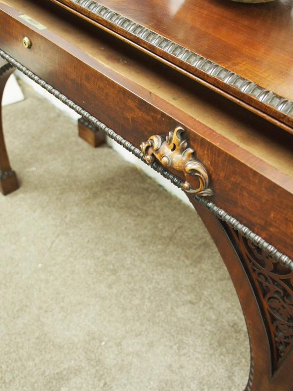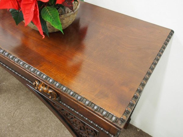 Circa 1830, William IV hall or serving table in fiddle back mahogany. The rectangular top has a carved egg and dart beaded fore-edge, and sits over a long frieze drawer with foliate carved handles and beading. It is all supported on unusual arched legs with a beaded rim and blind fret foliate panels.