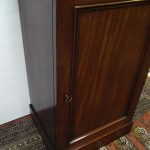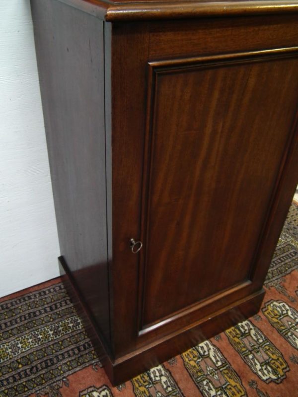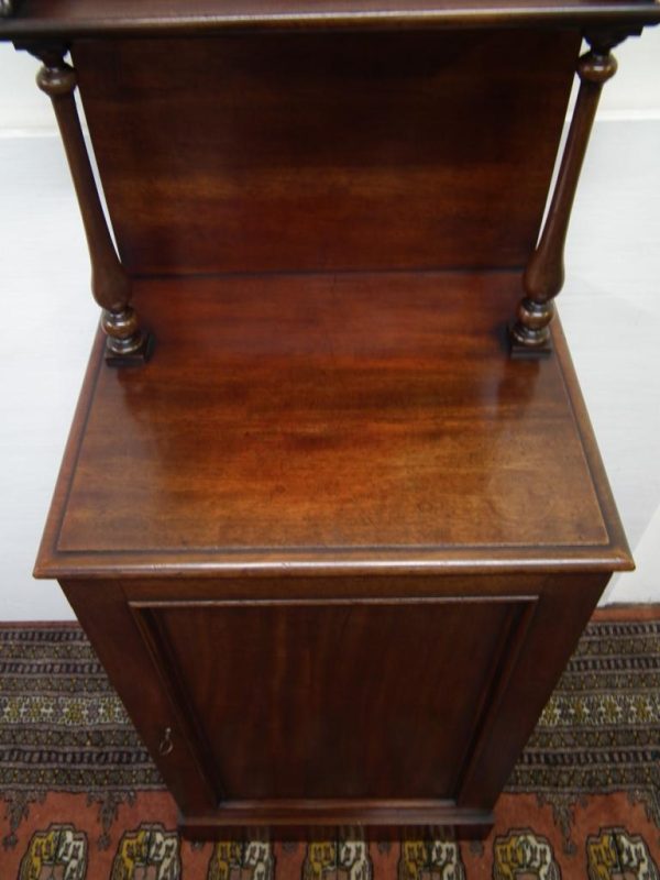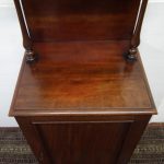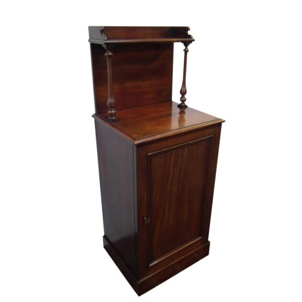 Circa 1840, early Victorian single door ledge back chiffonier/cabinet. The top shelf with three quarter gallery is supported by 2 stylish turned columns, below the single panel door opens to reveal 3 adjustable shelves, all standing on an enclosed plinth.