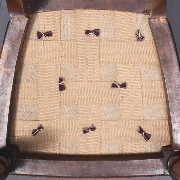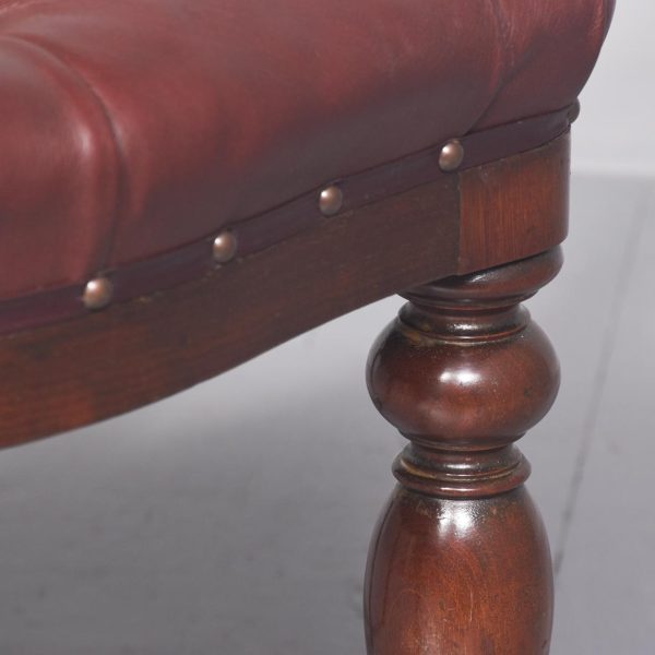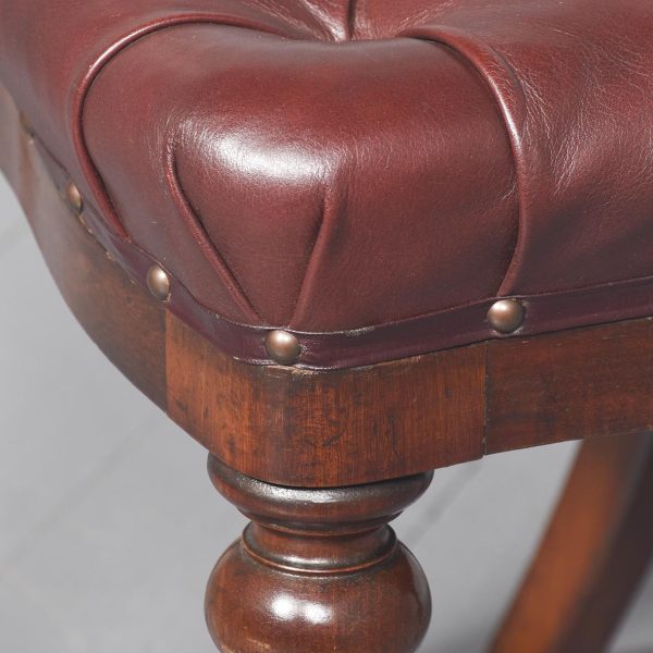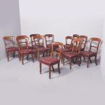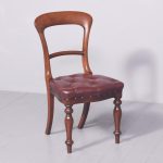 Circa 1850. Quality set of early Victorian mahogany dining chairs. The set of 12 side chairs with a curved shaped top r with a shaped back beneath. Each of the chairs is upholstered in burgundy leather, deep buttoned and pleated fixed on a simple seat rail, back legs are slightly out swept, front legs are turned and ring turned. All 12 chairs are in excellent condition.