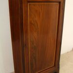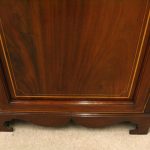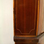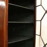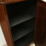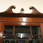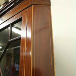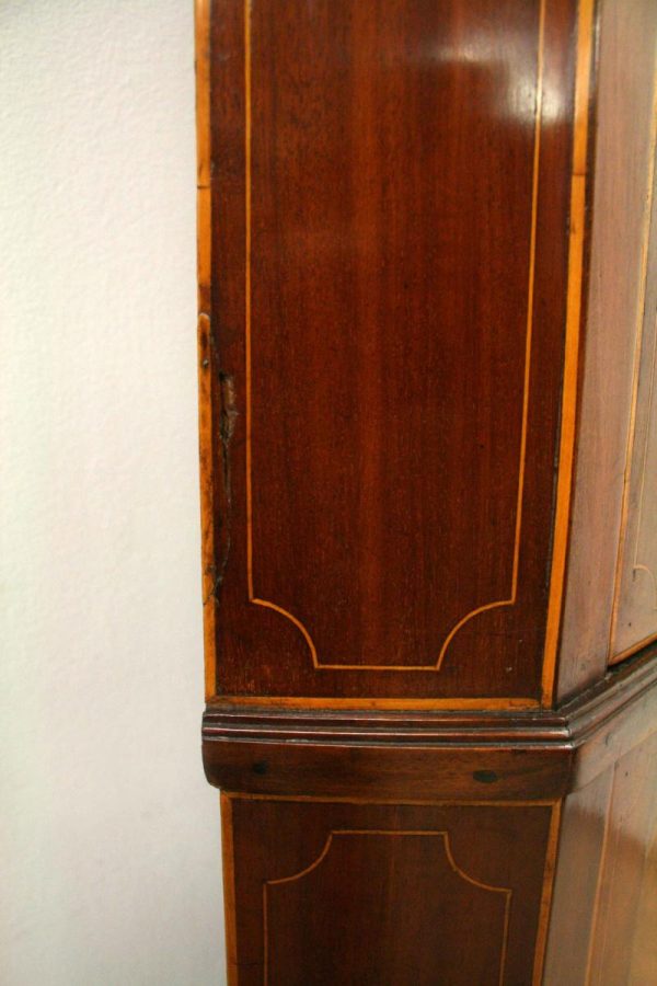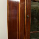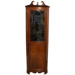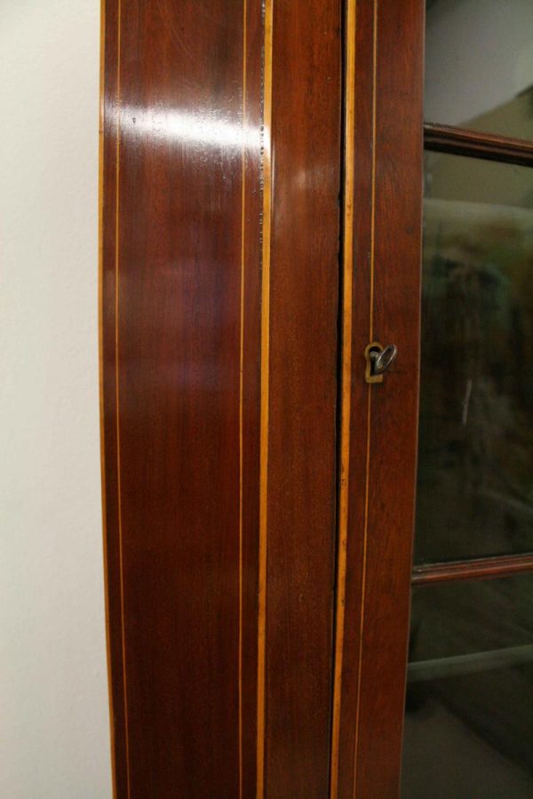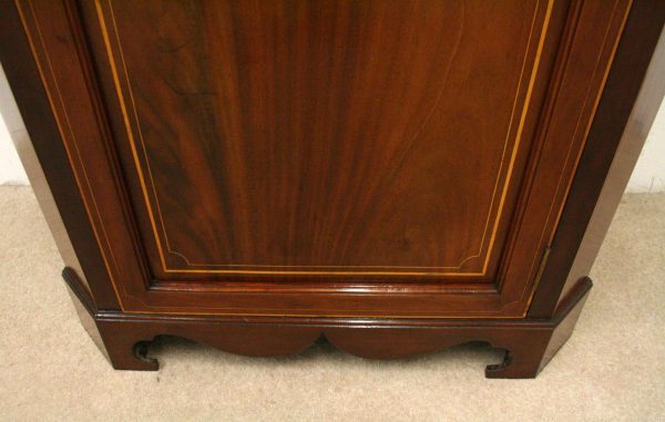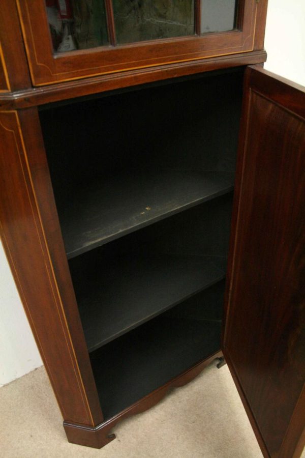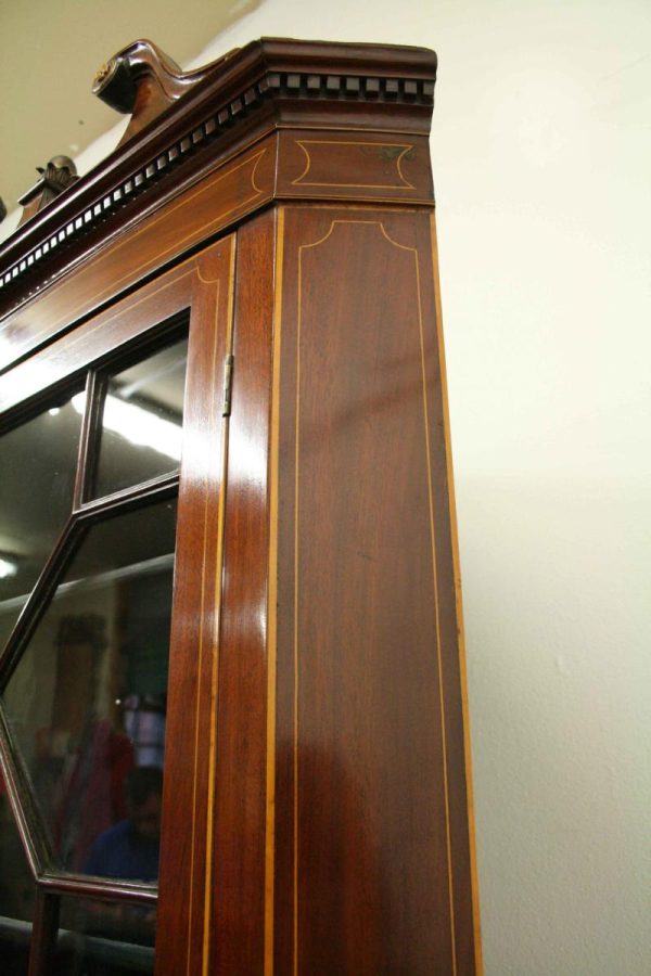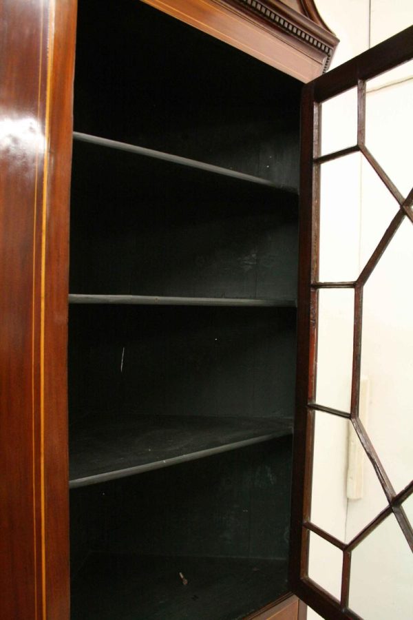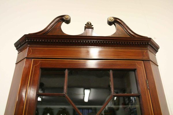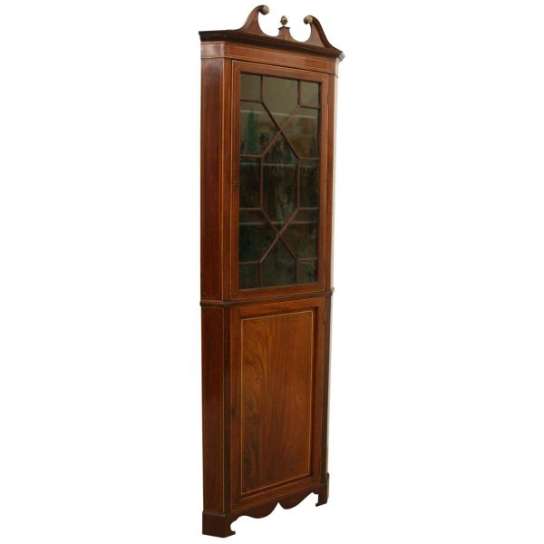 Circa 1880, Georgian style inlaid mahogany two part corner cabinet, in figured Spanish mahogany. The astragal glazed upper section with a dentil cornice, surmounted by a swan neck pediment with brass mounts and an unusual pineapple finial in the centre. The base with an inlaid panelled door, all standing on shaped bracket base.