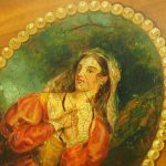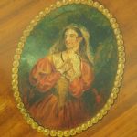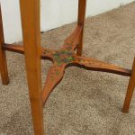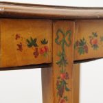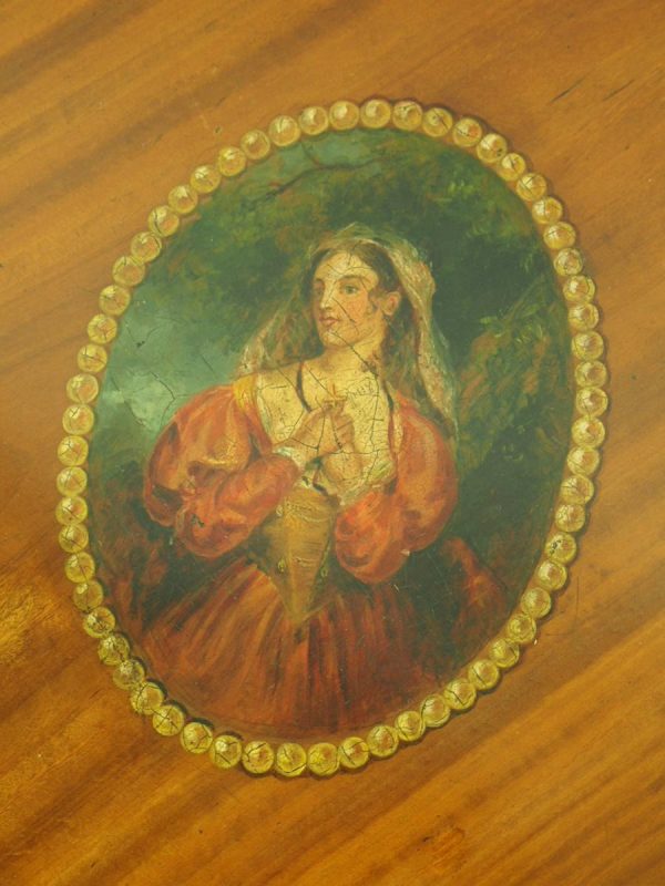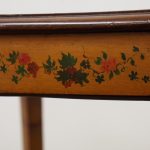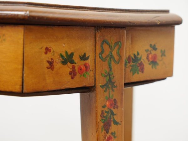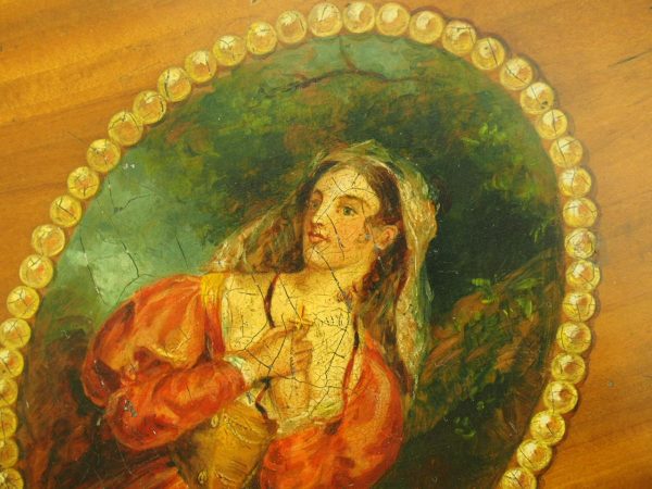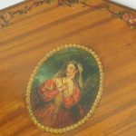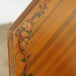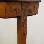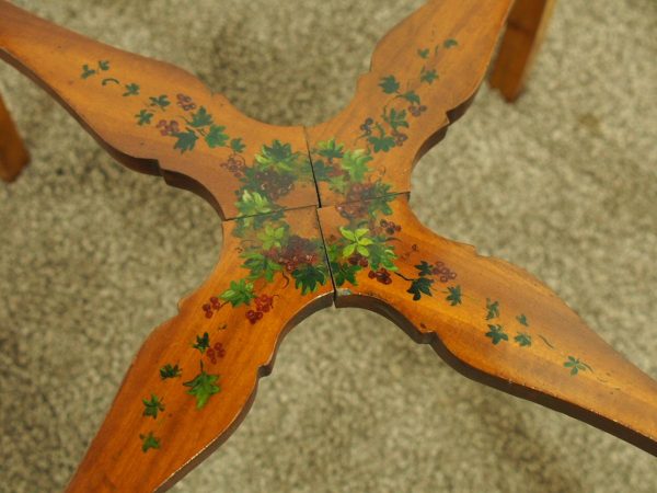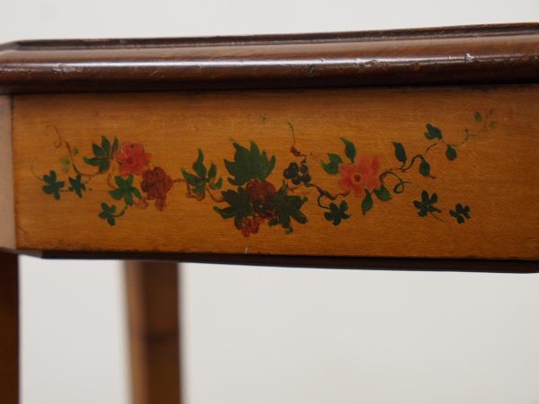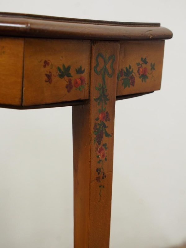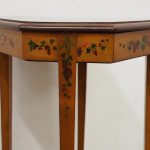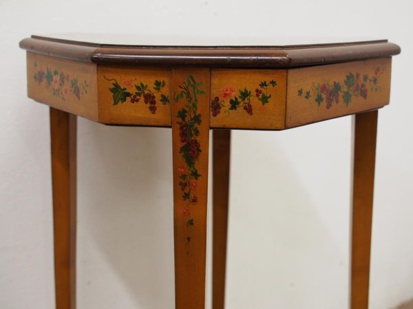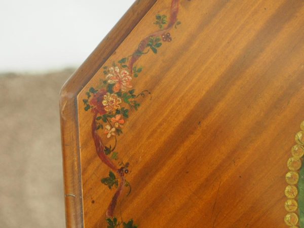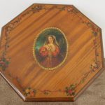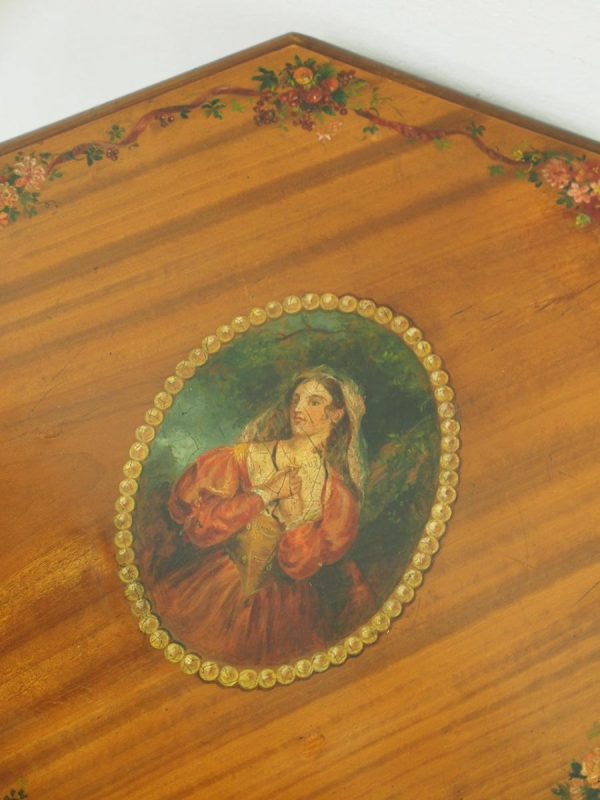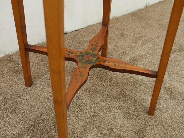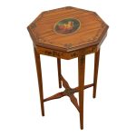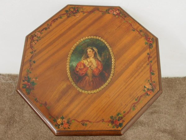 Circa 1880, octagonal satinwood and hand painted occasional table. The top has an oval painted panel in a decorative pearl frame, depicting a woman and the painting continues to a border and frieze with flowers and vines. The flowers continues down the square legs, which are united by a shaped cruciform stretcher.