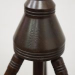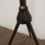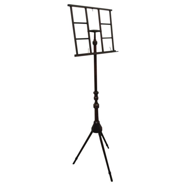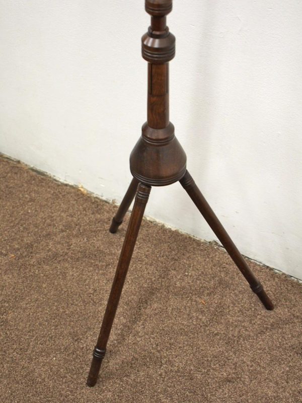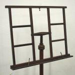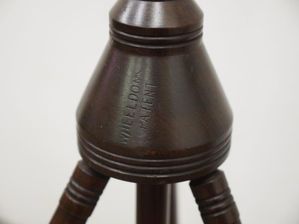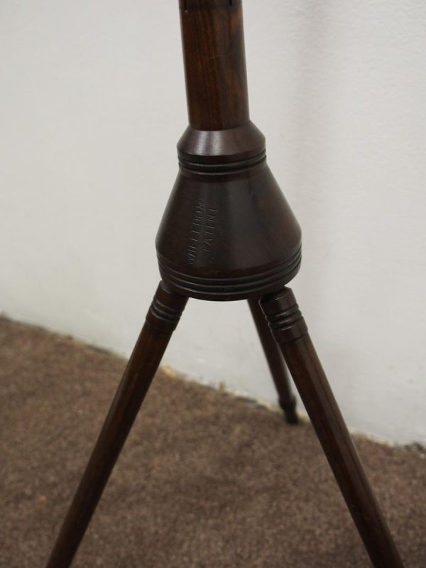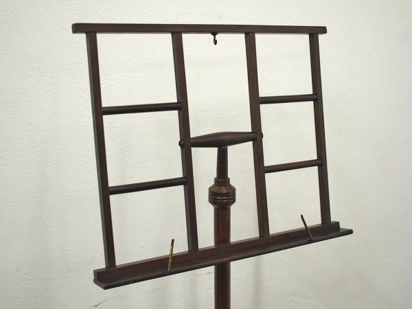 Circa 1890, rare and unusual red walnut adjustable music stand, with ‘Wheeldons’ patent stamped to the base. The top features unusual turned cross stretchers, with brass clasps for holding music, and it has a circular, tapering, adjustable arm to the back. On a flared, circular section with ring turning to the base leading on to three turned, ring turned splayed legs.